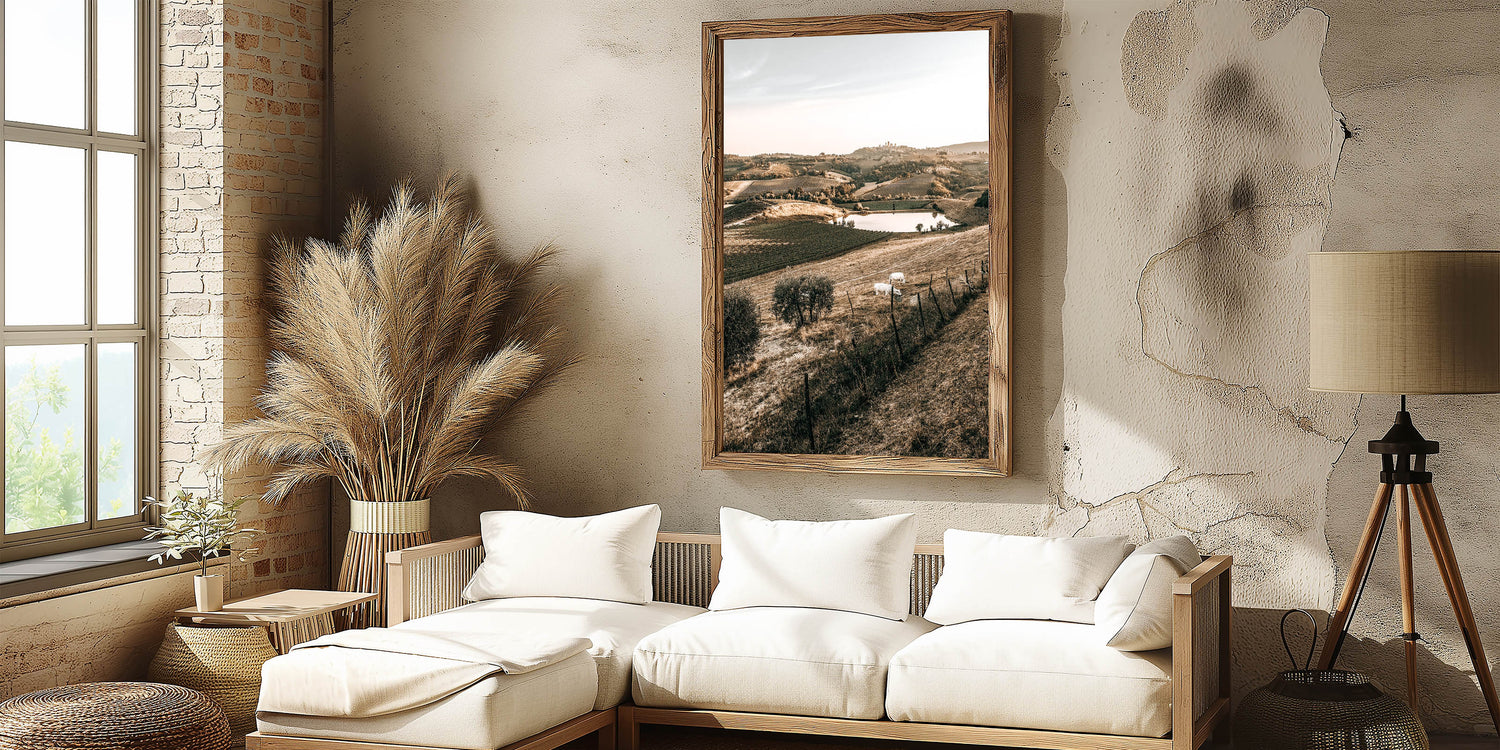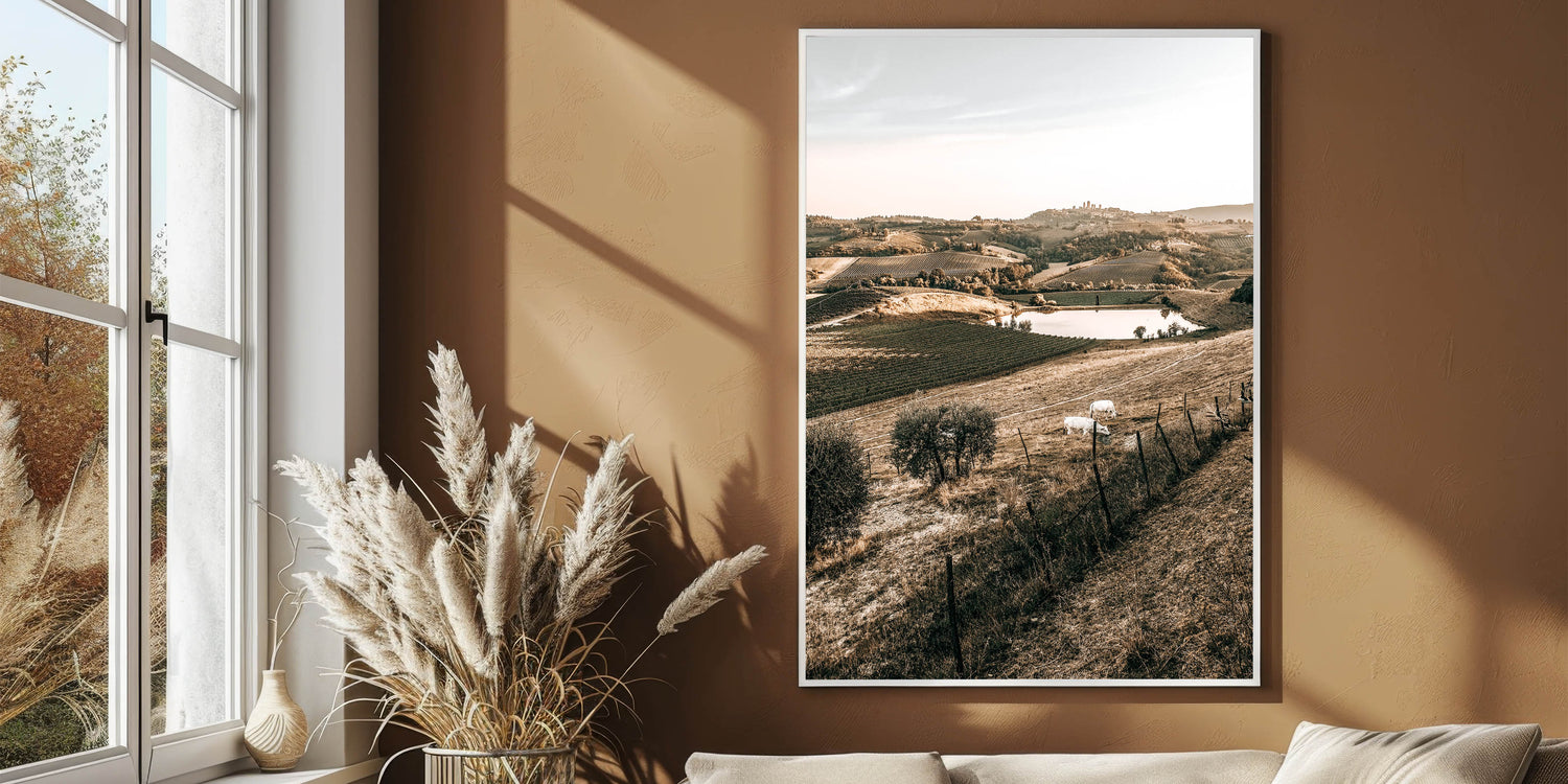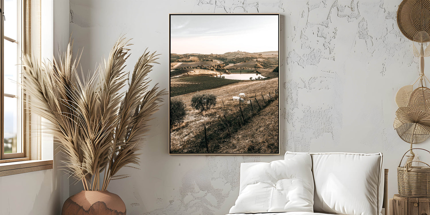 Bring the peaceful beauty of the countryside into your home with this "Scenic Countryside Hills" farmhouse wall art. This stunning print captures the natural charm of rolling hills, distant vineyards, and grazing cows, evoking a sense of calm and tranquility. Perfect for those who appreciate the rustic elegance of rural landscapes, this artwork is ideal for enhancing any farmhouse-style decor in kitchens, living rooms, or bedrooms.