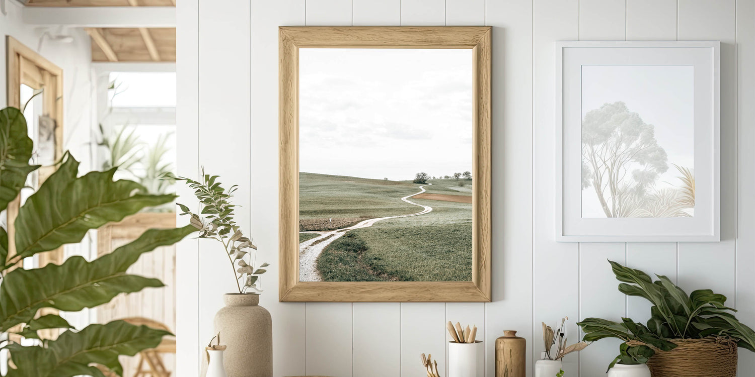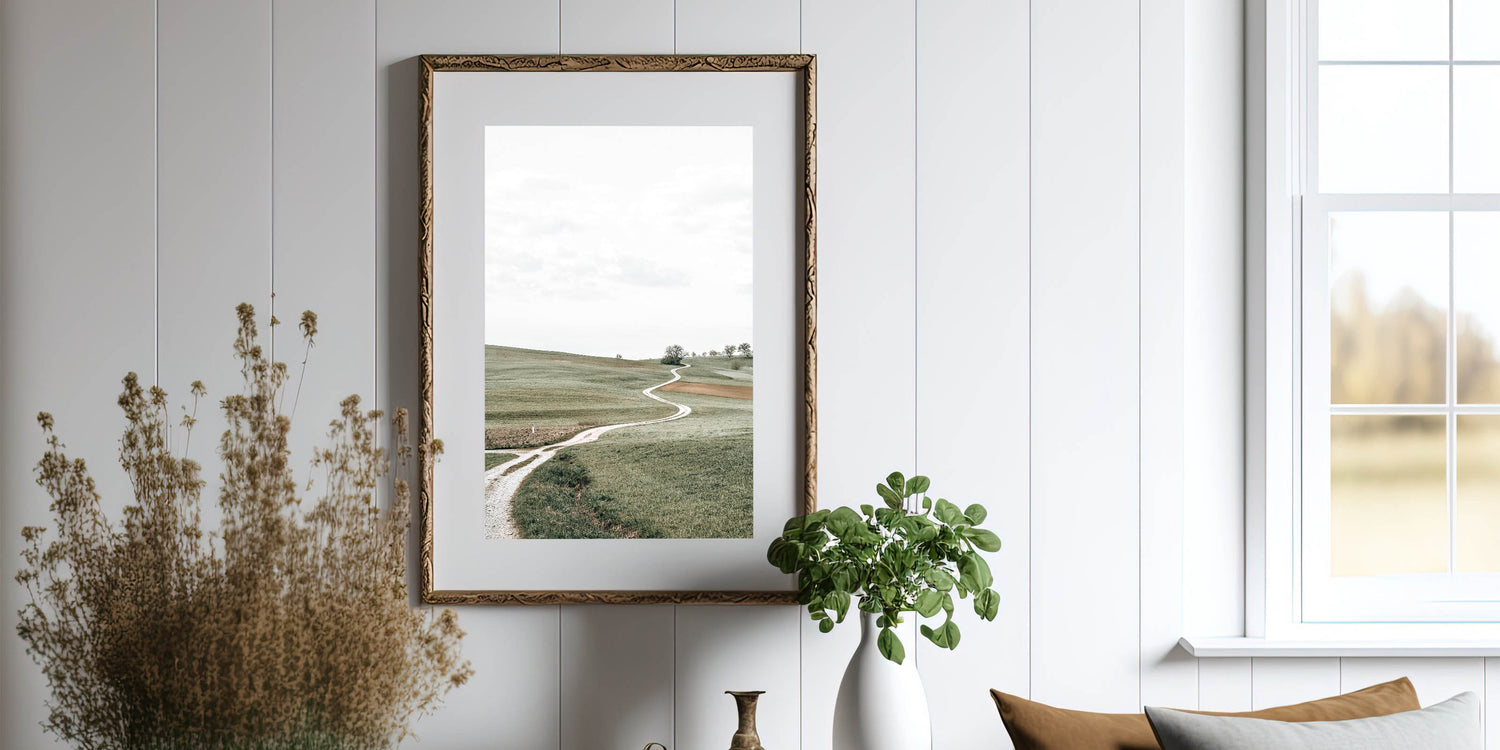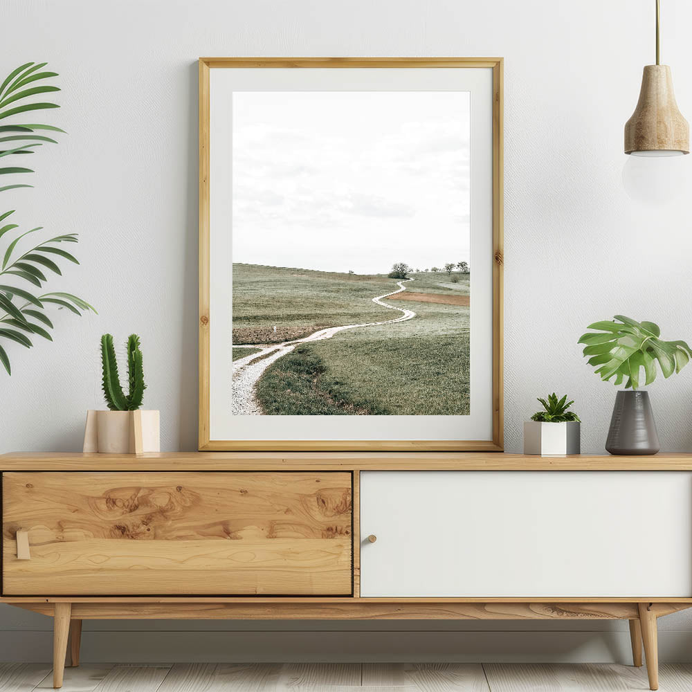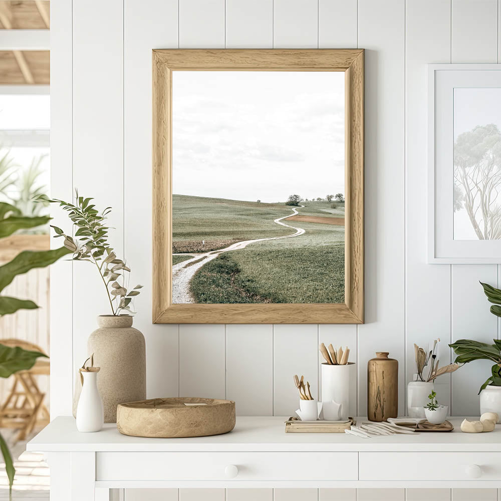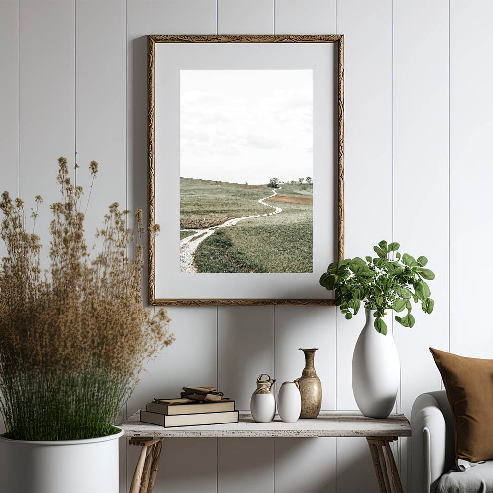 Invite tranquility into your home with this captivating farmhouse wall art featuring a serene winding path through the countryside. This peaceful scene captures the essence of country living style, making it a perfect addition to your rustic farmhouse decor. The soft tones of the rolling hills and distant trees blend beautifully, creating an artwork that adds a sense of calm and contemplation to any space.