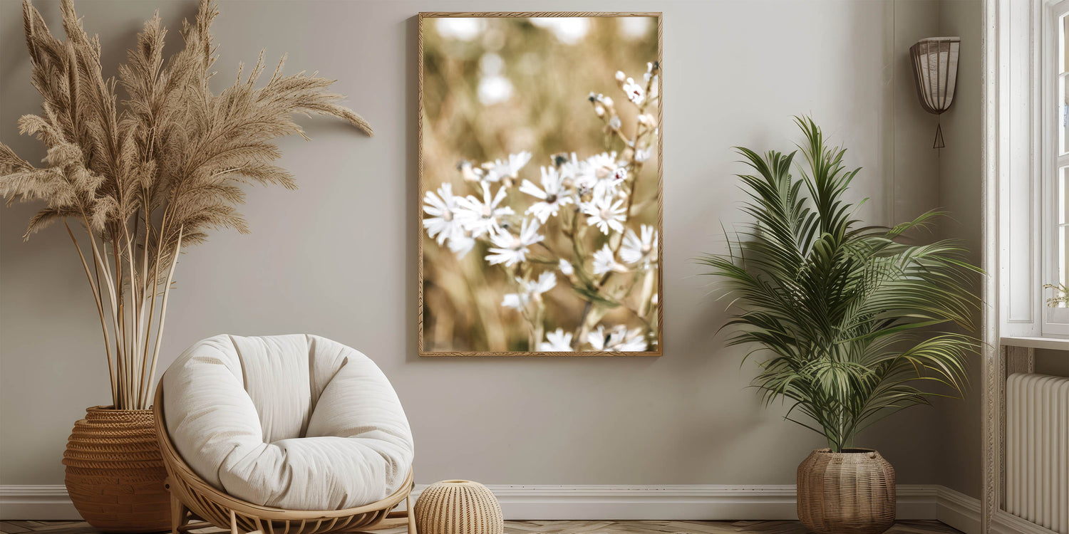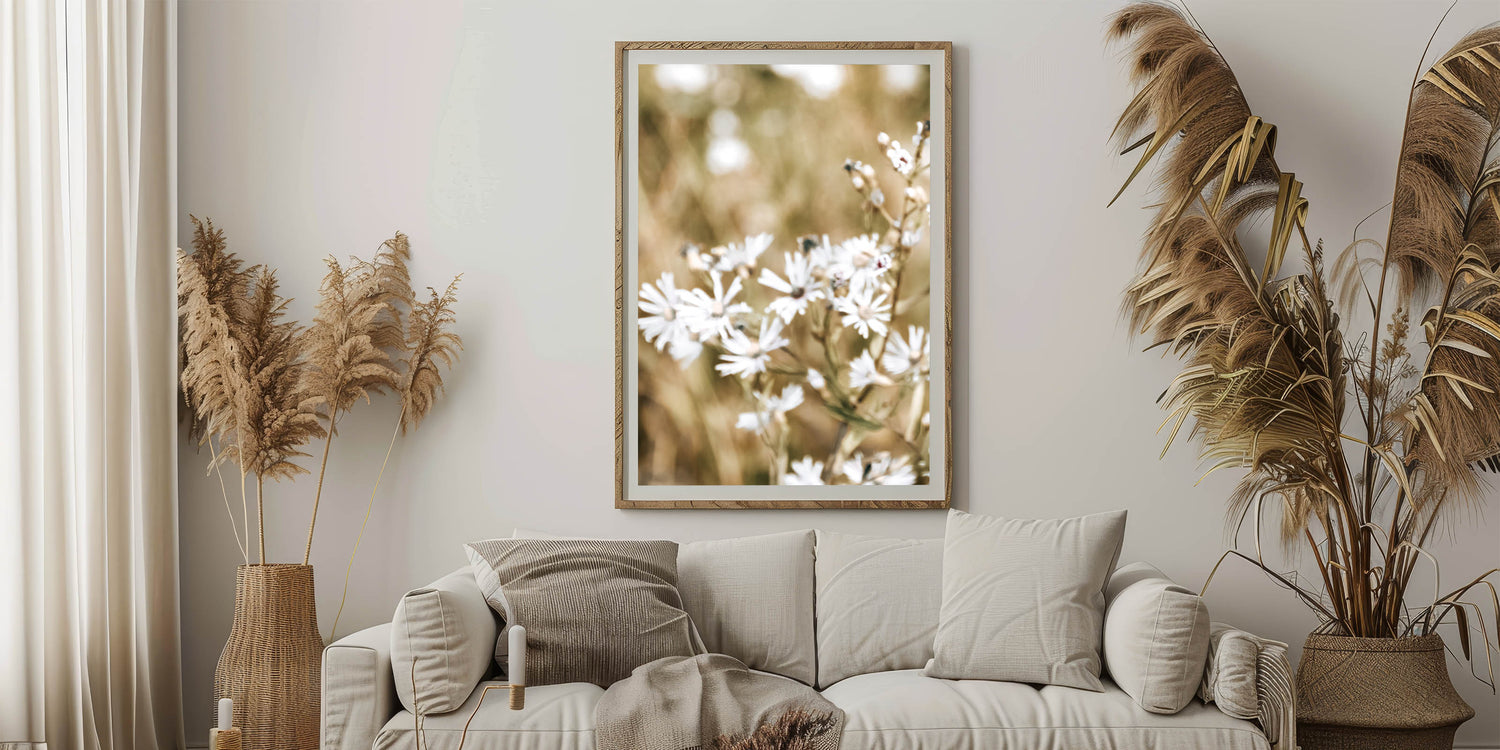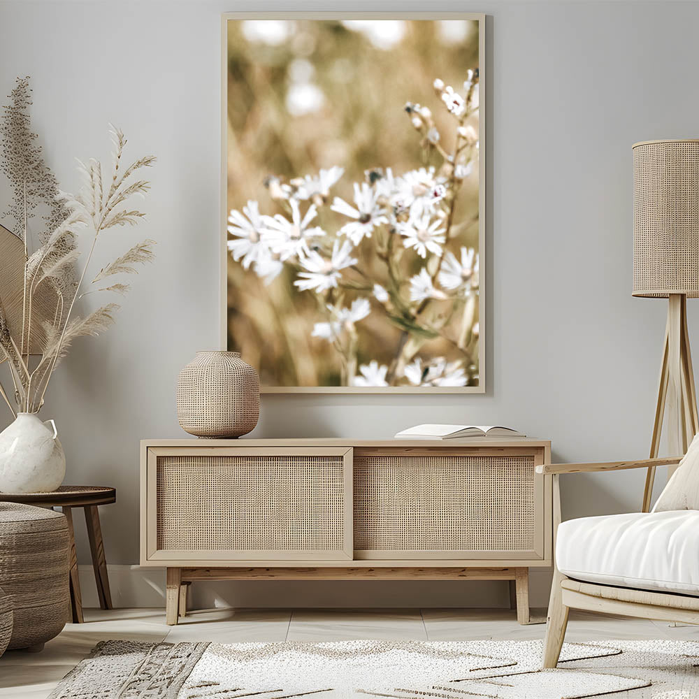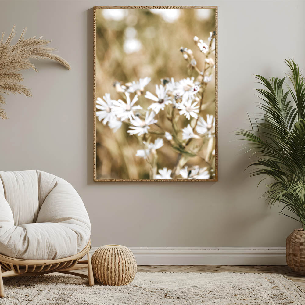 - Depicts a serene floral scene with white daisies, adding a calm and rustic charm to your home.