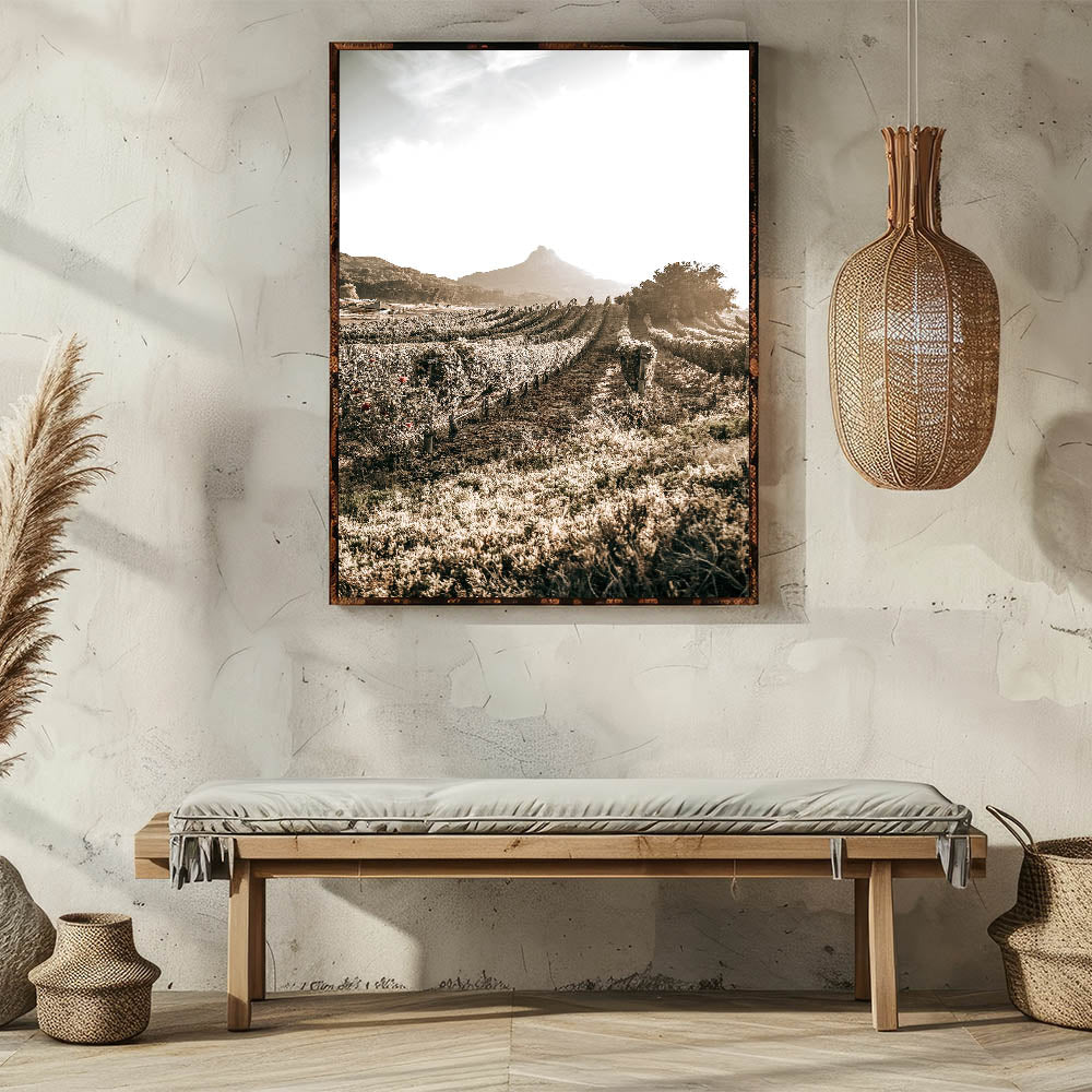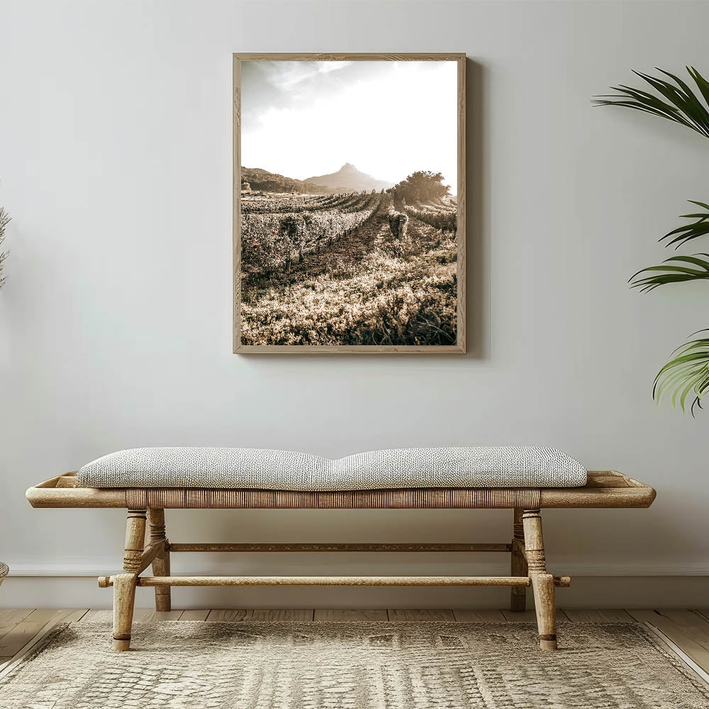 Immerse yourself in the serene beauty of this farmhouse wall art featuring sunlit vineyard rows with a distant mountain backdrop. The rich texture of the vines and the natural sunlight flooding the landscape create a calming atmosphere, perfectly capturing the essence of country living. The muted, vintage-inspired tones of this piece offer an antique farmhouse aesthetic, making it an ideal addition to any rustic home decor.
