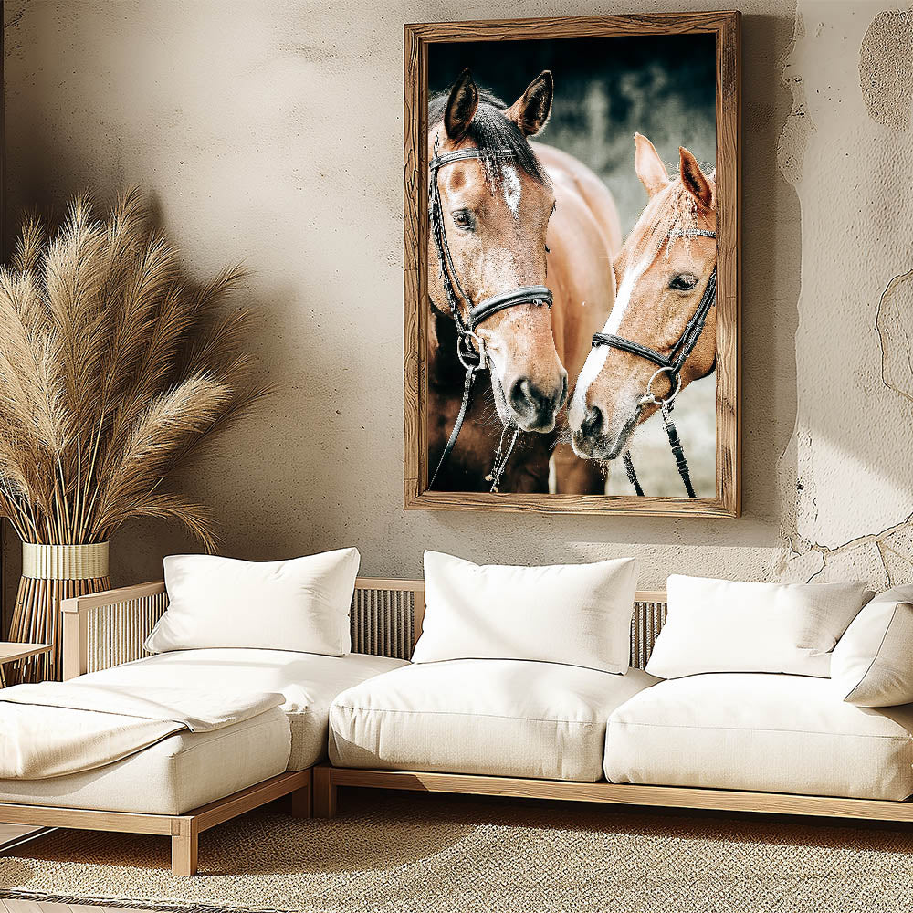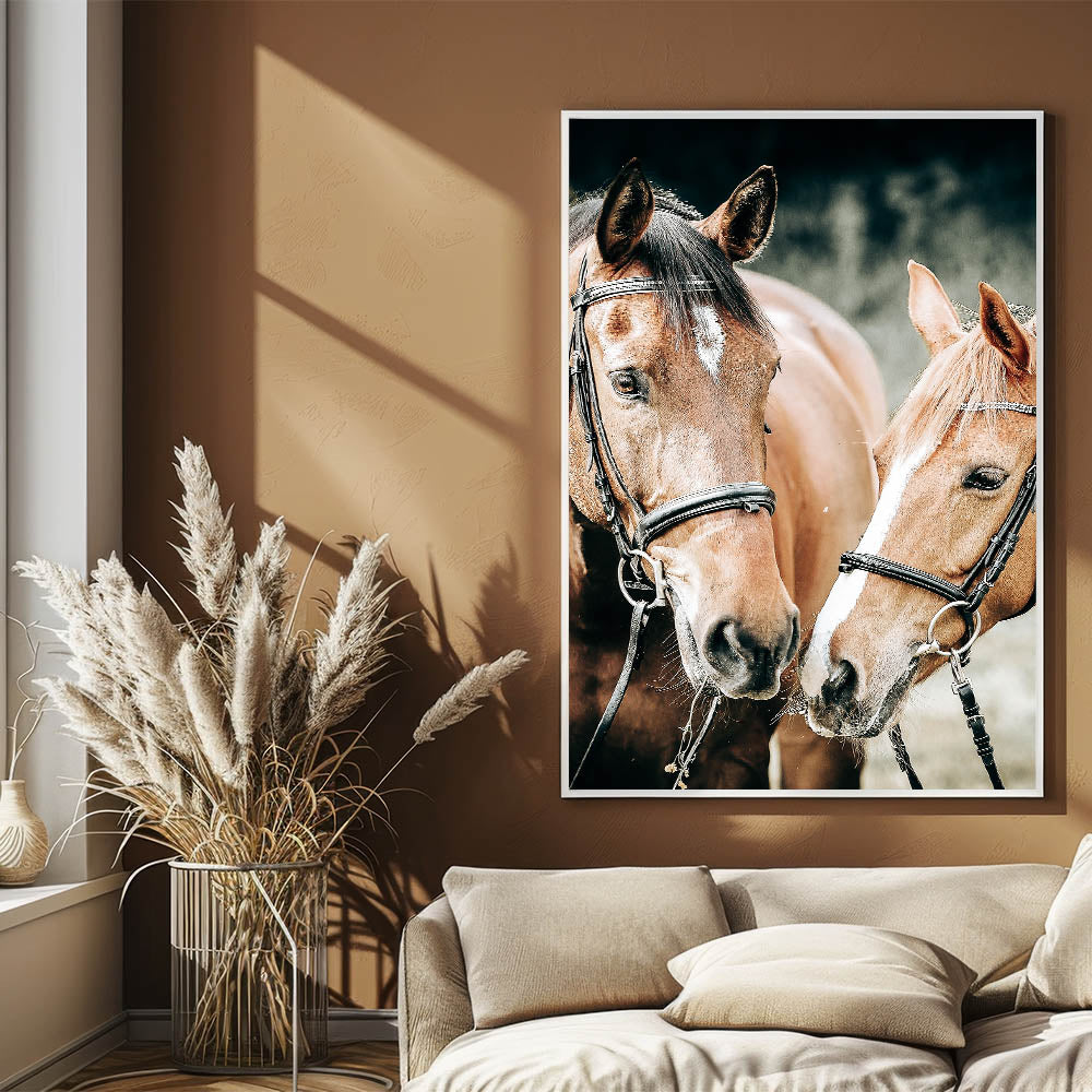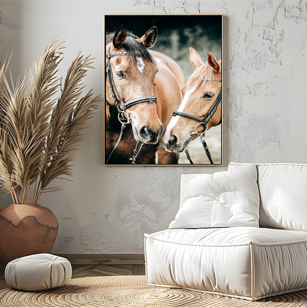 Celebrate the beauty and elegance of horses with this stunning farmhouse wall art featuring two majestic horses in a peaceful moment. Their soft expressions and warm tones evoke a feeling of rustic charm, making this artwork a perfect addition to any country-style or vintage farmhouse decor. The close-up details of the bridles and the horses’ gentle companionship add a touch of authenticity and rural life to your home.