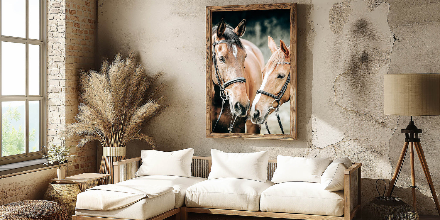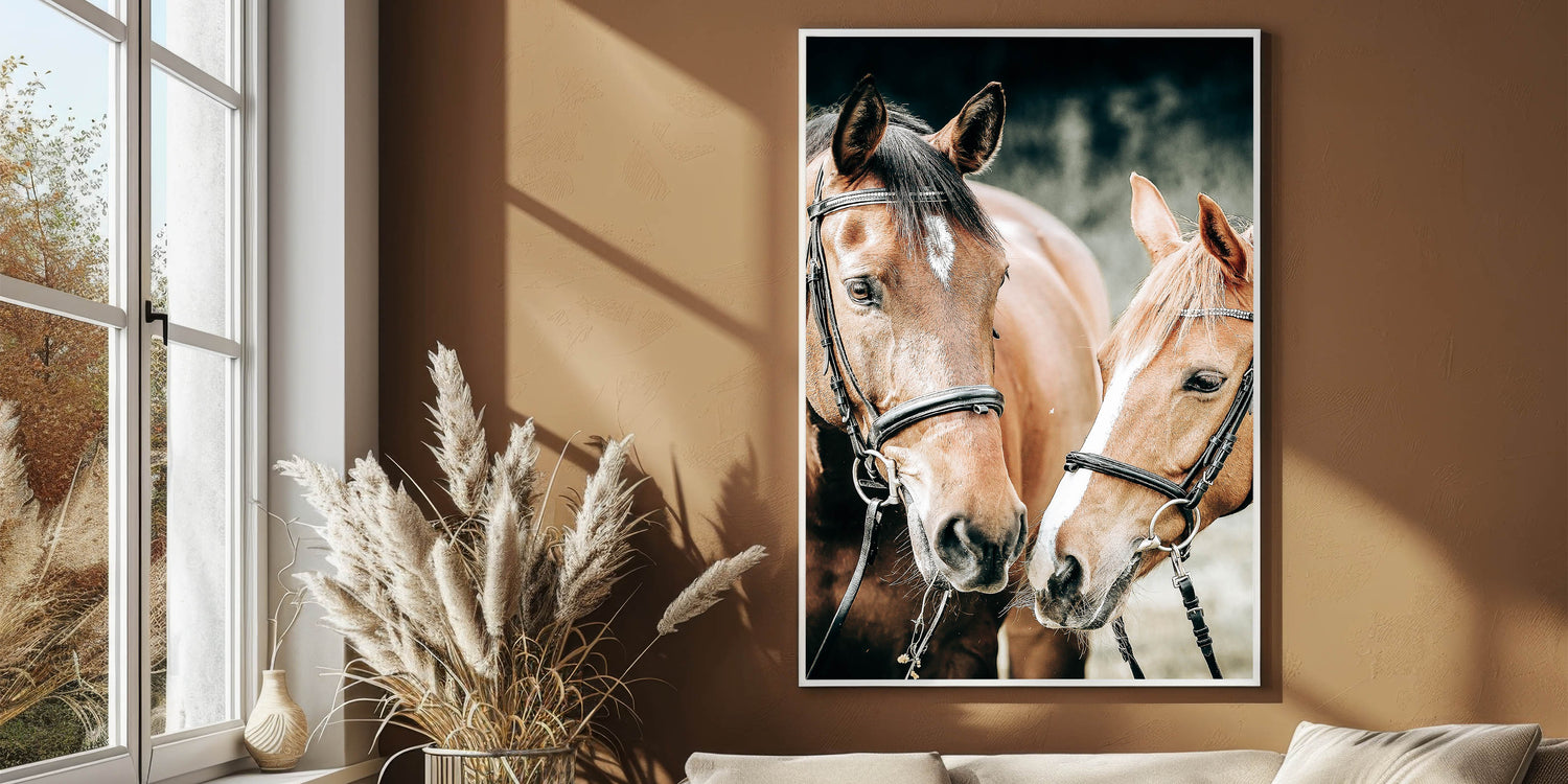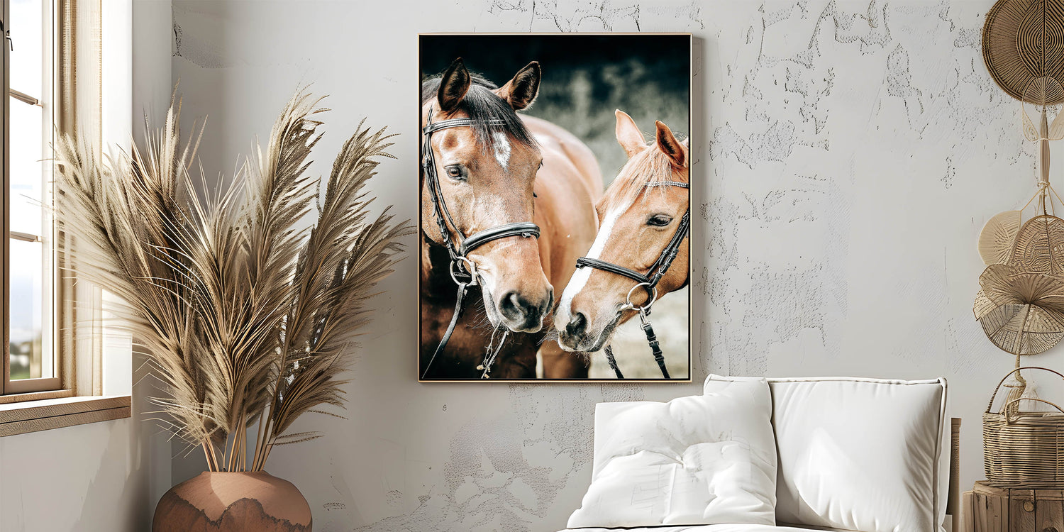 Celebrate the beauty and elegance of horses with this stunning farmhouse wall art featuring two majestic horses in a peaceful moment. Their soft expressions and warm tones evoke a feeling of rustic charm, making this artwork a perfect addition to any country-style or vintage farmhouse decor. The close-up details of the bridles and the horses’ gentle companionship add a touch of authenticity and rural life to your home.