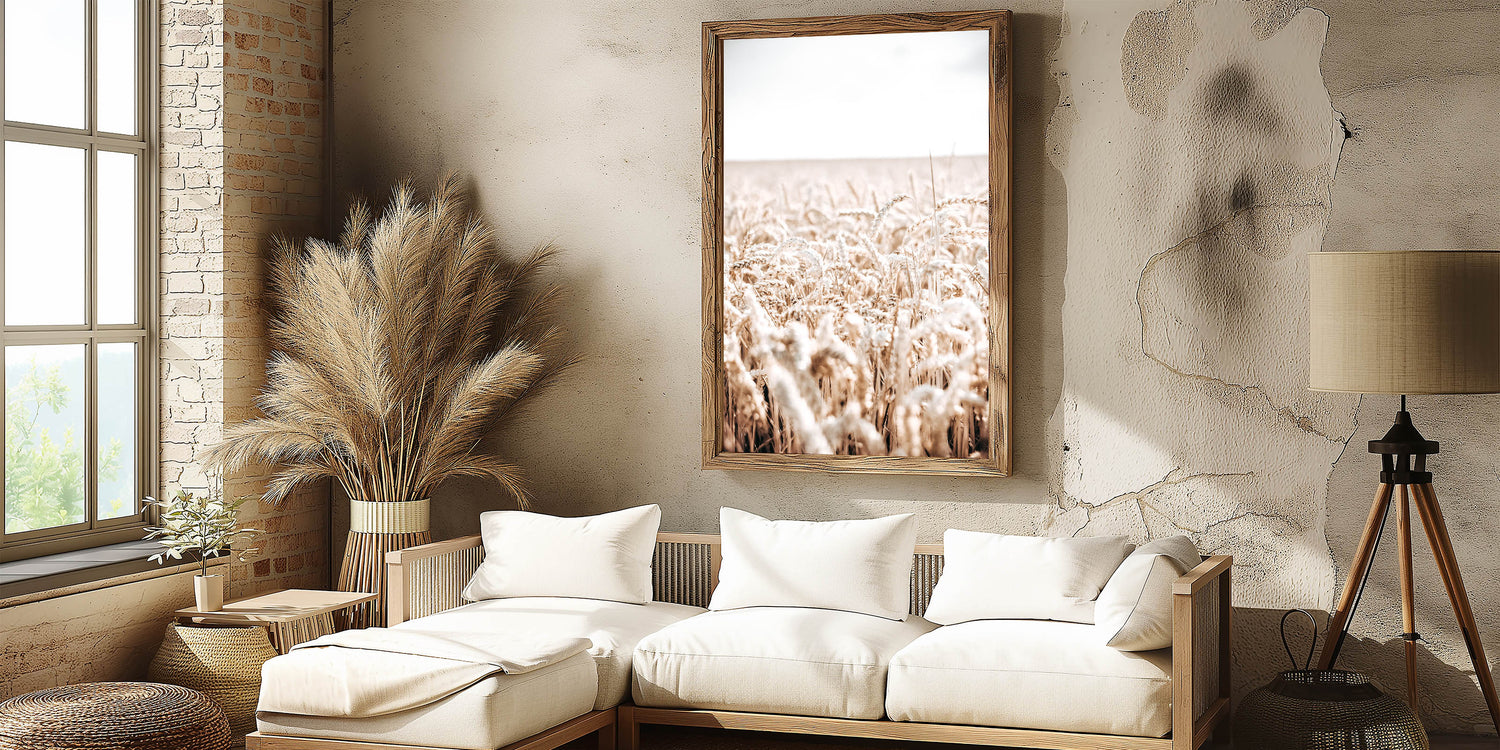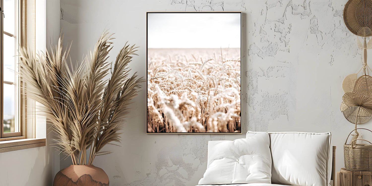 Available in multiple formats, including stretched canvas, framed prints, and acrylic glass, this artwork can be displayed to complement various interiors. The vintage farmhouse aesthetic combined with the calm and serene tones of the wheat field makes this artwork a timeless addition to any farmhouse style wall decor. Let the calming essence of the wheat fields bring a peaceful ambiance into your space.