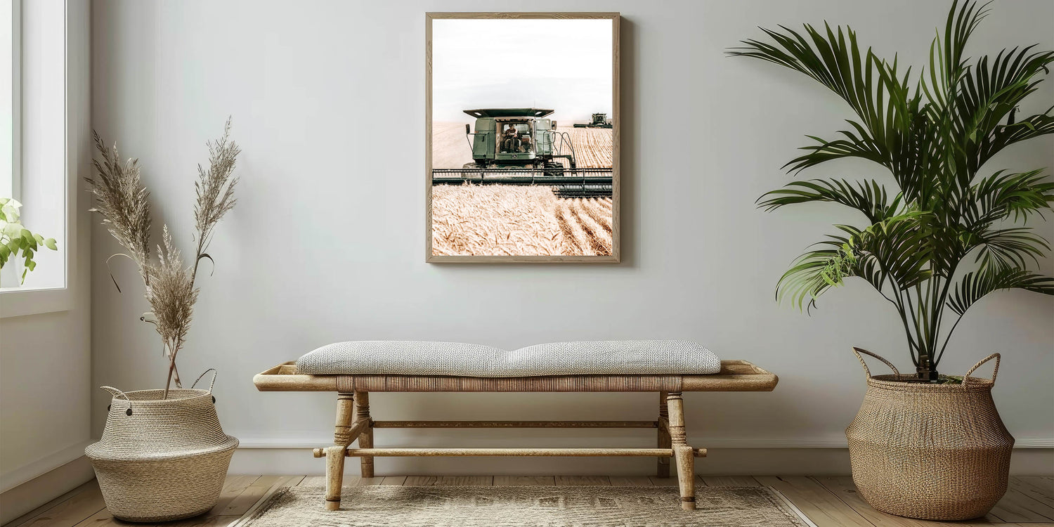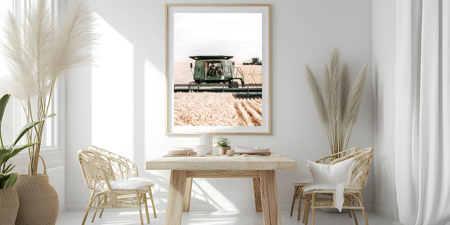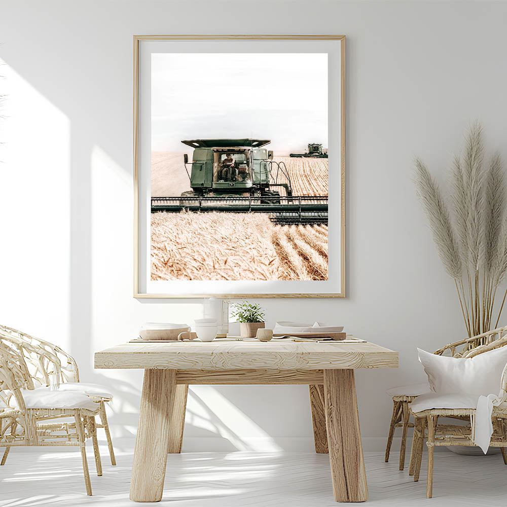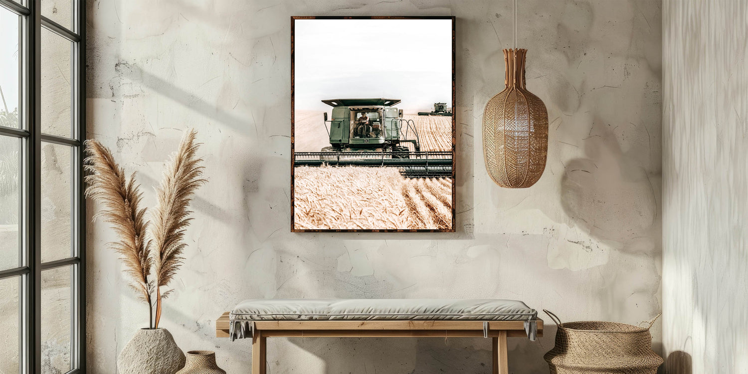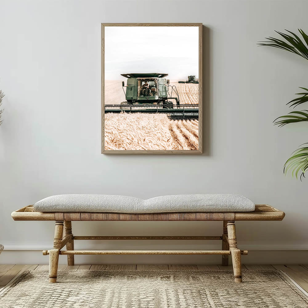 Available in multiple formats, such as stretched canvas, framed prints, and acrylic glass, this artwork can be displayed to complement a variety of interior styles. The warm tones of the wheat field, combined with the muted colors of the tractor, create a balance of modern farm life and vintage farmhouse prints. Whether in your living room, kitchen, or office, this piece adds an authentic country vibe to any space.