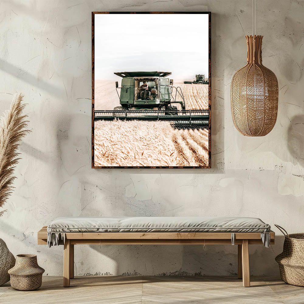 Celebrate the essence of country living style with this farmhouse wall art, featuring a powerful scene of a tractor harvesting a golden wheat field. The stunning depiction of this hardworking farm equipment in action perfectly captures the beauty and simplicity of life on the farm, making it a striking addition to your rustic farmhouse decor. This artwork not only highlights the vast expanse of the wheat field but also brings a sense of energy and movement to your home.