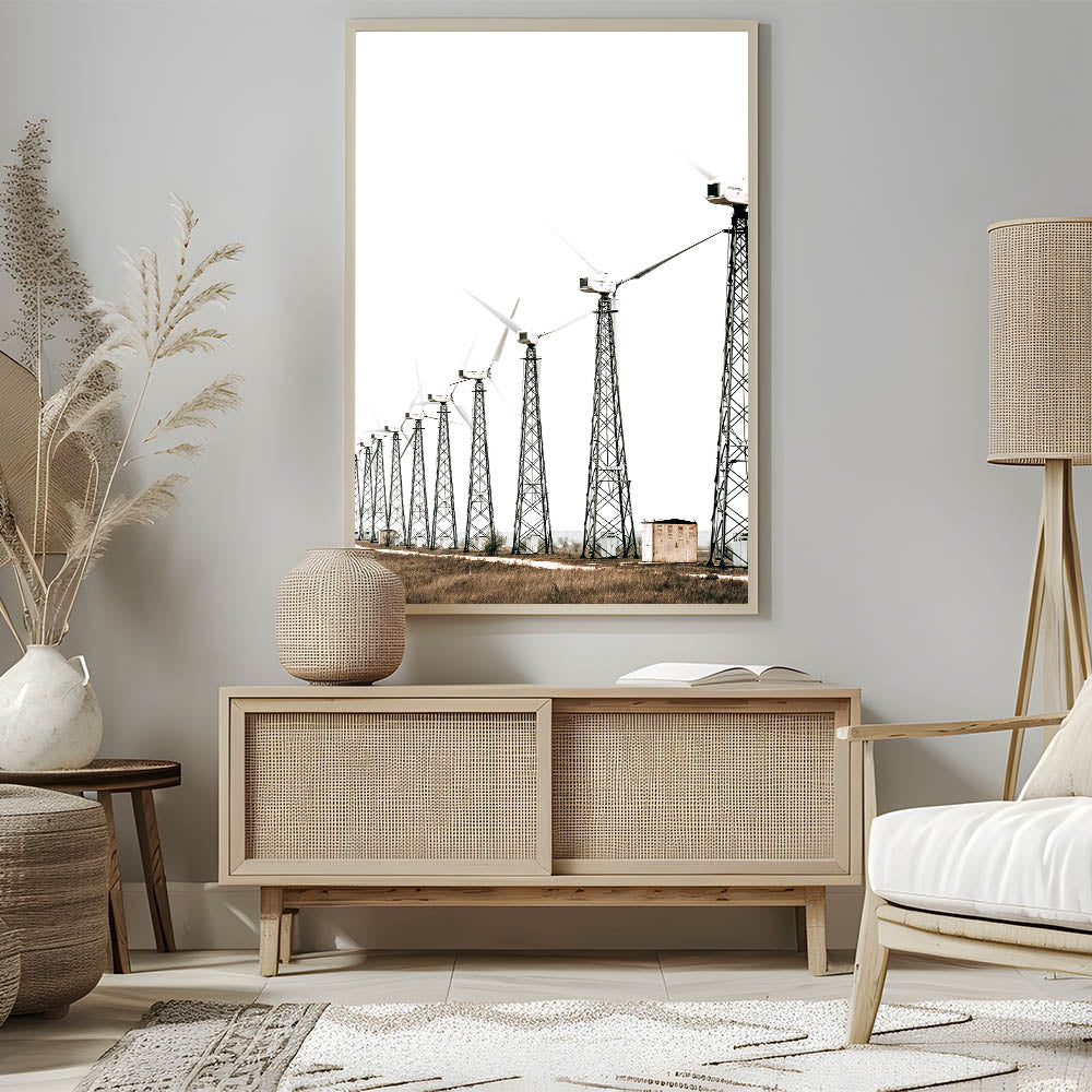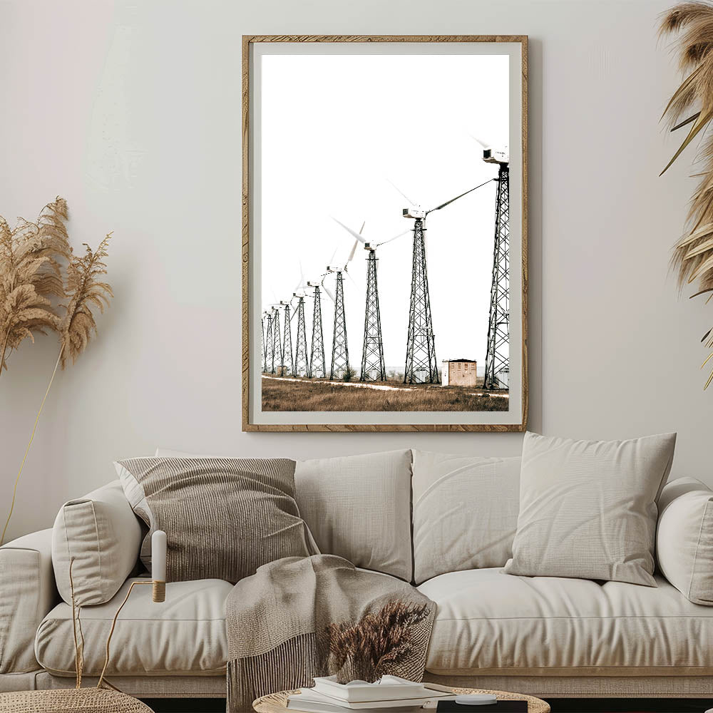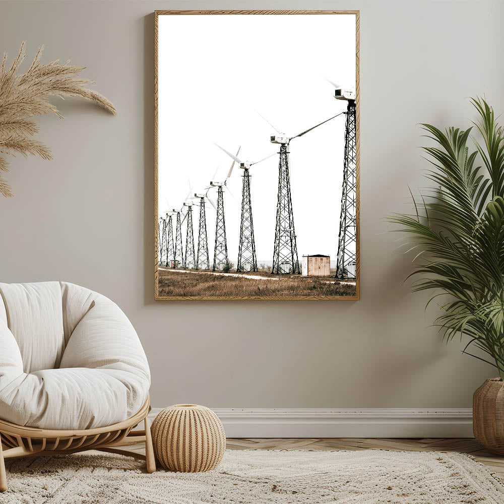 This striking piece of farmhouse wall art features a row of towering wind turbines standing against the open sky, bringing a modern yet rustic feel to your home decor. Perfect for those looking to combine the serenity of the countryside with a contemporary edge, this artwork highlights the harmony between nature and technology. The clean lines and muted tones make it an excellent addition to country living style spaces while maintaining a vintage-inspired farmhouse decor.