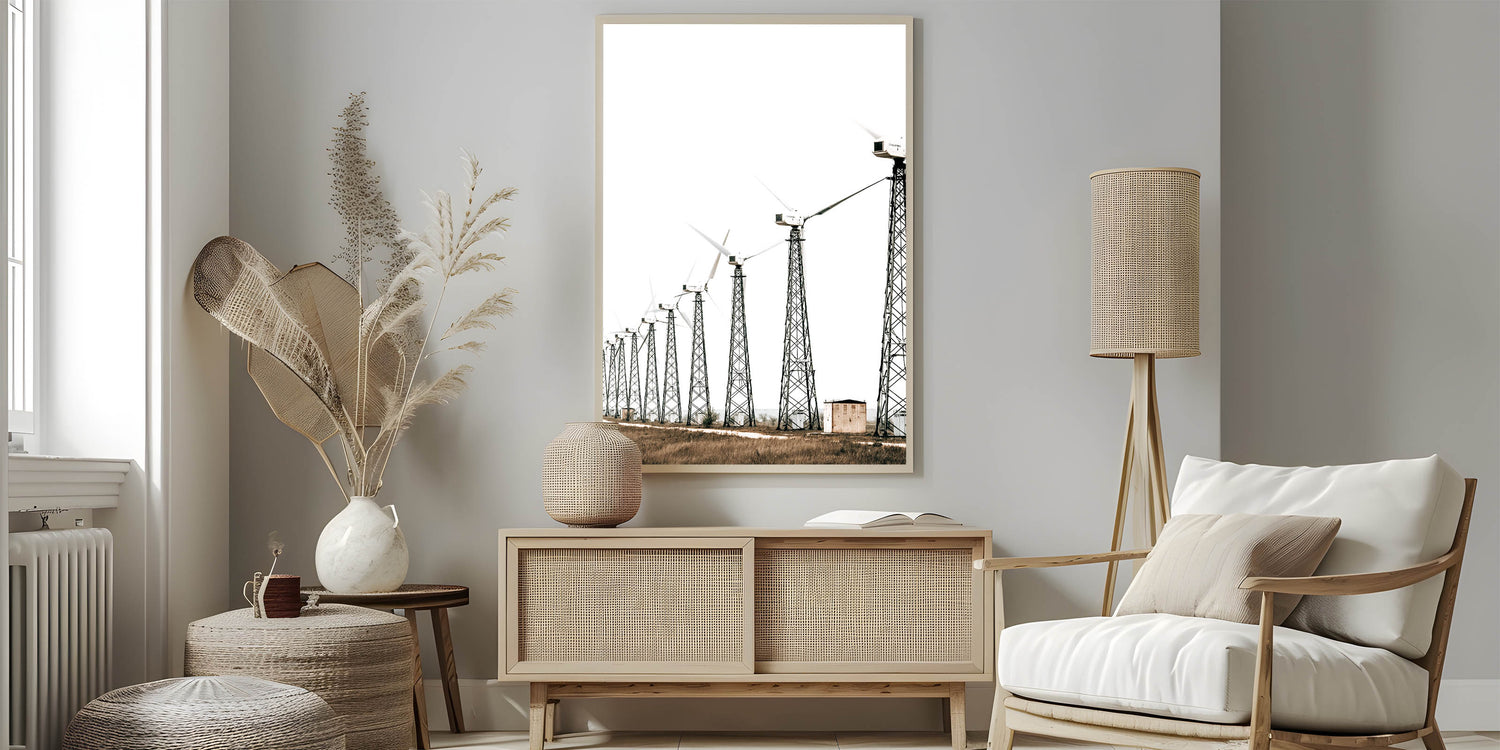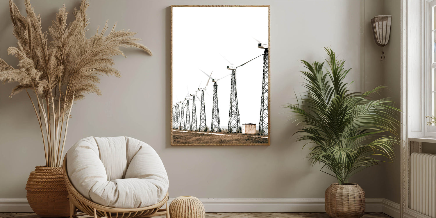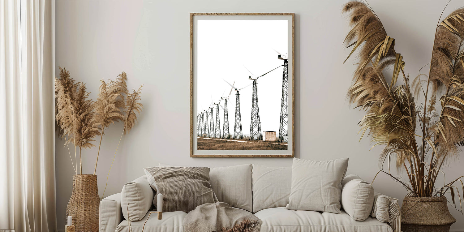 This striking piece of farmhouse wall art features a row of towering wind turbines standing against the open sky, bringing a modern yet rustic feel to your home decor. Perfect for those looking to combine the serenity of the countryside with a contemporary edge, this artwork highlights the harmony between nature and technology. The clean lines and muted tones make it an excellent addition to country living style spaces while maintaining a vintage-inspired farmhouse decor.