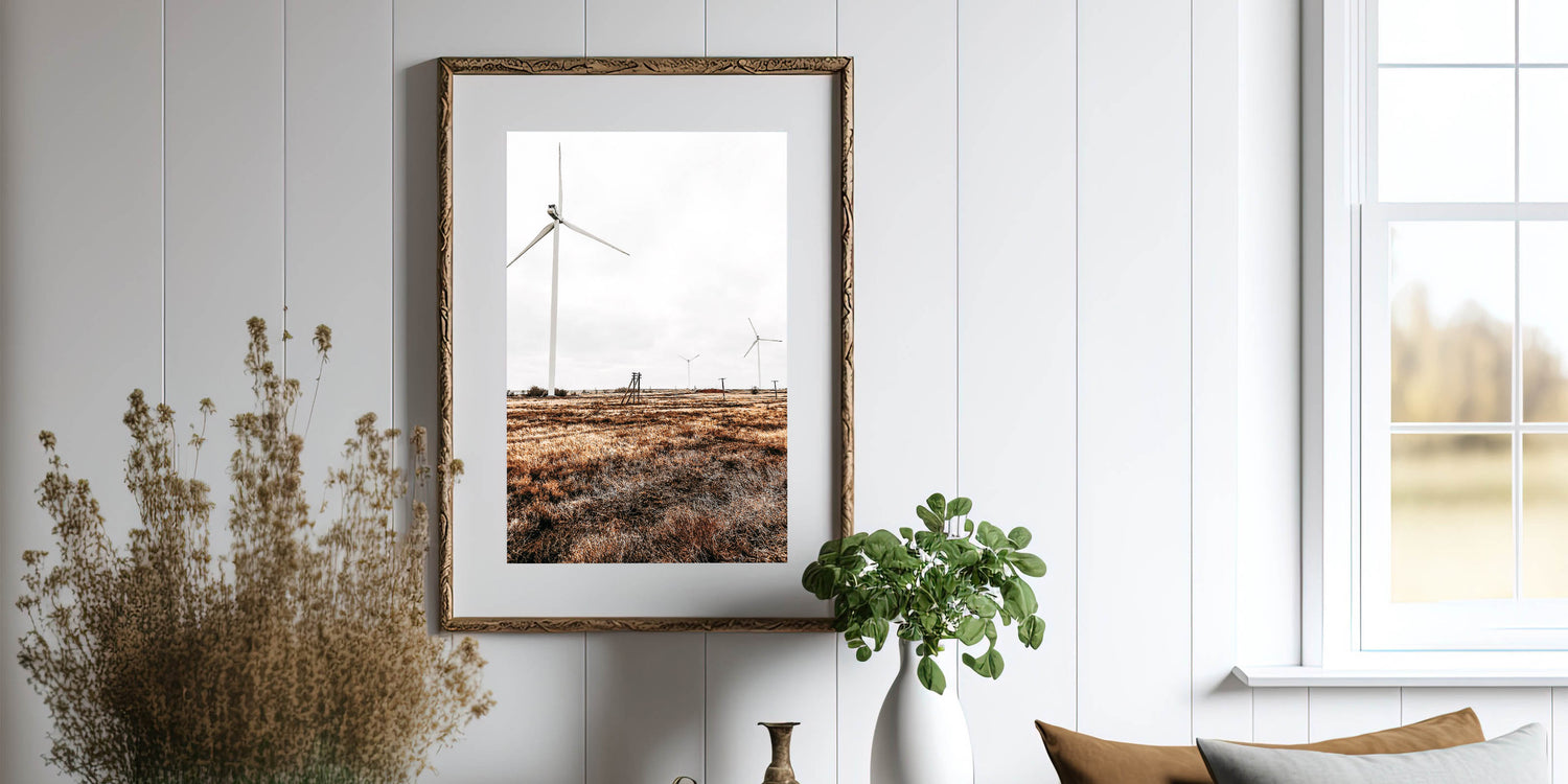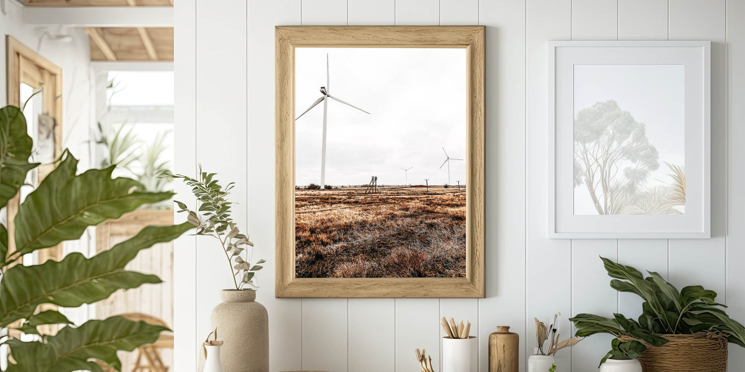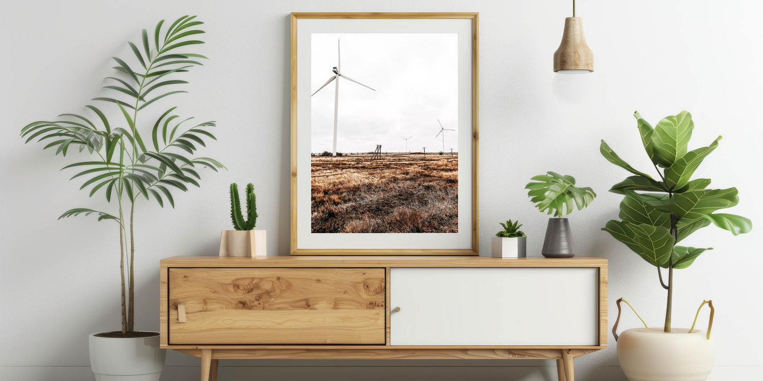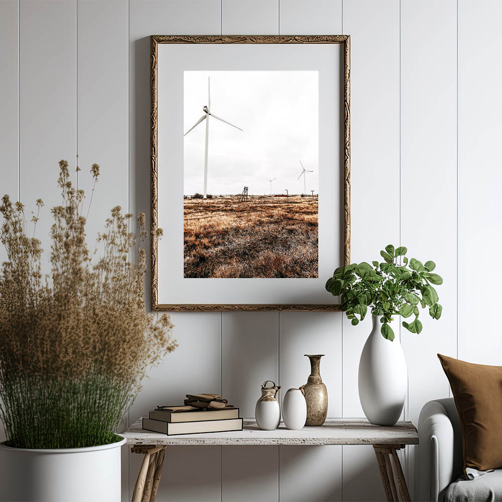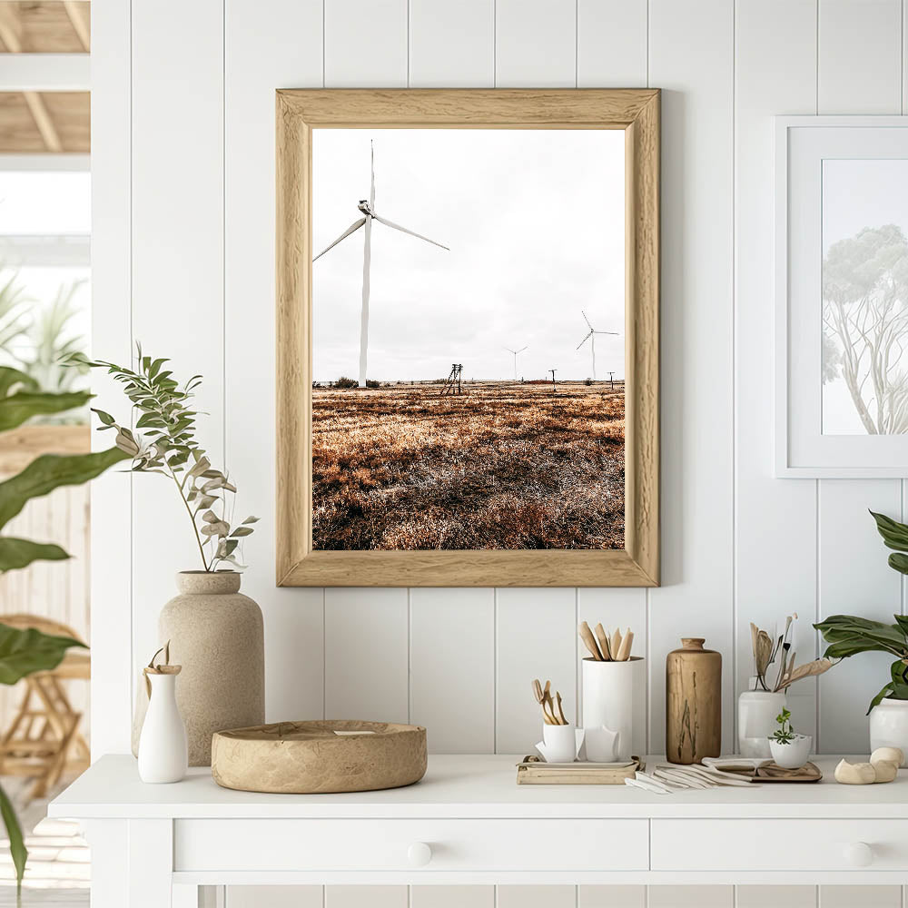 Embrace the balance of nature and modernity with this Farmhouse Wall Art, featuring sleek wind turbines standing tall in a wide-open field. This artwork beautifully combines elements of country living style with a nod to sustainability, making it a unique piece for those who love rustic decor with a modern twist. The contrast between the natural grasses and the smooth, clean lines of the turbines creates a striking visual, perfect for a variety of interiors.