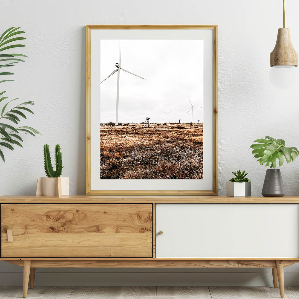 - Depicts a serene yet modern scene of wind turbines in a rural landscape, perfect for adding a touch of rustic charm to any space