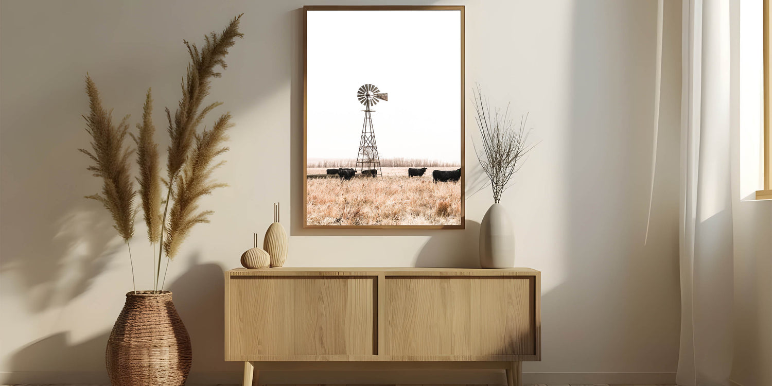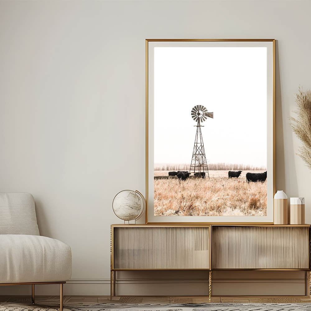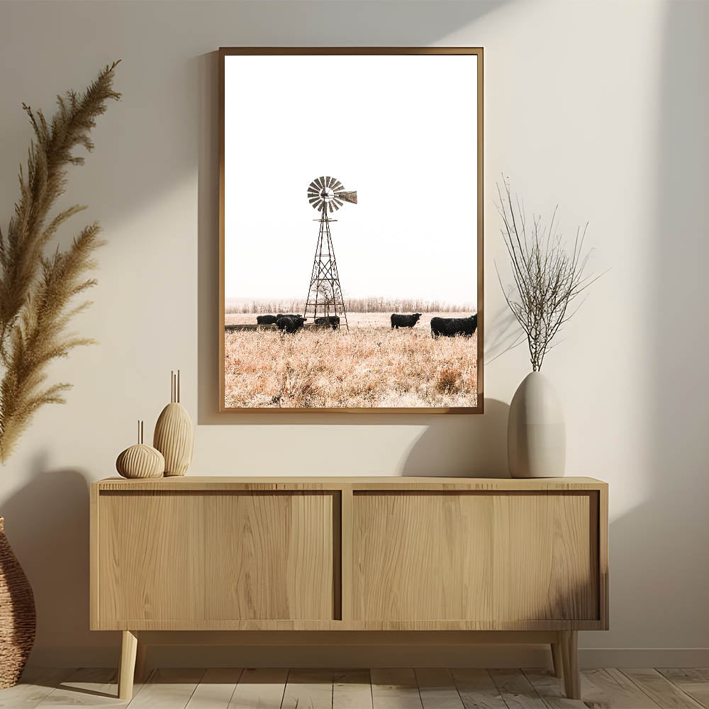 Farmhouse Wall Art: Windmill and Cattle Scene for Rustic Country Decor
