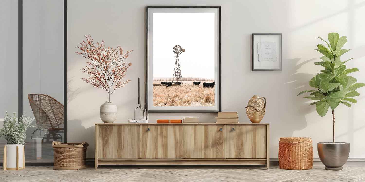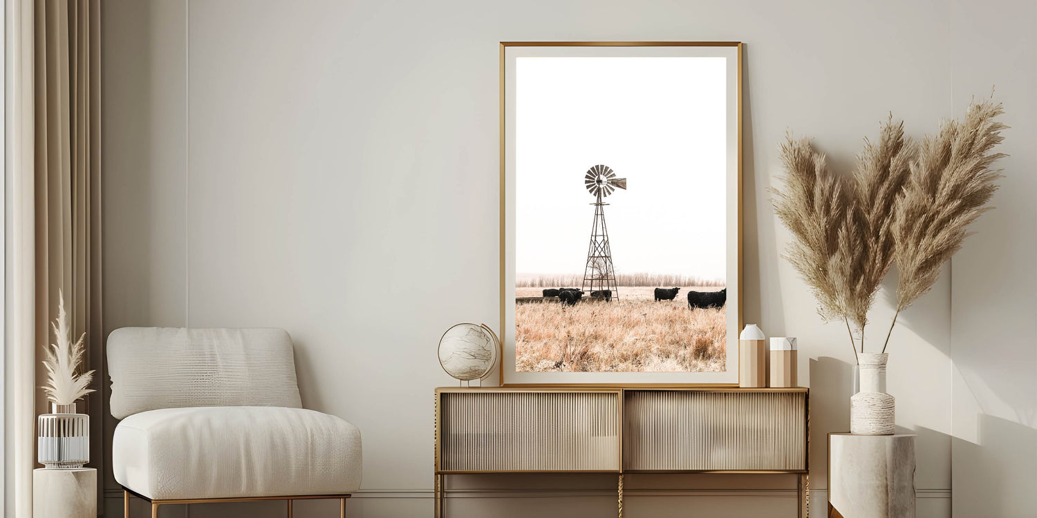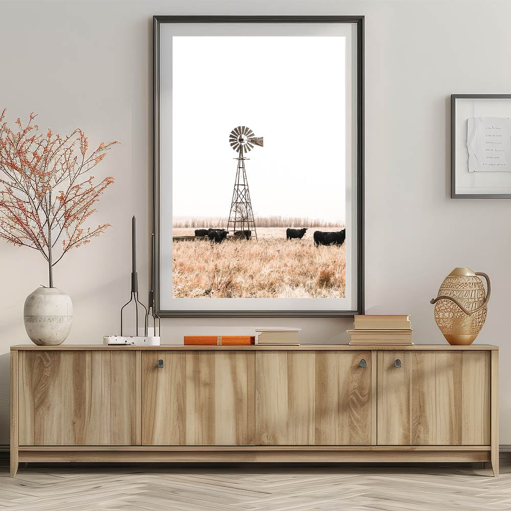 Farmhouse Wall Art: Windmill and Cattle Scene for Rustic Country Decor
