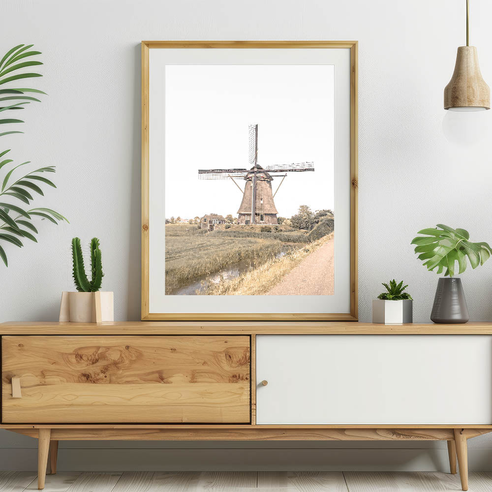 - Rustic charm with a serene windmill and canal scene, ideal for any room