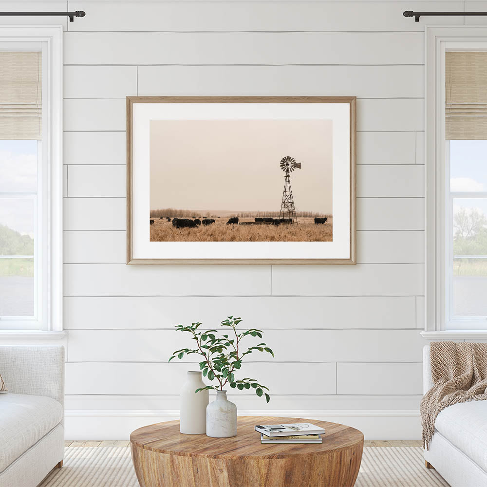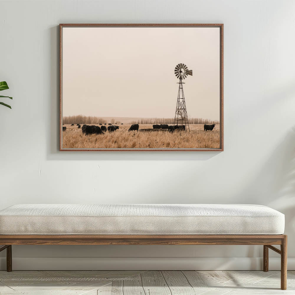 Bring the calm, expansive beauty of the countryside into your home with this charming farmhouse wall art. Featuring a serene image of grazing cattle and a vintage windmill, this artwork perfectly captures the rustic charm of farm life. The soft beige and muted tones of the landscape combined with the black silhouettes of the cattle create a peaceful, minimalist composition, perfect for any farmhouse or country-style decor.