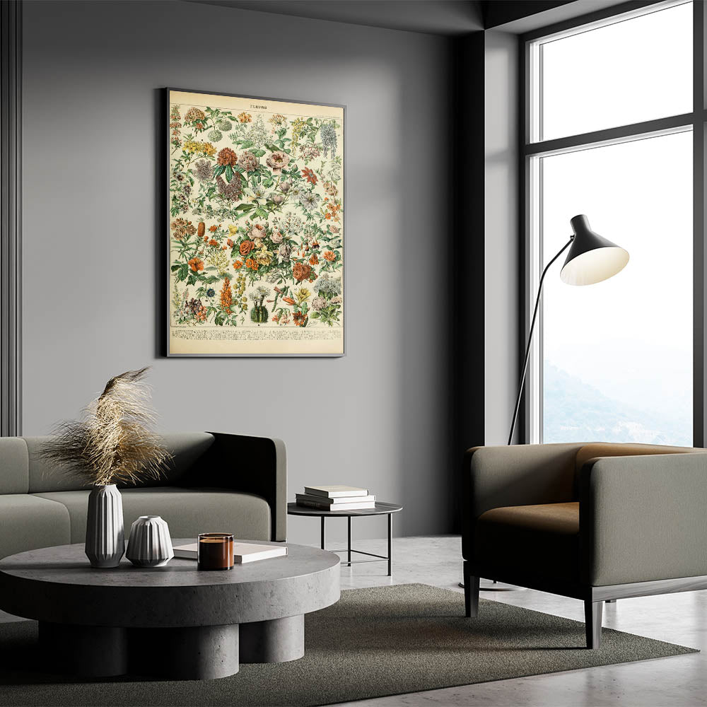 From the elegance of peonies to the delicate blossoms of honeysuckle and cherry blossoms, each flower is rendered with remarkable detail. This vintage print will add a timeless touch to your living room, bedroom, or office, infusing any space with color and life.