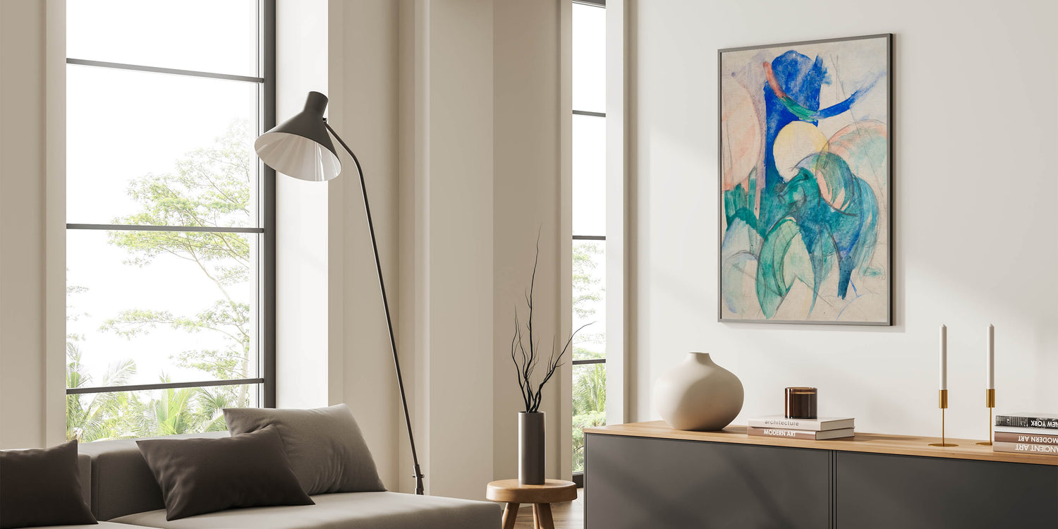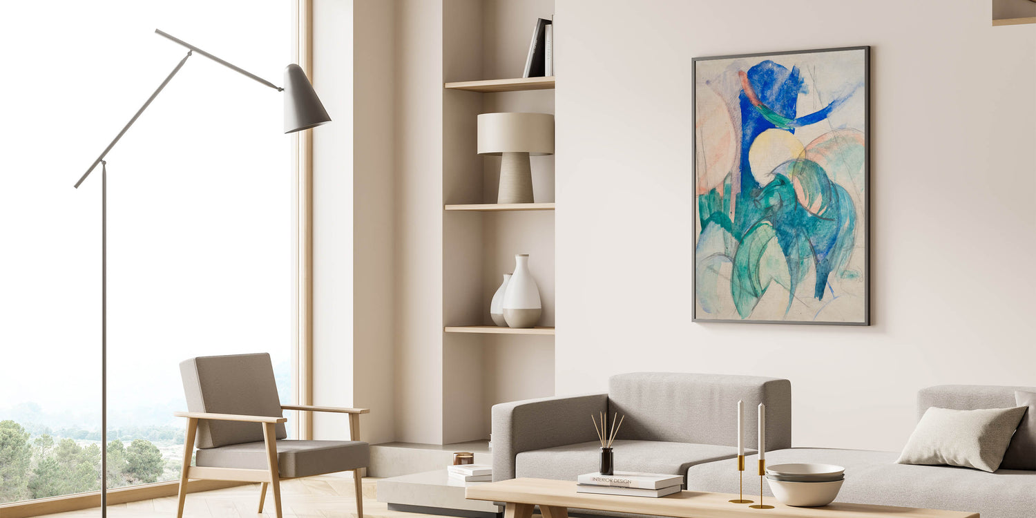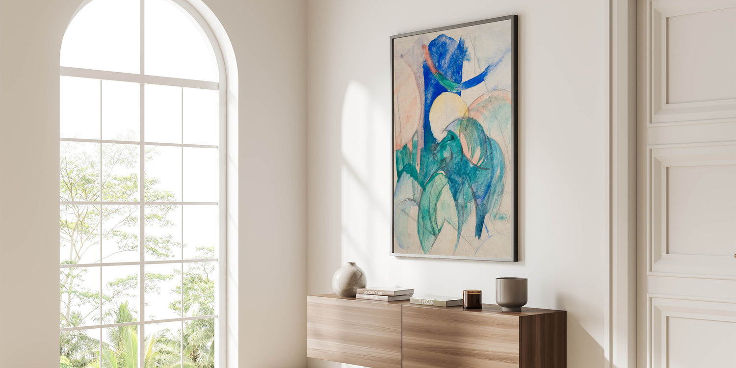 Step into the vibrant world of Franz Marc's "Mandrill," a stunning example of abstract Expressionism. This artwork combines bold blue, green, and soft pastel hues to depict the essence of a mandrill, blending the lines between nature and imagination. With fluid brushstrokes and a dreamlike composition, Marc captures the dynamic energy and spirit of the animal, creating a piece that resonates with movement and emotion.