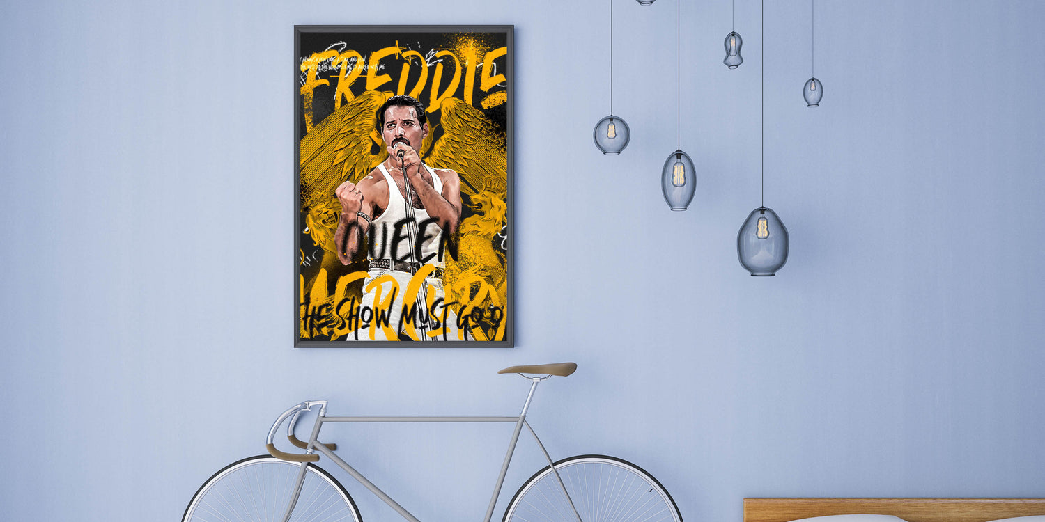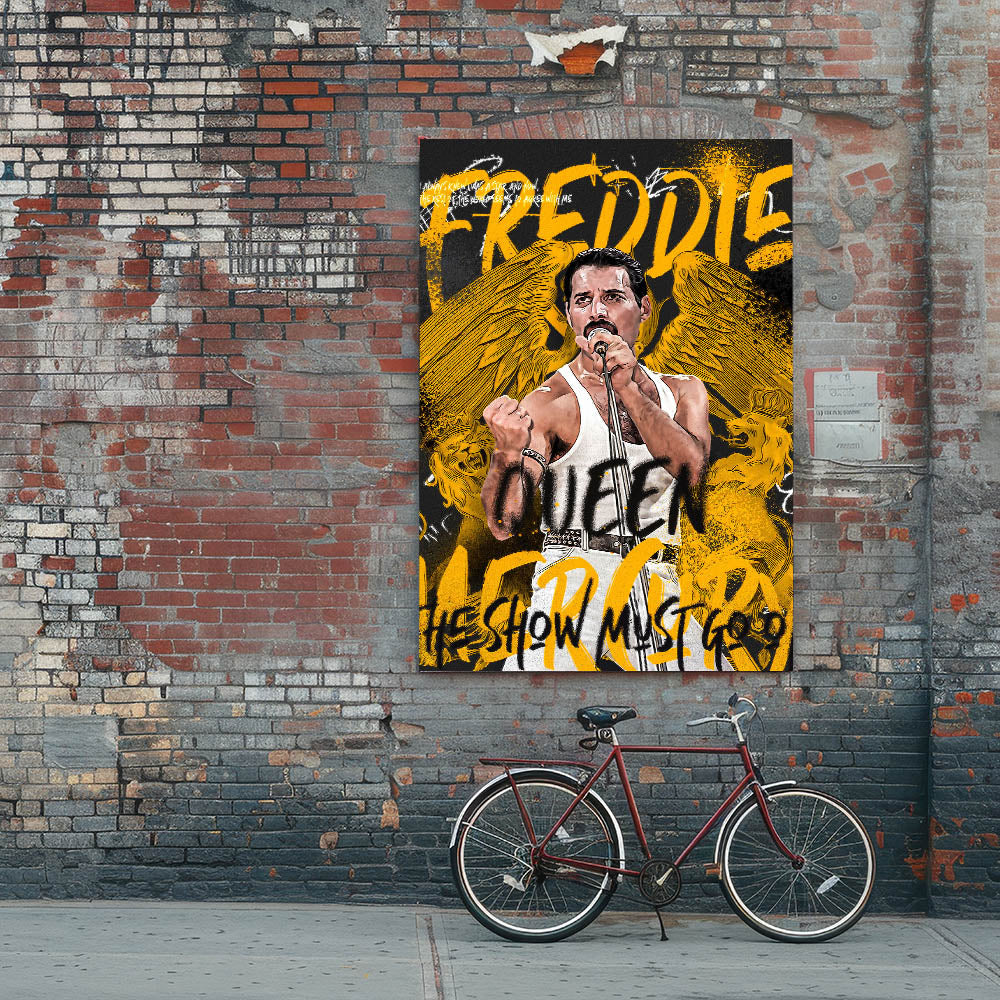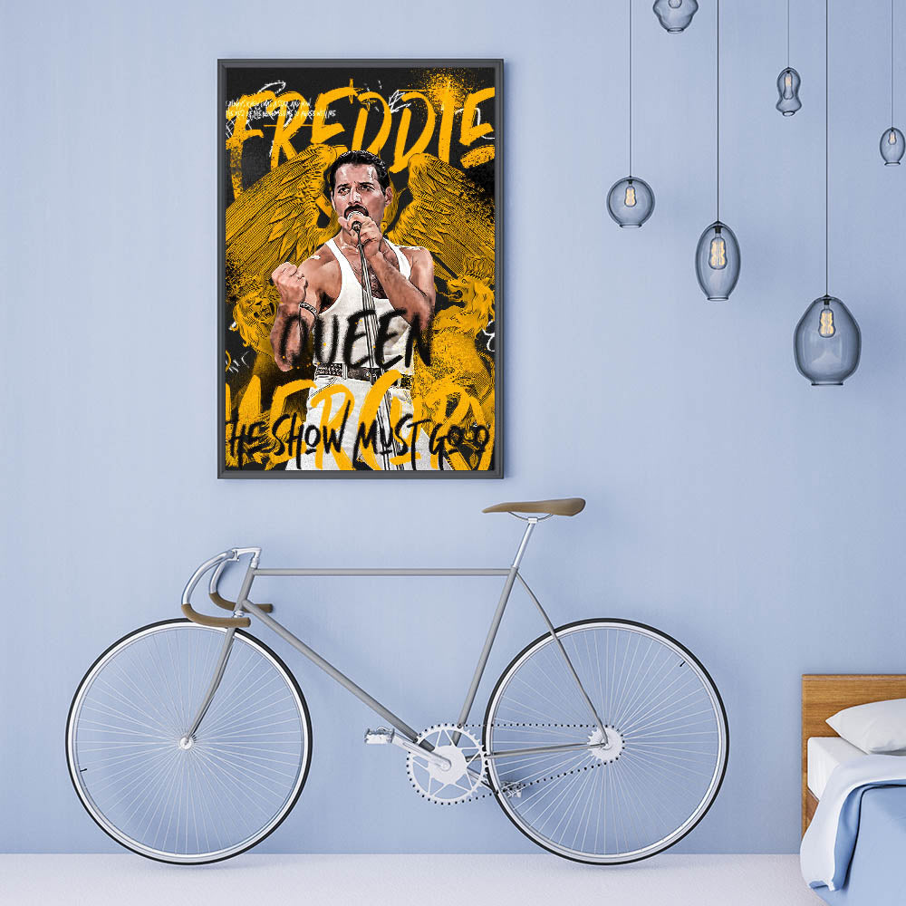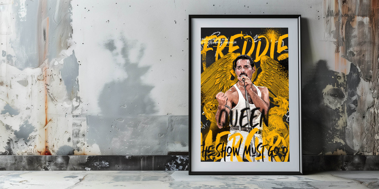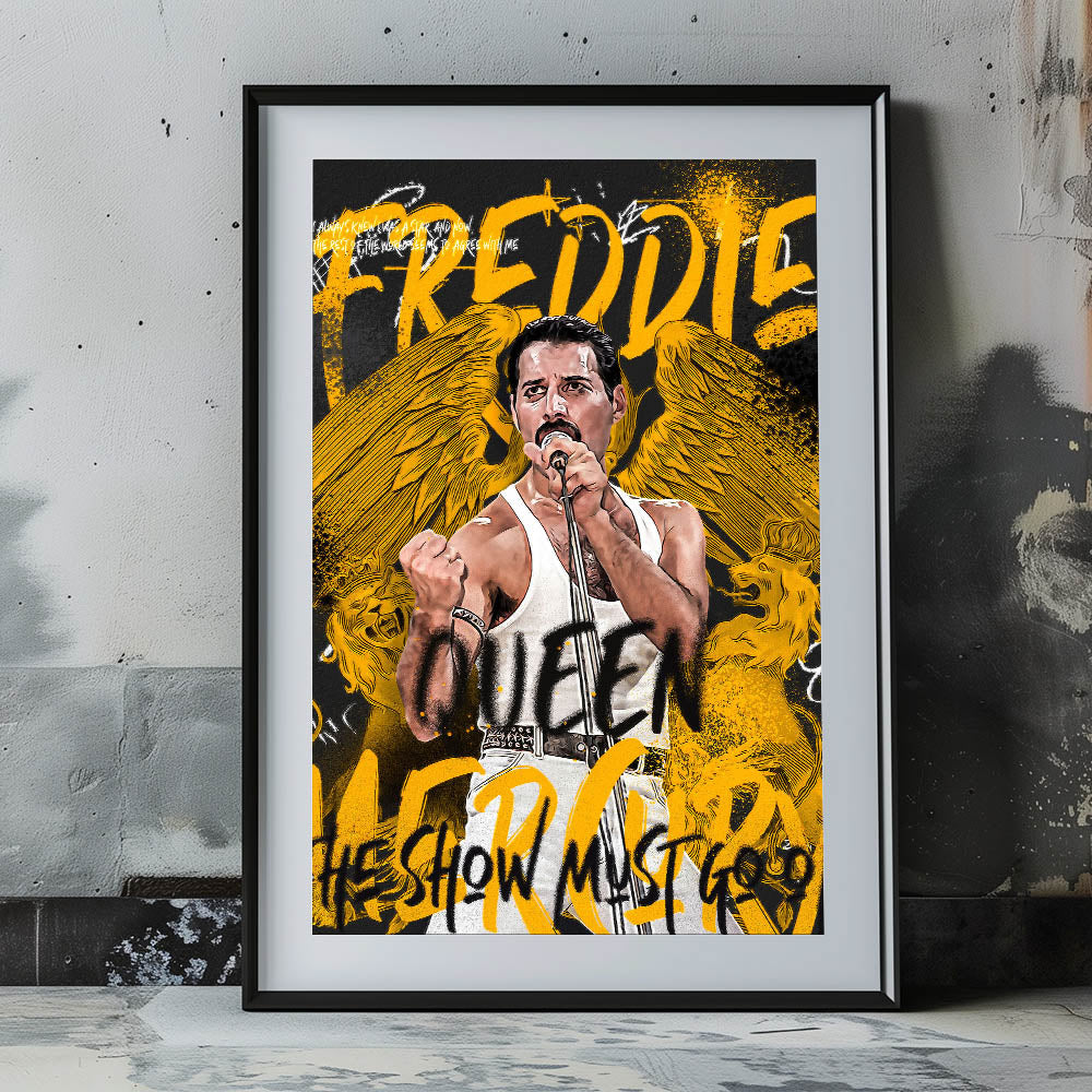 Celebrate the legend of Freddie Mercury with this vibrant pop art wall art. Capturing the electrifying energy of Queen's iconic frontman, this modern pop art print combines bold yellows, blacks, and whites with intricate gold accents. Designed to stand out, this piece adds a dynamic touch to any room, making it perfect for music lovers and contemporary décor enthusiasts alike.