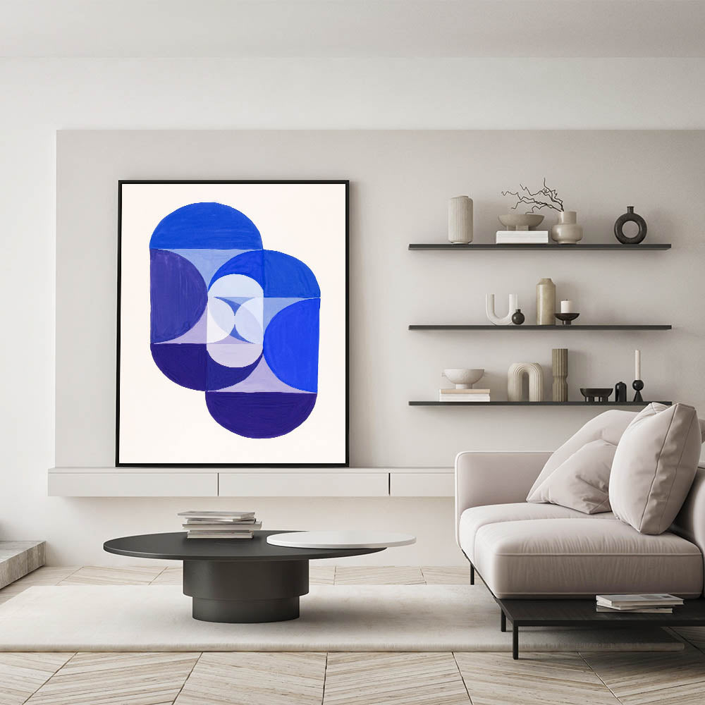 Add a sense of balance and modern sophistication to your space with this geometric blue abstract wall art. Featuring overlapping circular forms in various shades of blue and white, this artwork is ideal for those who appreciate minimalist decor with a structured, mathematical touch.