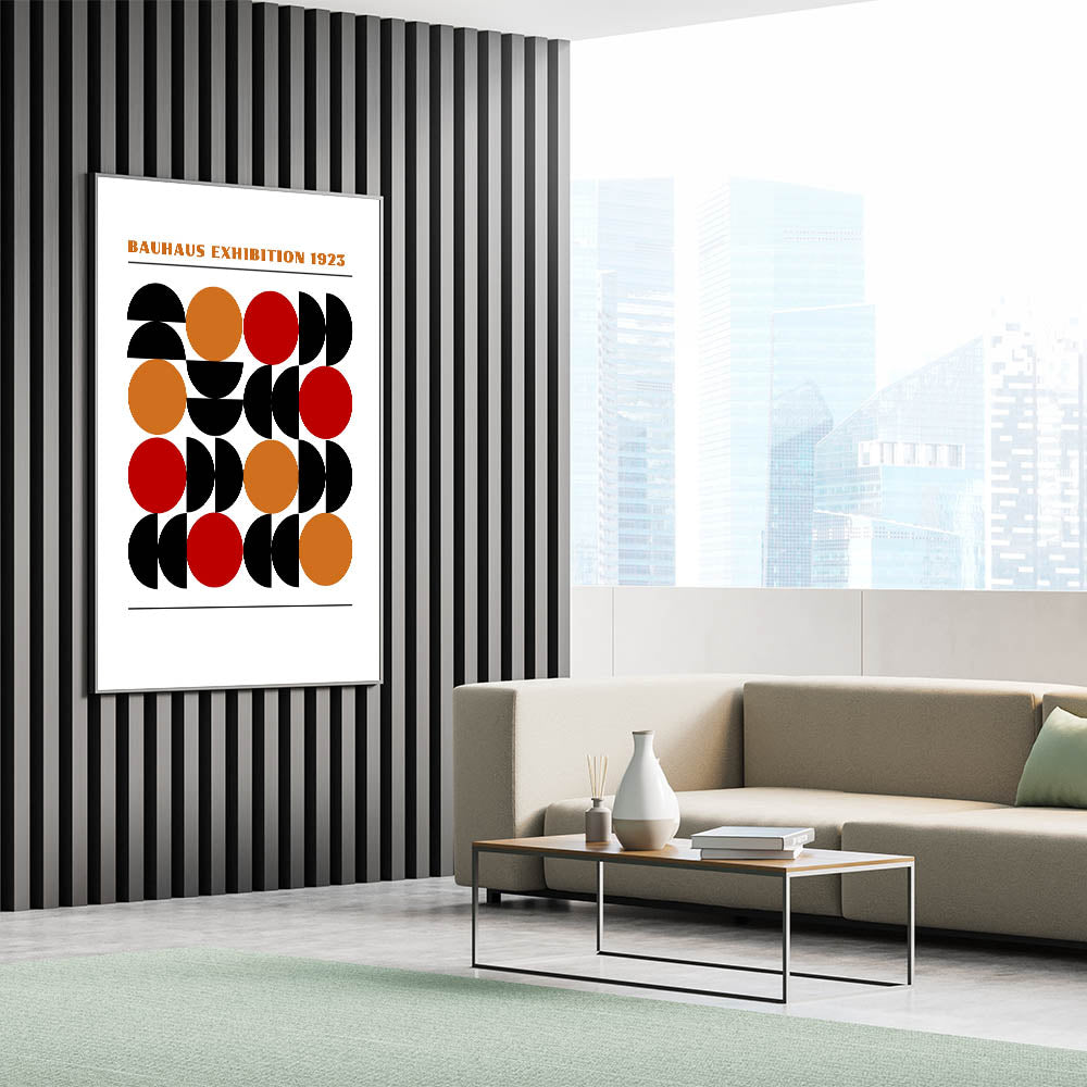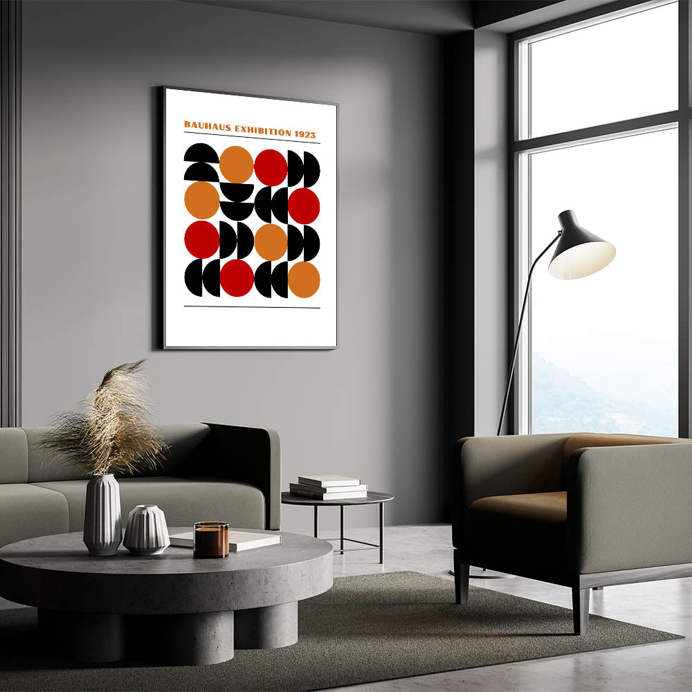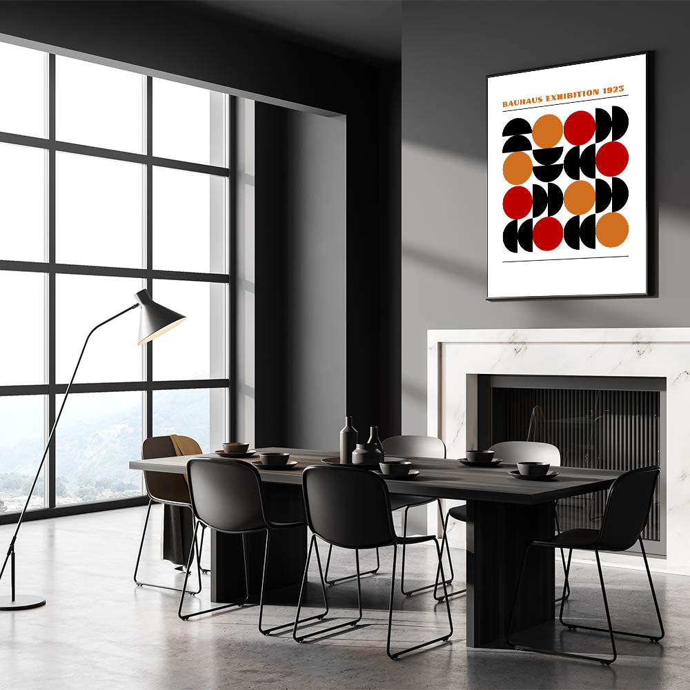 Add a bold and dynamic element to your décor with this unique bohemian artwork for modern spaces, inspired by the timeless Bauhaus exhibition of 1923. This geometric masterpiece features a series of half circles and full circles in black, orange, and red, creating a vibrant and eye-catching design that is sure to enhance any room. The perfect blend of eclectic boho wall art and modern geometric style, this piece offers a contemporary twist on traditional Bohemian décor.
