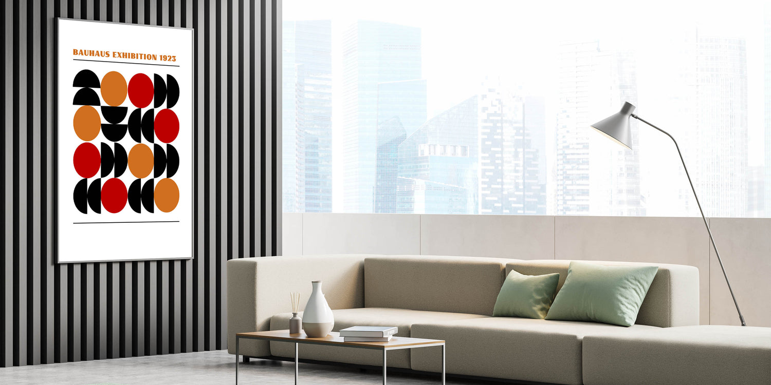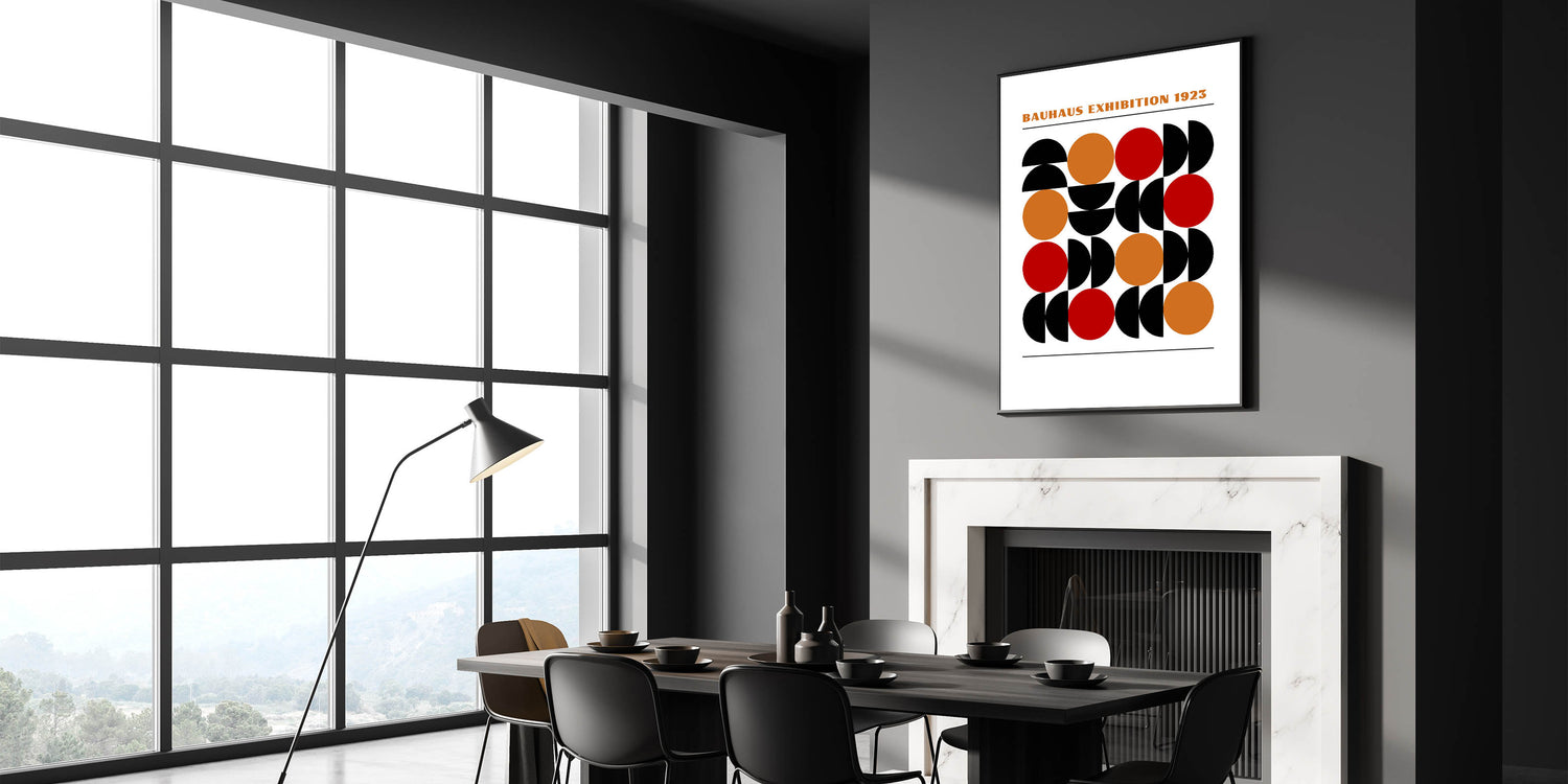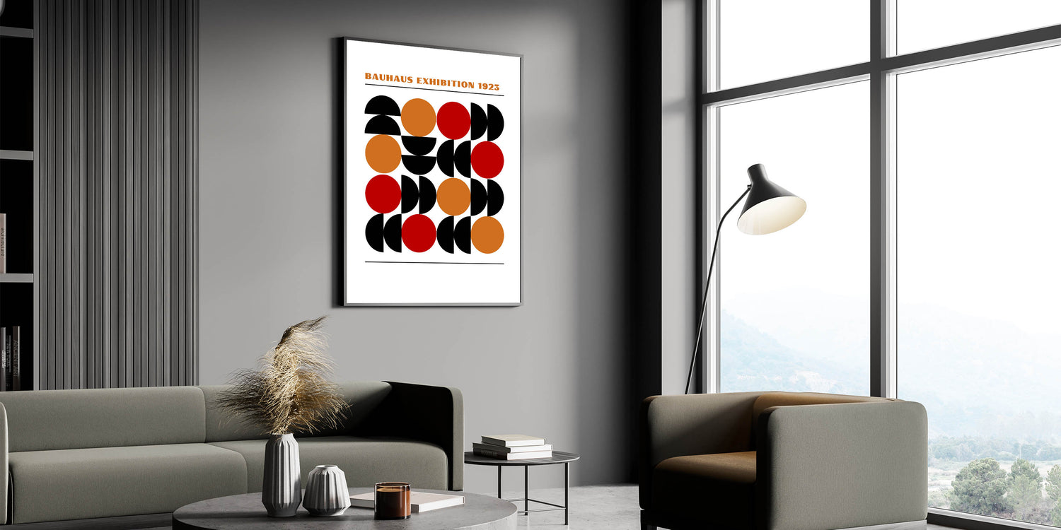 Add a bold and dynamic element to your décor with this unique bohemian artwork for modern spaces, inspired by the timeless Bauhaus exhibition of 1923. This geometric masterpiece features a series of half circles and full circles in black, orange, and red, creating a vibrant and eye-catching design that is sure to enhance any room. The perfect blend of eclectic boho wall art and modern geometric style, this piece offers a contemporary twist on traditional Bohemian décor.