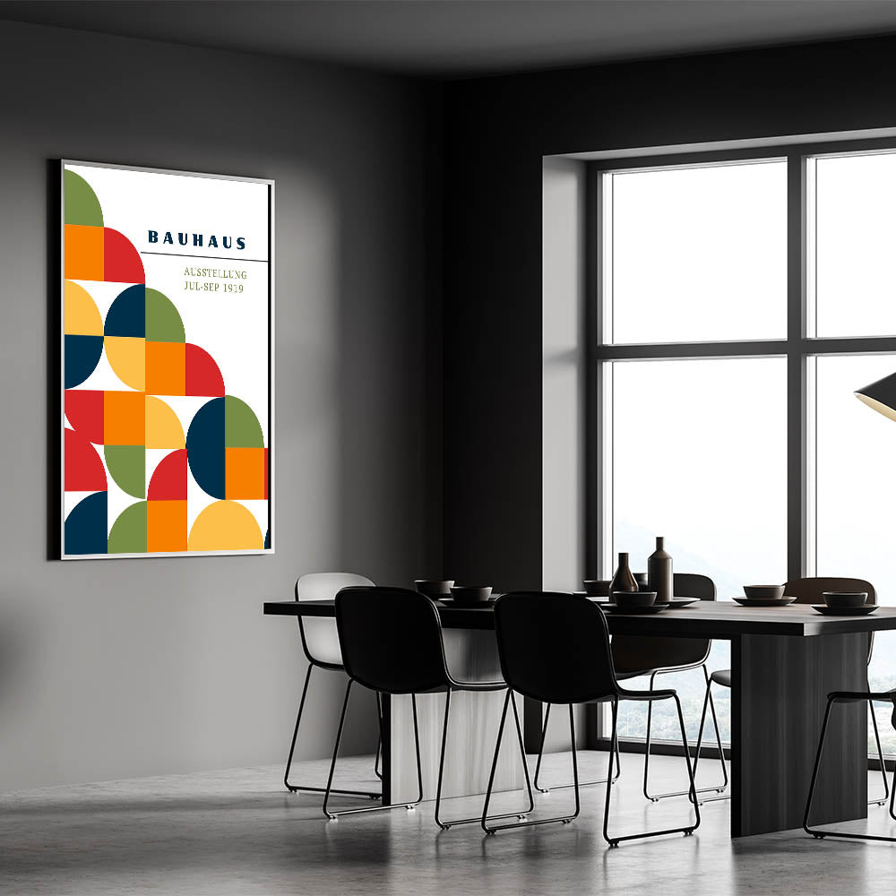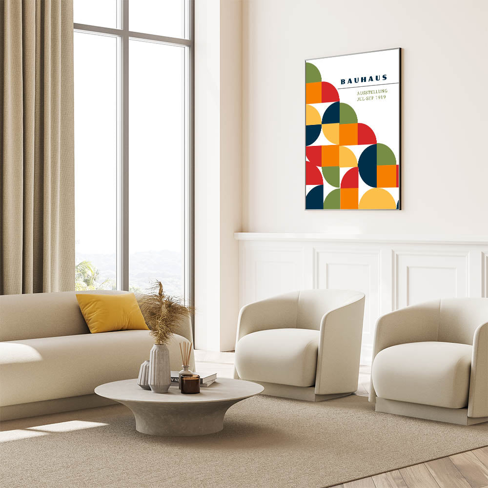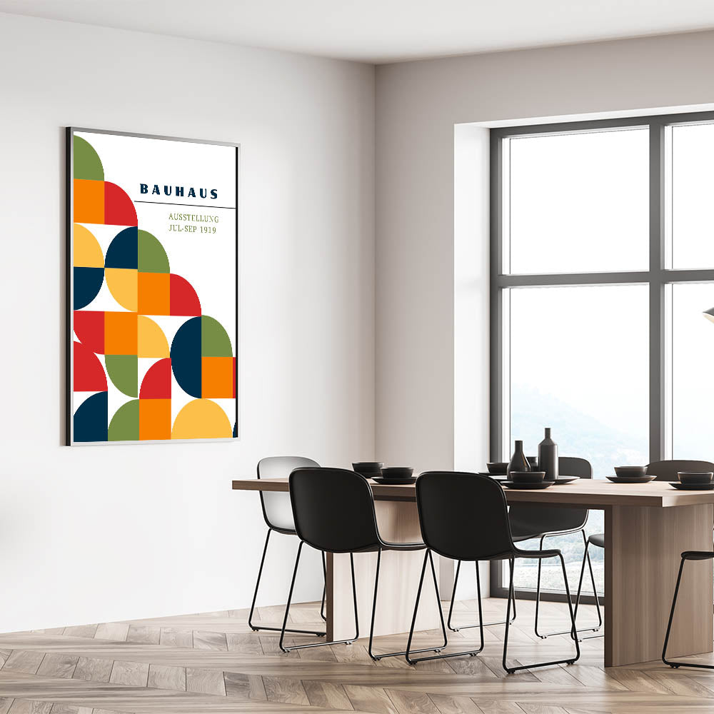 Add a splash of vibrant color and modern design to your décor with this unique bohemian artwork for modern spaces, inspired by the Bauhaus exhibition of 1919. This geometric piece features a lively combination of half circles, full circles, and square shapes in green, red, orange, navy blue, and yellow, creating a bold yet harmonious design. Perfect for any space, this eclectic boho wall art brings the perfect balance of artistic bohemian style and modern geometric elegance.