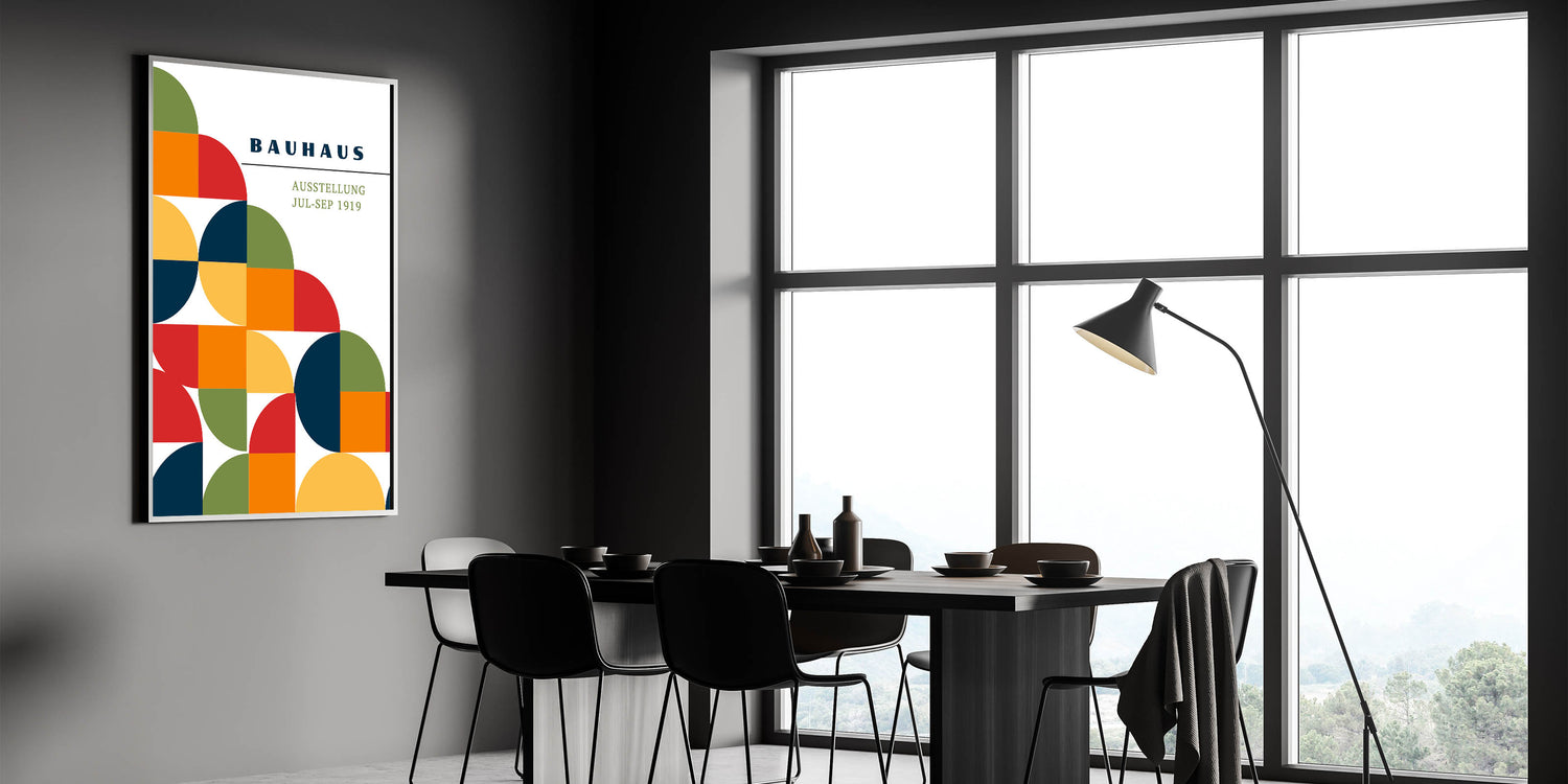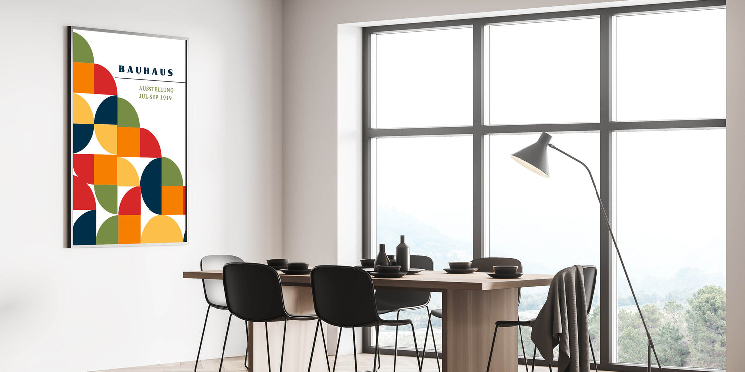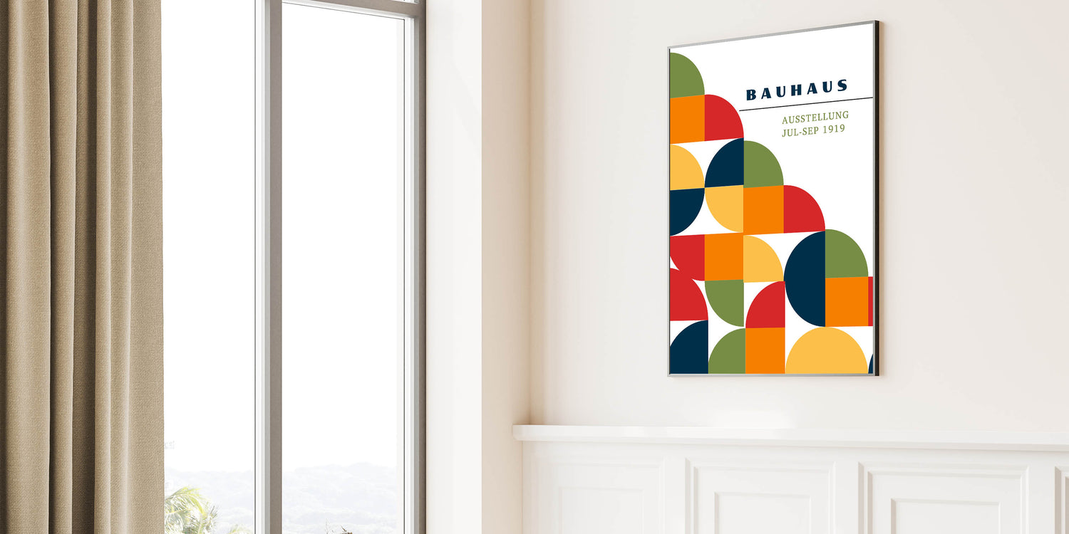 Add a splash of vibrant color and modern design to your décor with this unique bohemian artwork for modern spaces, inspired by the Bauhaus exhibition of 1919. This geometric piece features a lively combination of half circles, full circles, and square shapes in green, red, orange, navy blue, and yellow, creating a bold yet harmonious design. Perfect for any space, this eclectic boho wall art brings the perfect balance of artistic bohemian style and modern geometric elegance.