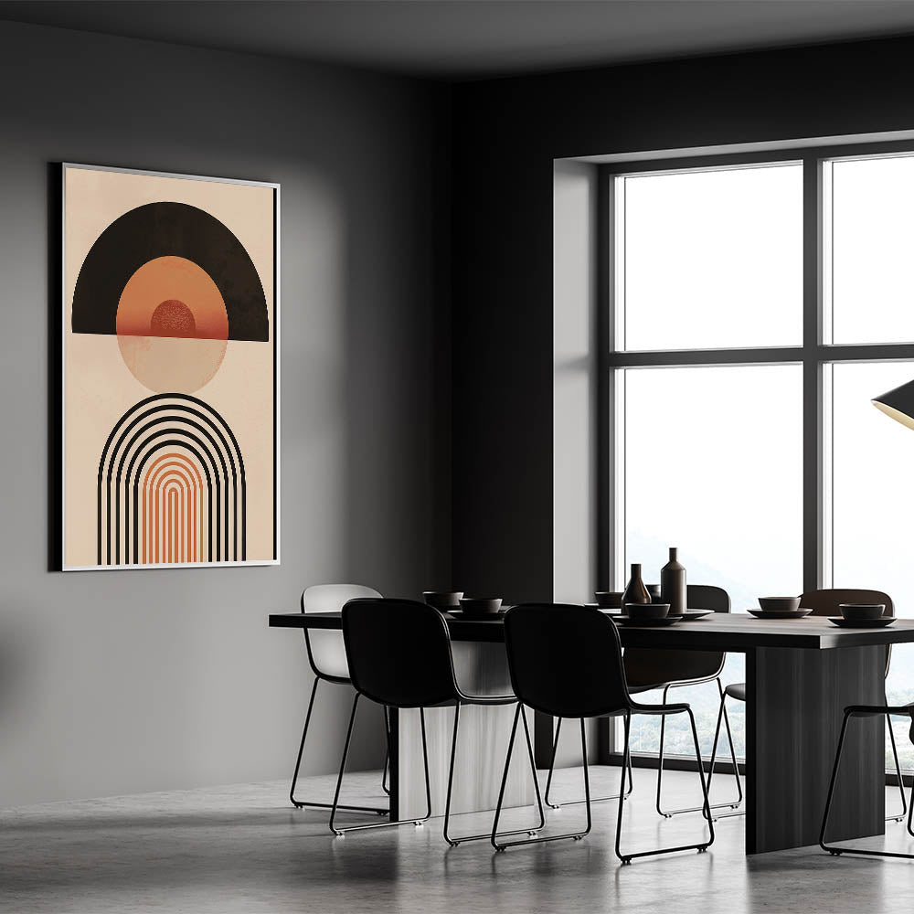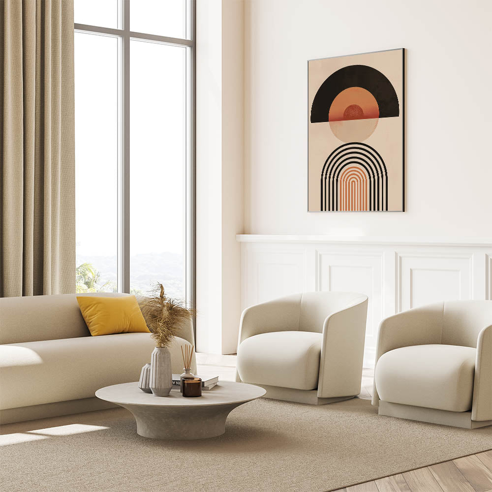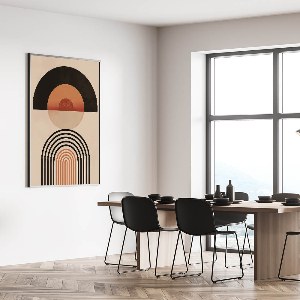 Add a touch of bold, geometric flair to your home with this striking Bohemian wall art. Featuring a balanced blend of circular and arched shapes in warm earthy tones, this eclectic boho decor canvas is perfect for adding a unique and artistic bohemian style to your living space. The symmetrical design and warm color palette make this piece a modern and chic addition to any room, effortlessly blending with both contemporary and boho-inspired interiors.