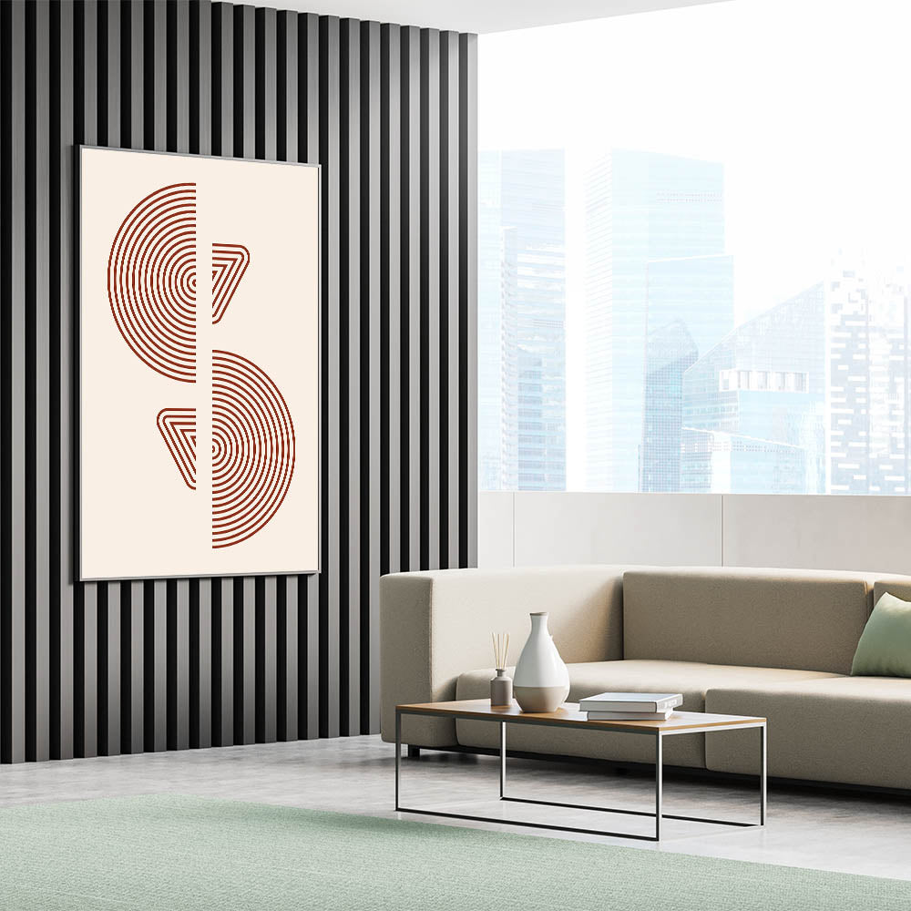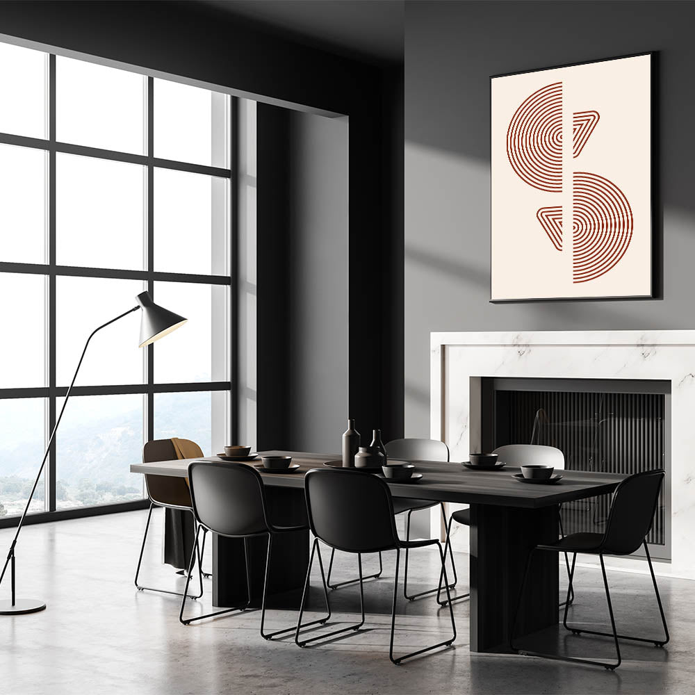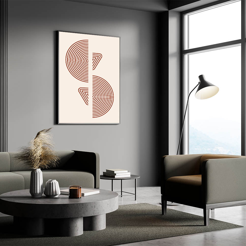 This minimalist wall art design features perfectly aligned geometric lines that create a balance between circles and triangles, accented in warm, earthy terracotta tones. The artwork's clean and symmetrical structure gives it a modern appeal while maintaining a subtle retro vibe, making it an ideal choice for bohemian and contemporary interiors alike. The concentric circles and triangular patterns draw the eye, offering a statement piece for any room.
