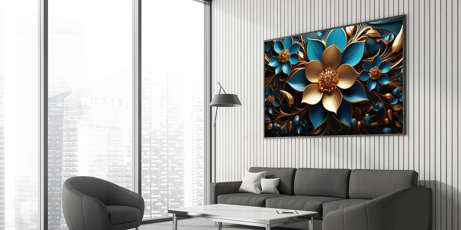 Glam Wall Art - Luxurious Blue and Gold 3D Floral Design for Modern Homes