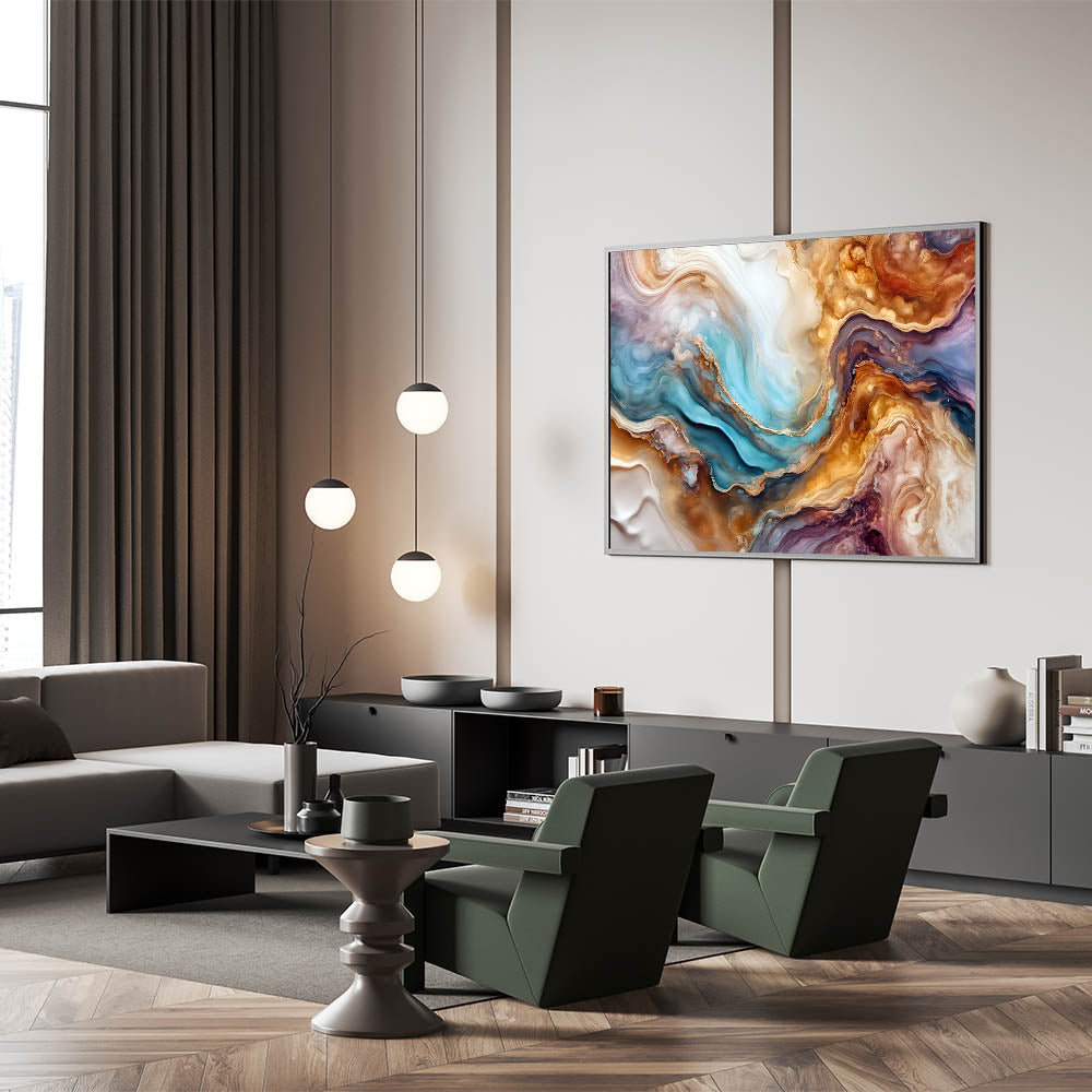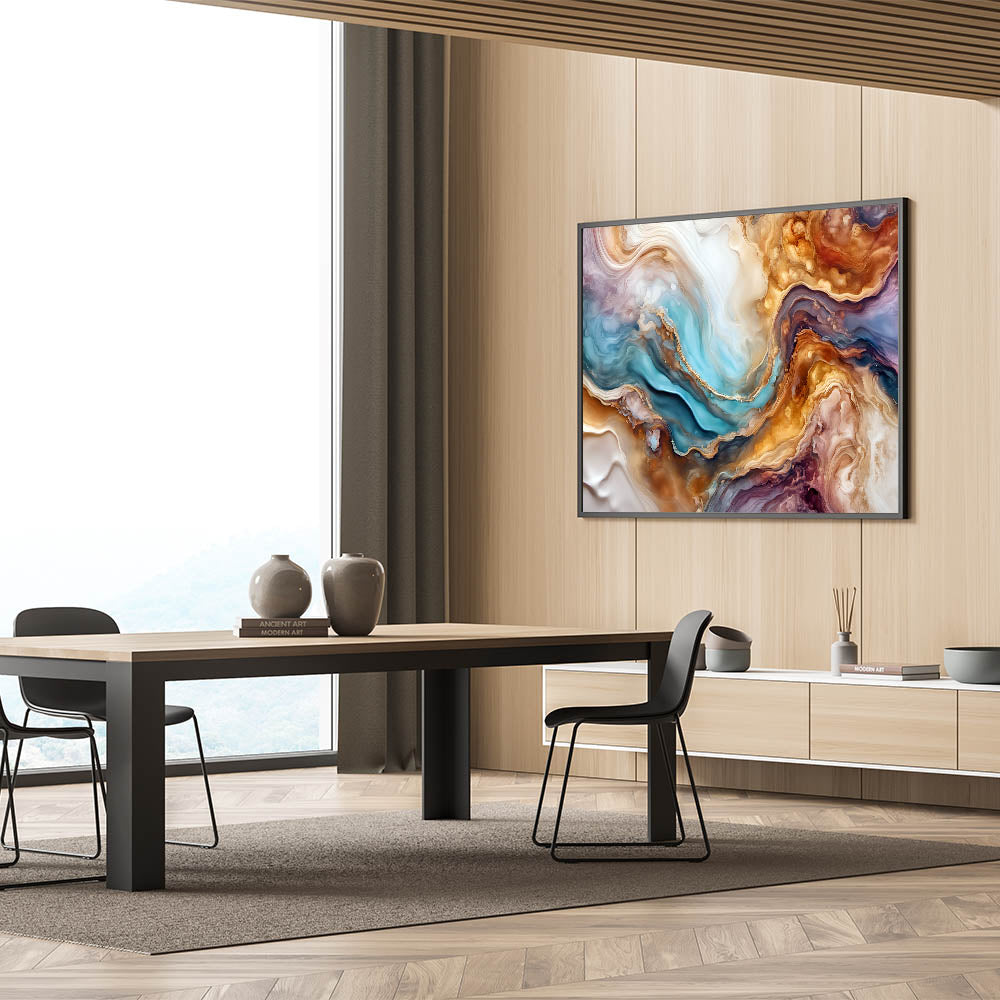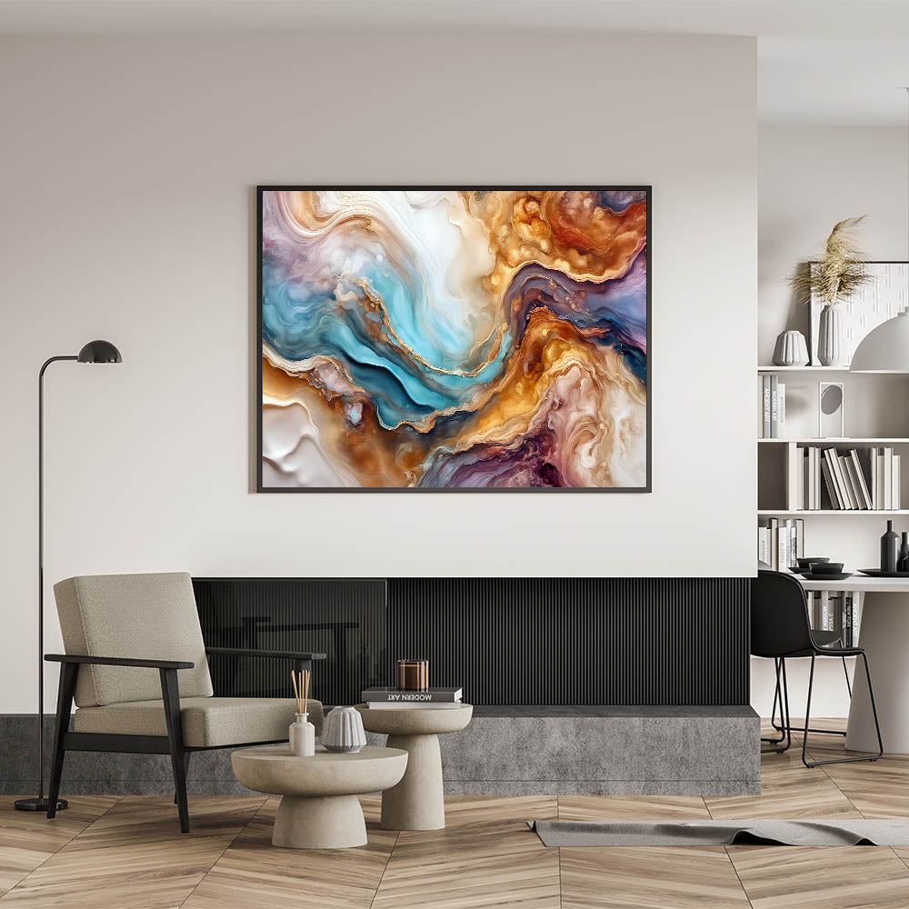 Infuse your home with the elegance of this stunning glam wall art, featuring a fluid abstract design with flowing multicolor tones and shimmering gold accents. The movement within the composition, with rich hues of blue, brown, and ivory, evokes the beauty of nature's flowing rivers and geological formations. Perfect for those who appreciate a blend of natural elements and contemporary luxury, this artwork creates a sense of depth and sophistication in any room. The touches of gold add a hint of opulence, making it a standout piece for living rooms, bedrooms, or stylish office spaces.