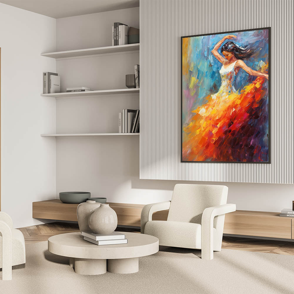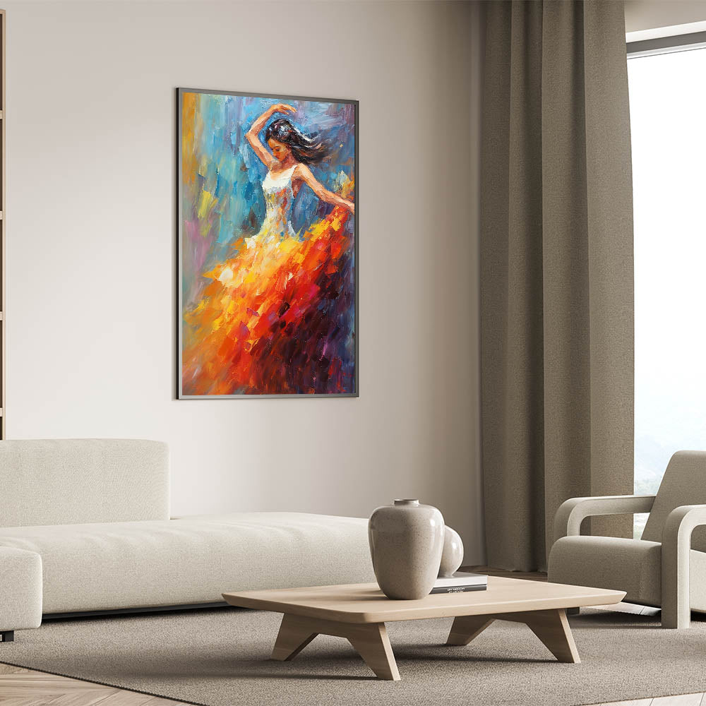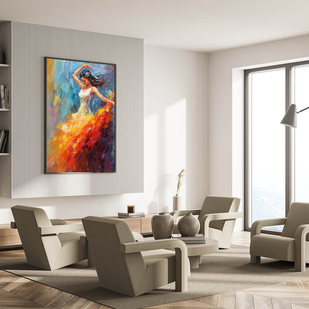 Add a vibrant touch of glam style to your home with this stunning piece of chic wall art. Featuring an elegant dancer in mid-motion, the bold combination of orange, red, and blue colors creates a captivating blend of energy and elegance. This luxurious artwork brings a sophisticated accent to any modern glam decor setting, making it a perfect choice for your glamorous home interiors.