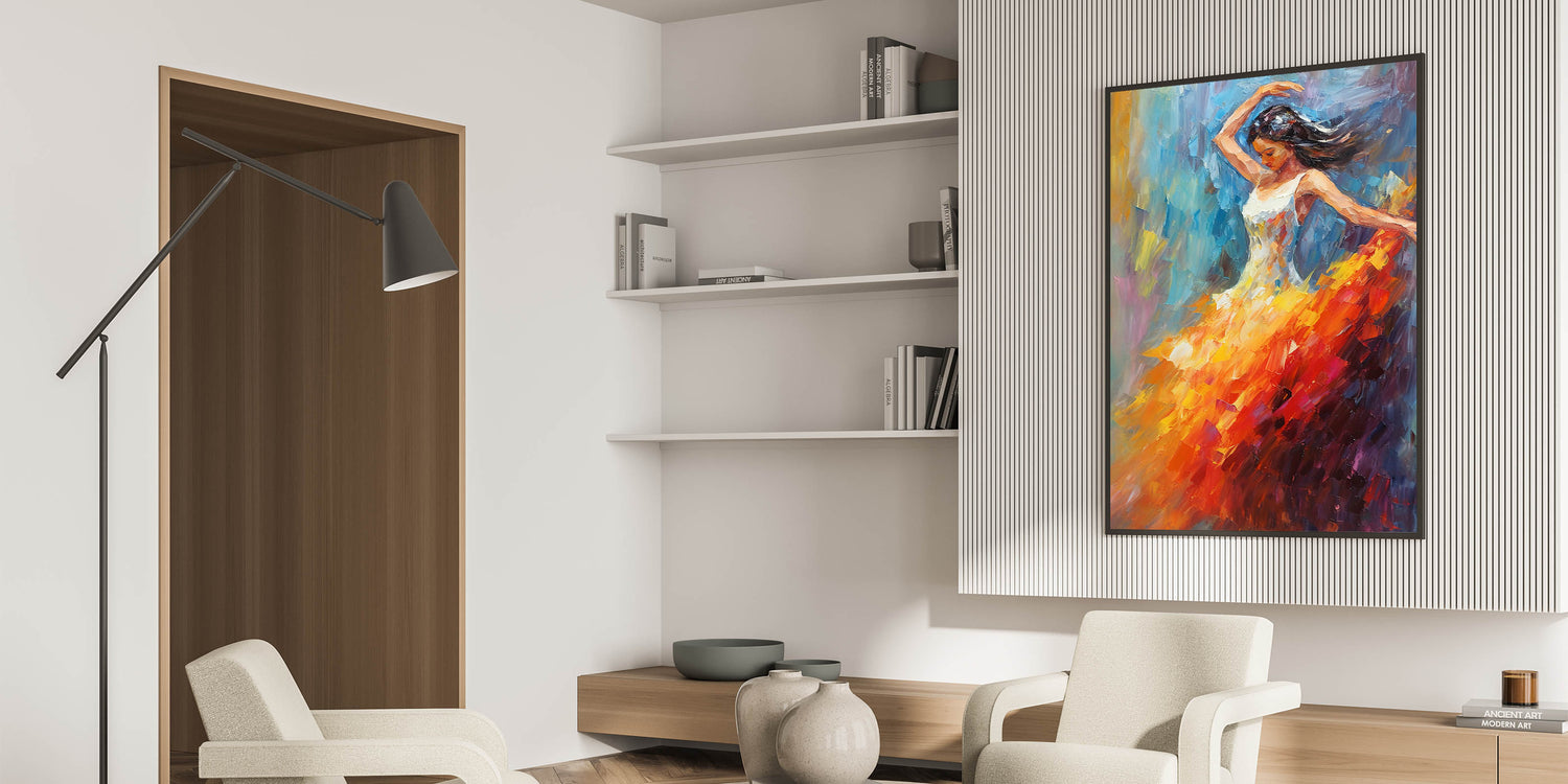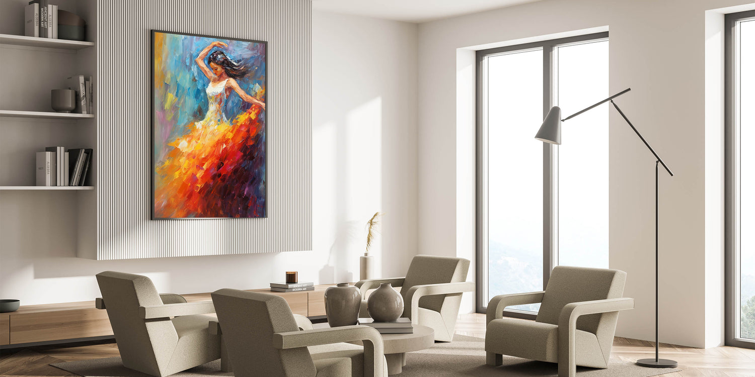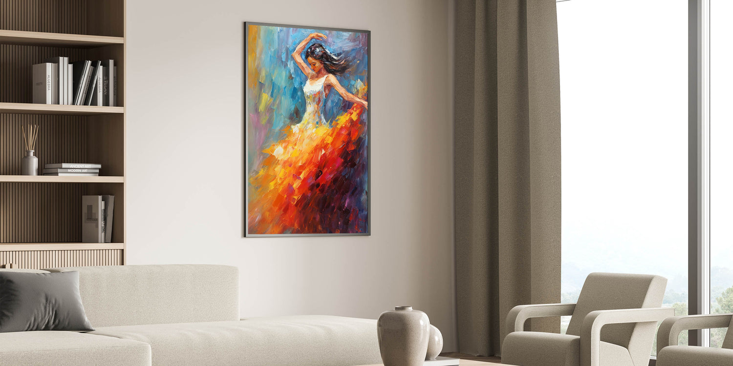 Add a vibrant touch of glam style to your home with this stunning piece of chic wall art. Featuring an elegant dancer in mid-motion, the bold combination of orange, red, and blue colors creates a captivating blend of energy and elegance. This luxurious artwork brings a sophisticated accent to any modern glam decor setting, making it a perfect choice for your glamorous home interiors.