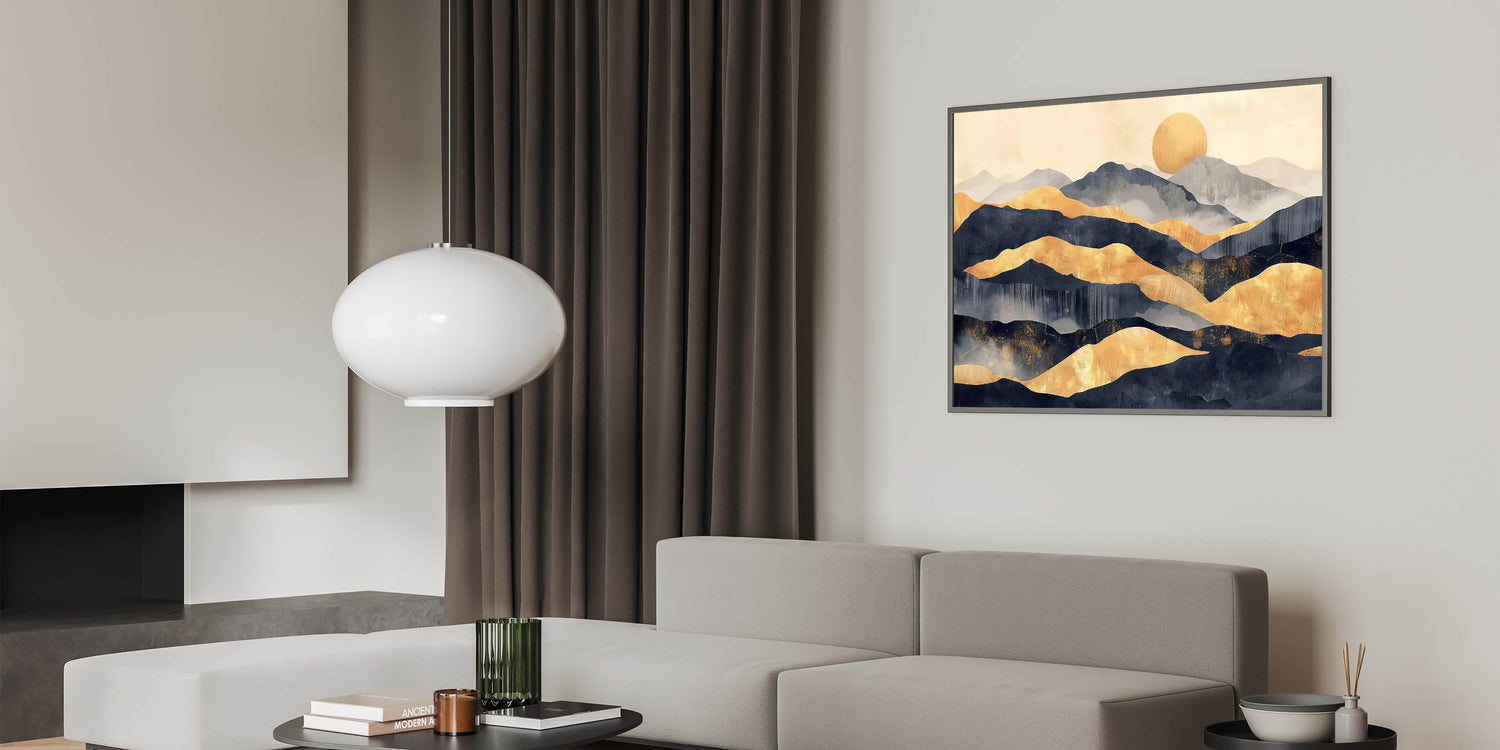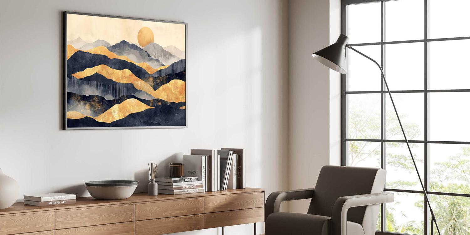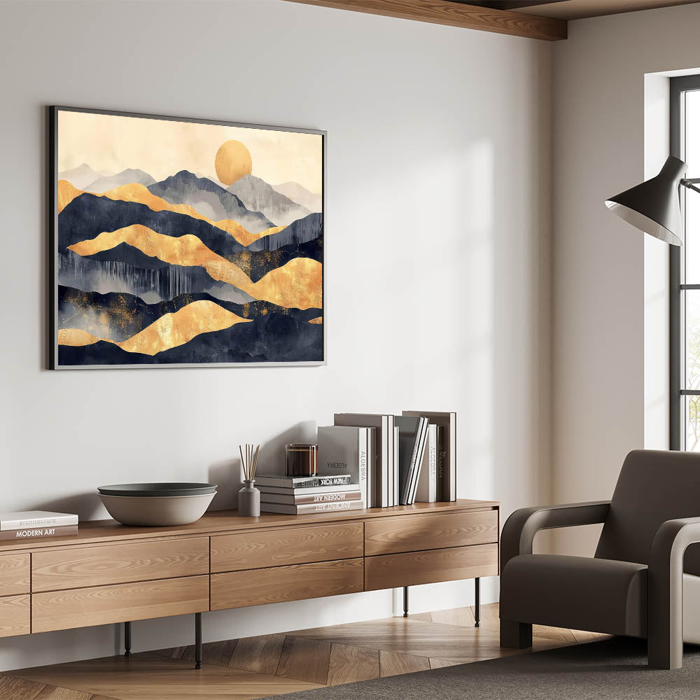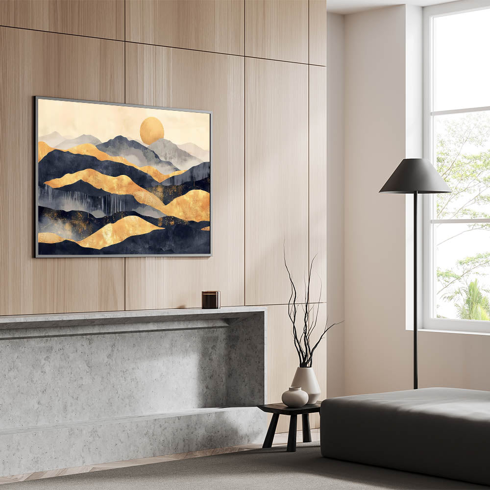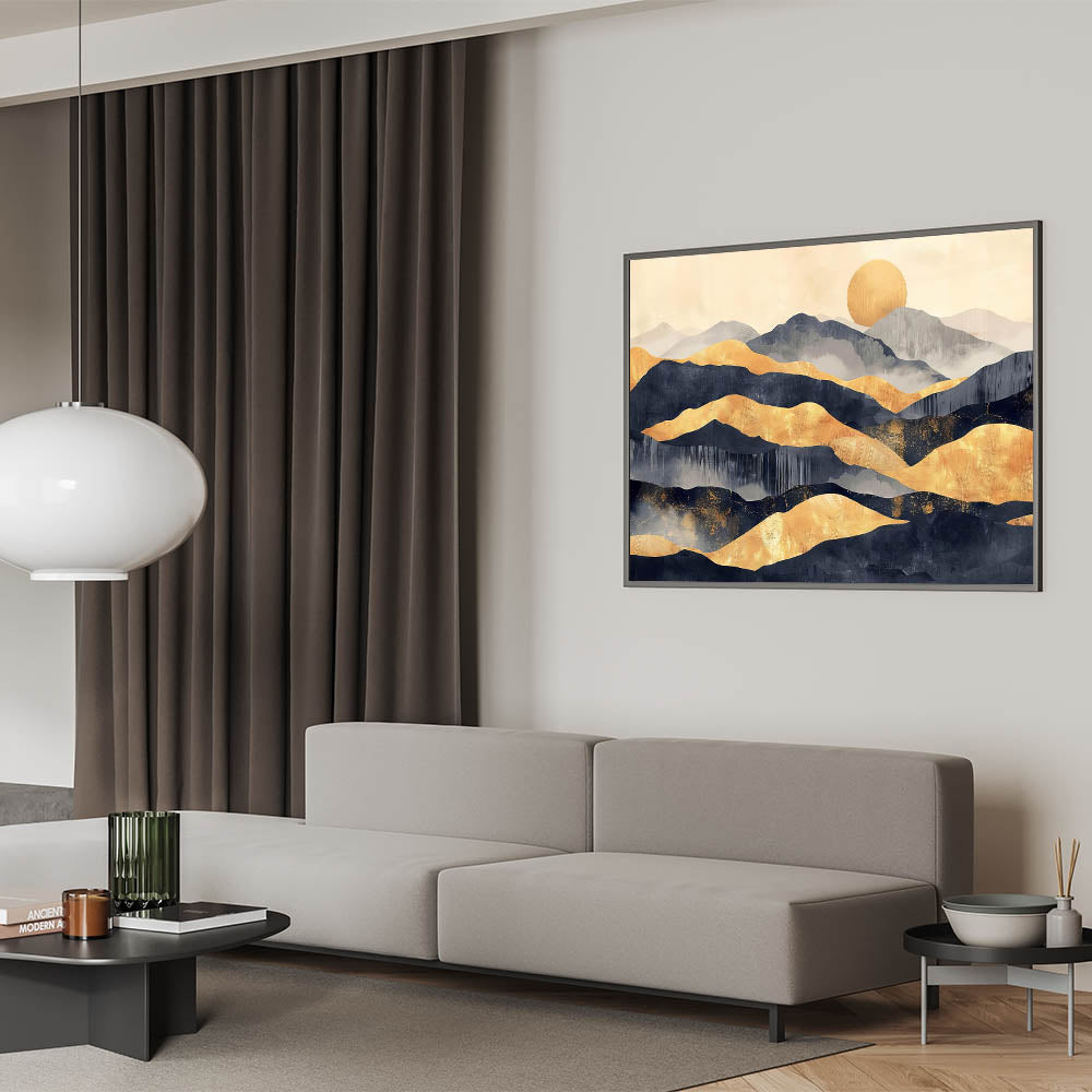 Bring the beauty of nature into your home with this glamorous golden mountain wall art. The bold design, featuring sweeping gold accents against rich dark tones, offers a perfect balance of modern glam and natural inspiration. This luxurious artwork captures the essence of a golden sunrise over a mountainous landscape, making it the ideal focal point for your living room, bedroom, or office.