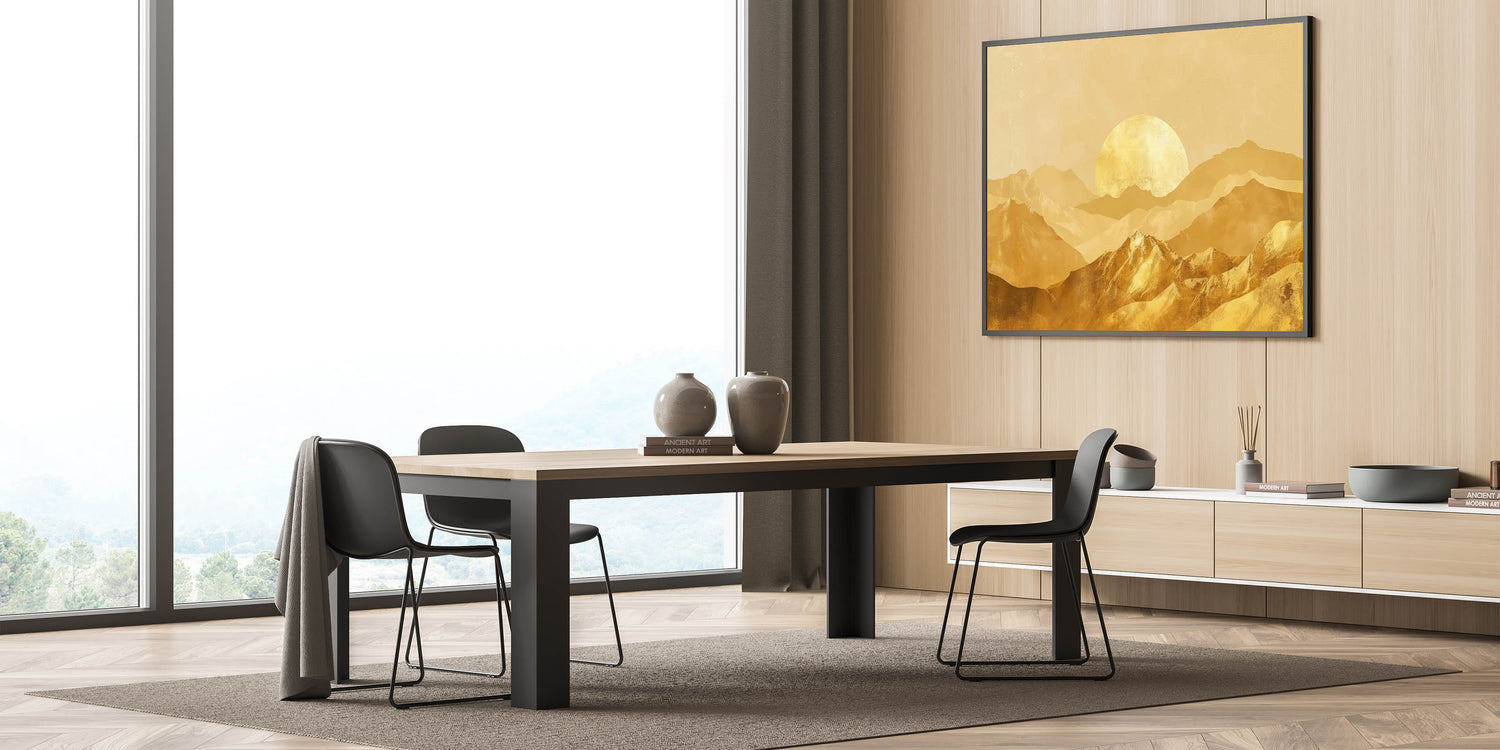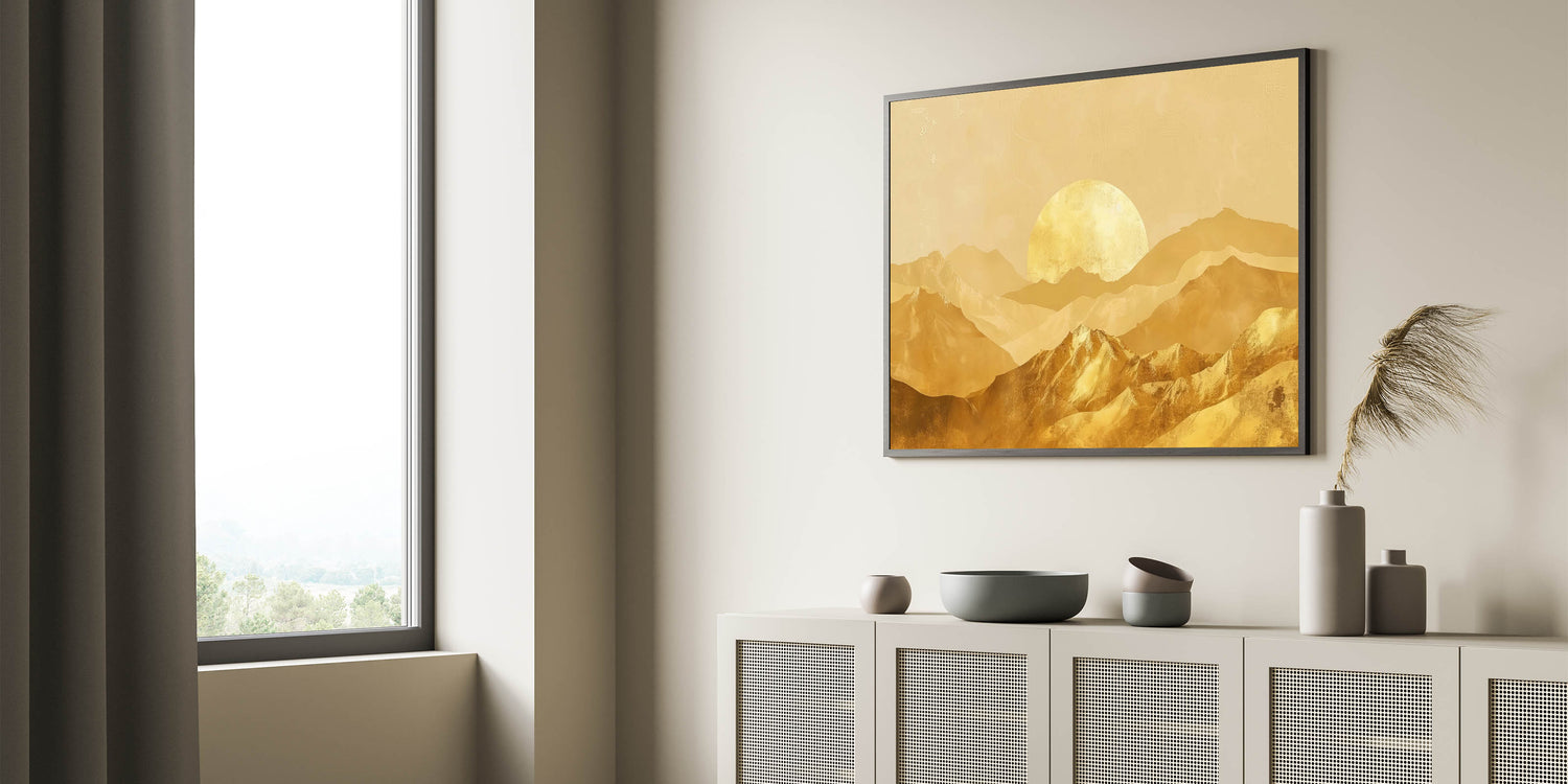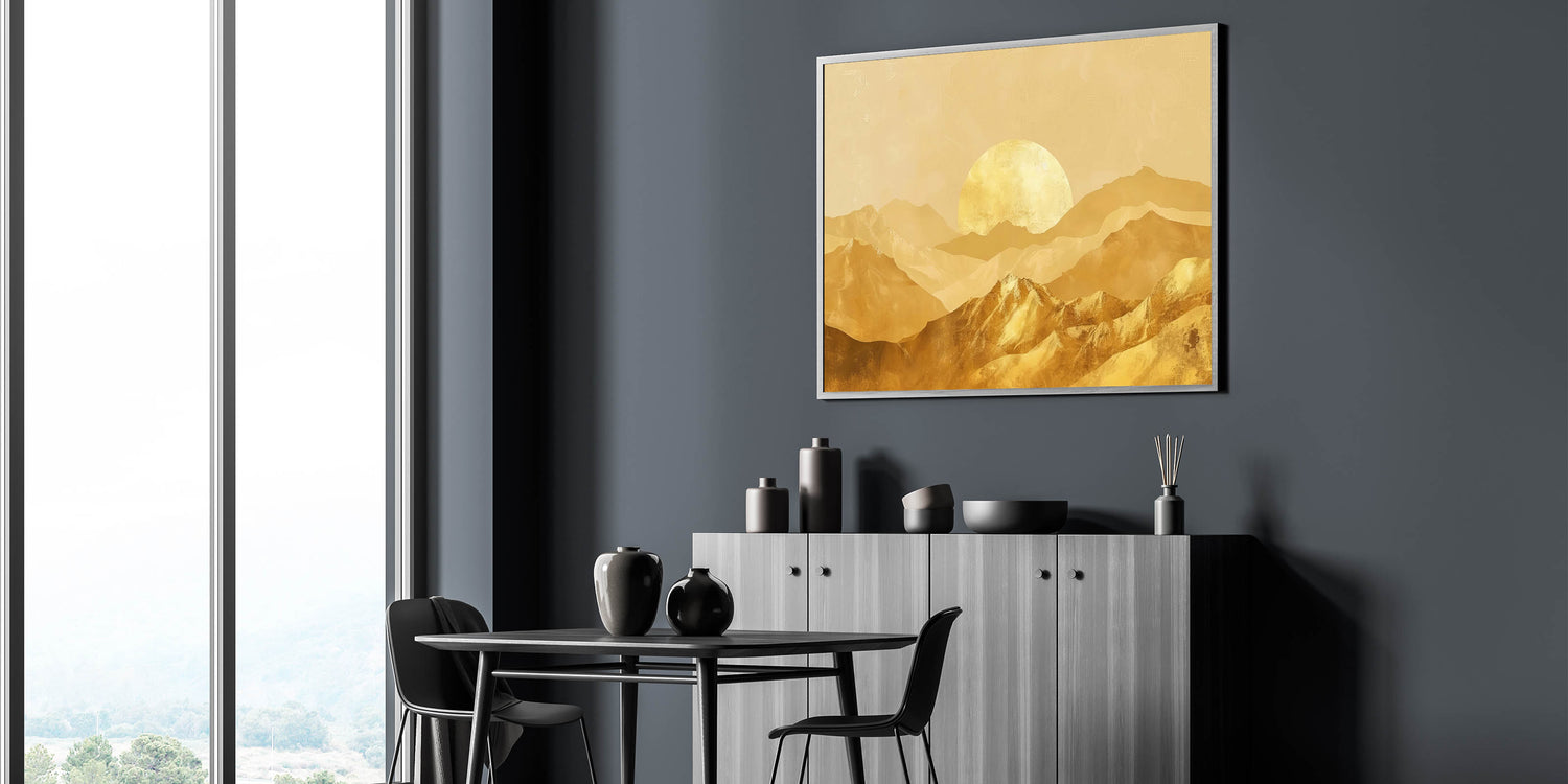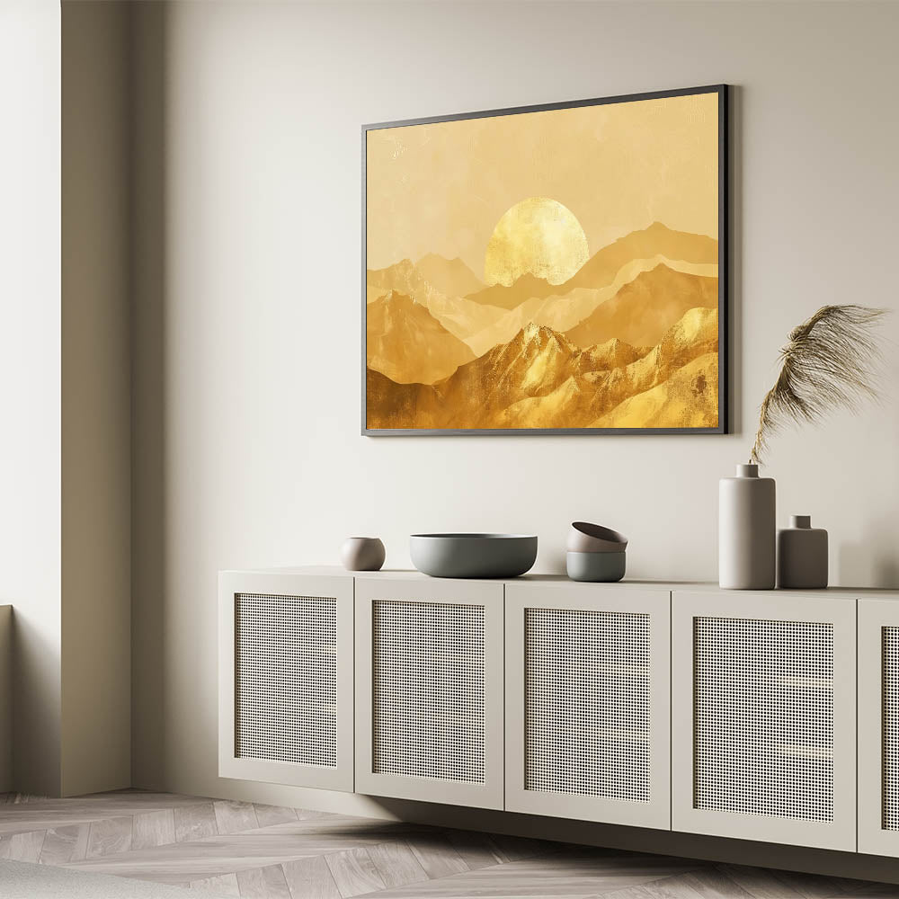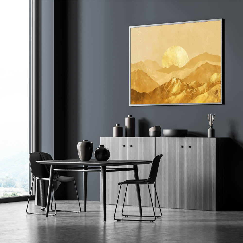 Bring the warmth and elegance of a golden sunrise into your home with this stunning golden mountain landscape wall art. The soft, shimmering golden tones create a peaceful yet opulent atmosphere, making this piece perfect for adding sophistication to any room. Whether you're decorating your living room, bedroom, or office, this artwork offers a beautiful blend of nature and modern glam style.