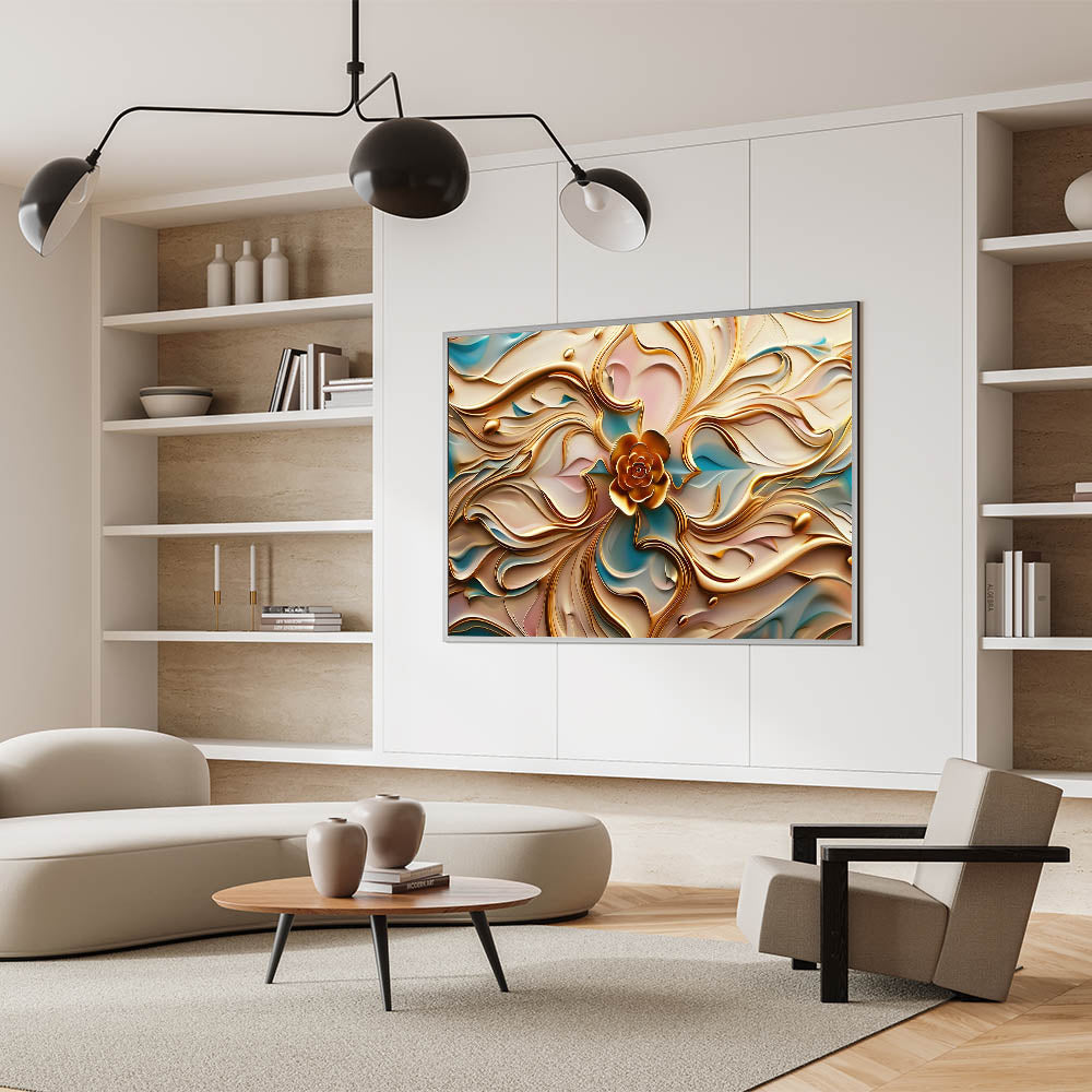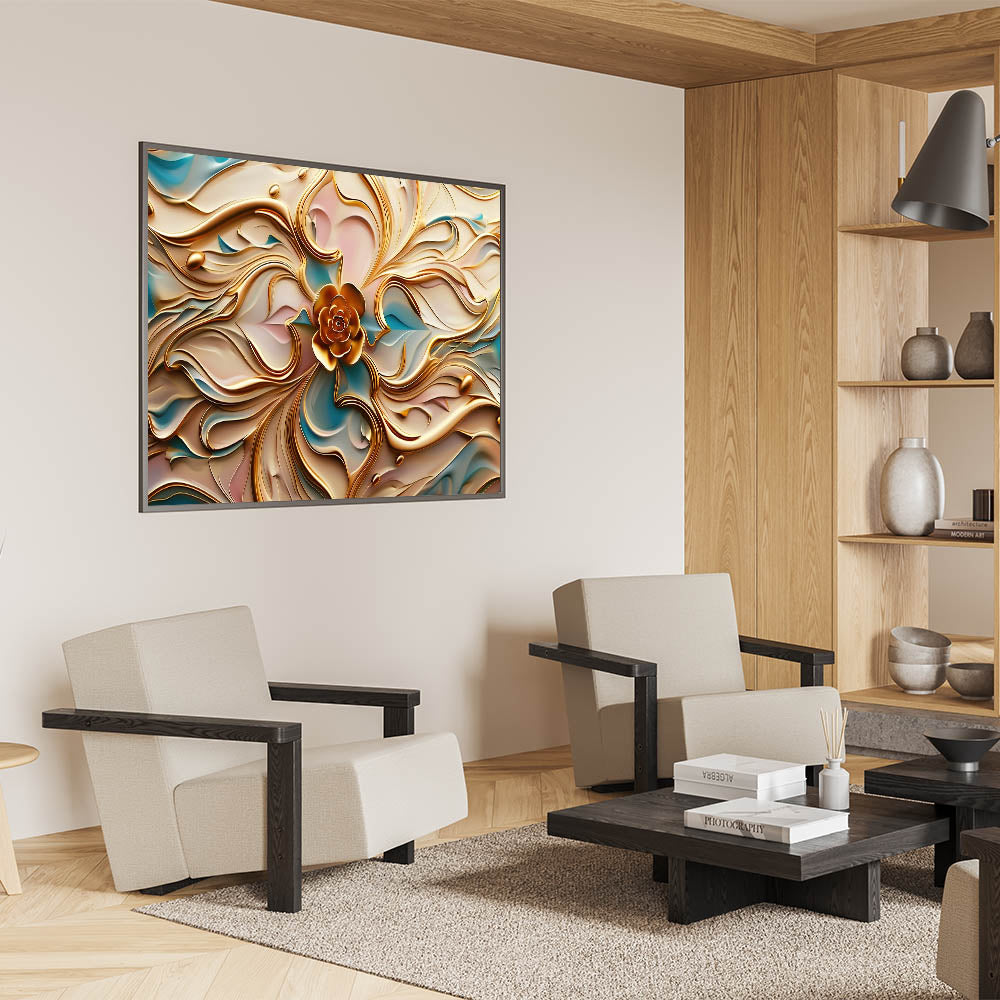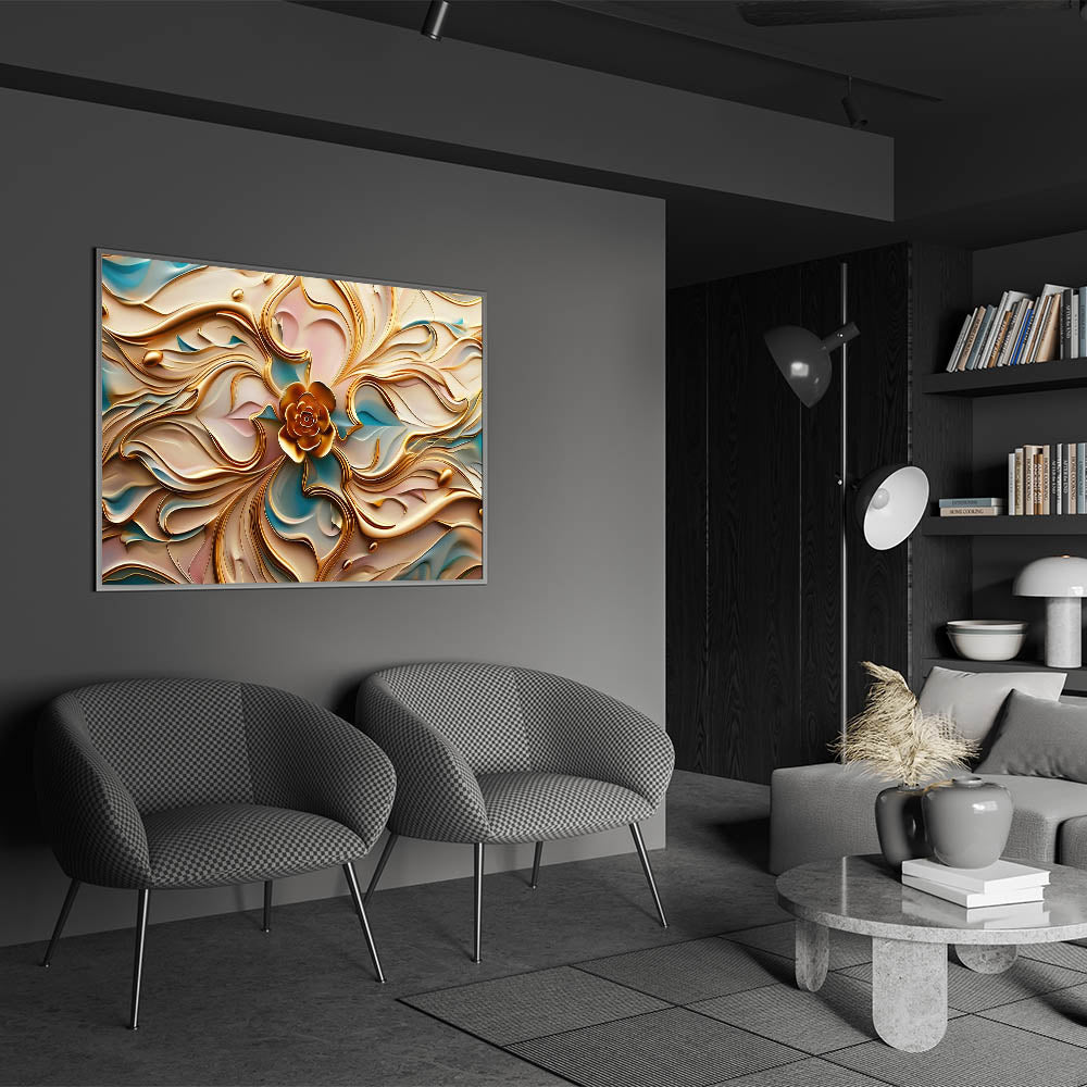 Elevate your home decor with this breathtaking pastel and gold abstract floral wall art. The intricate floral patterns, highlighted with flowing golden accents, create a sense of elegance and opulence that perfectly complements any modern glam interior. The soft pastel tones bring a soothing element to the design, while the bold gold detailing adds a touch of luxury and sophistication. This artwork is perfect for enhancing living rooms, bedrooms, or office spaces with its chic and refined aesthetic.
