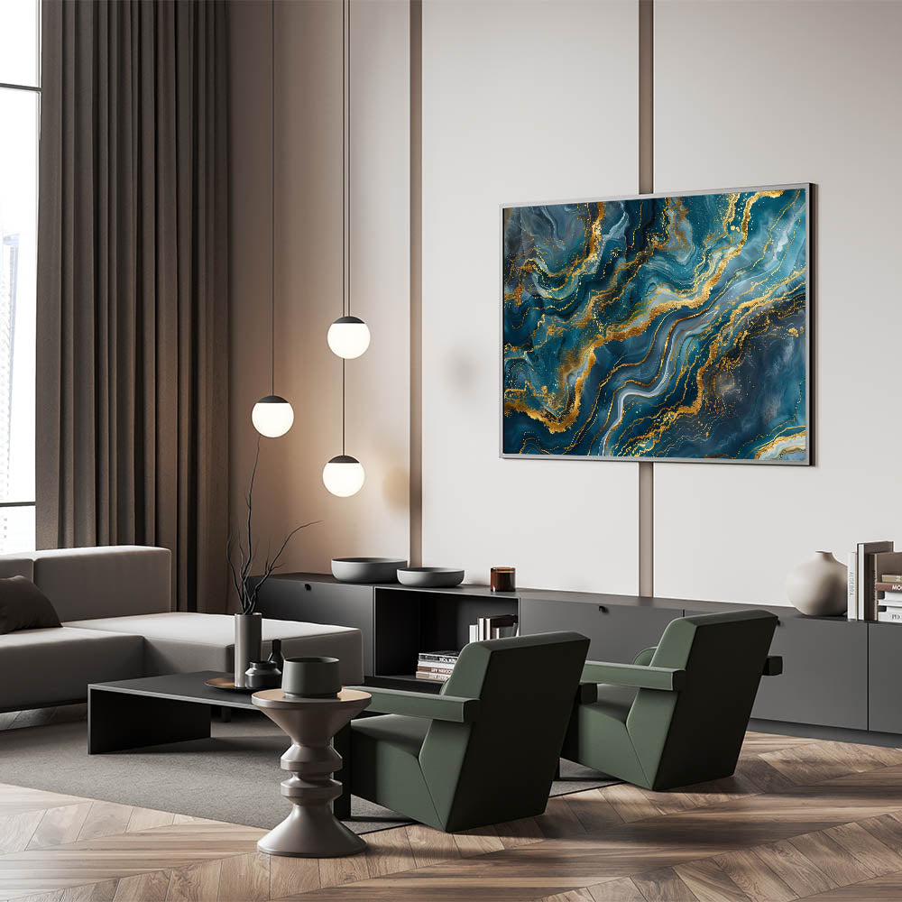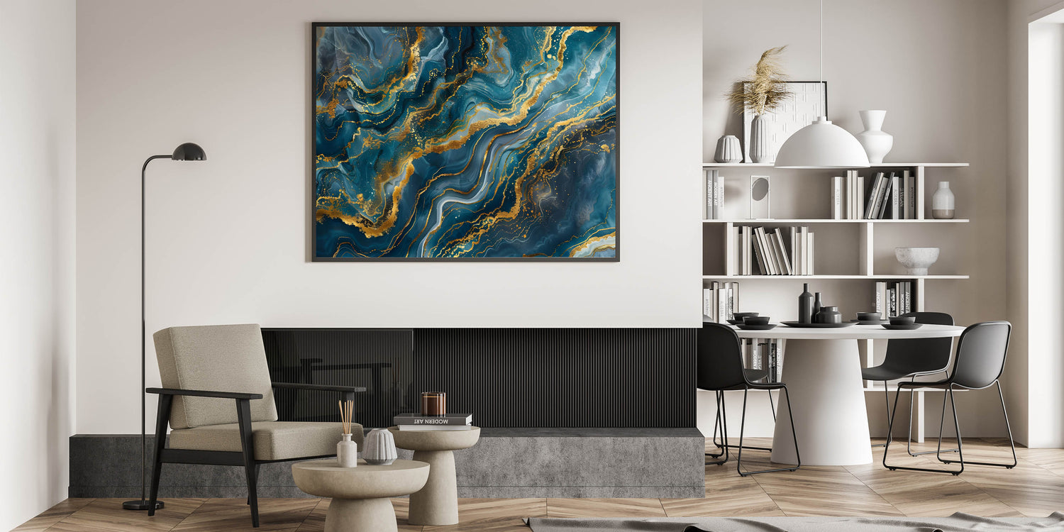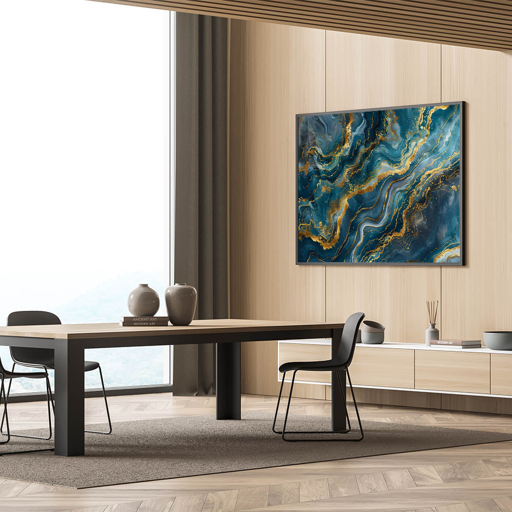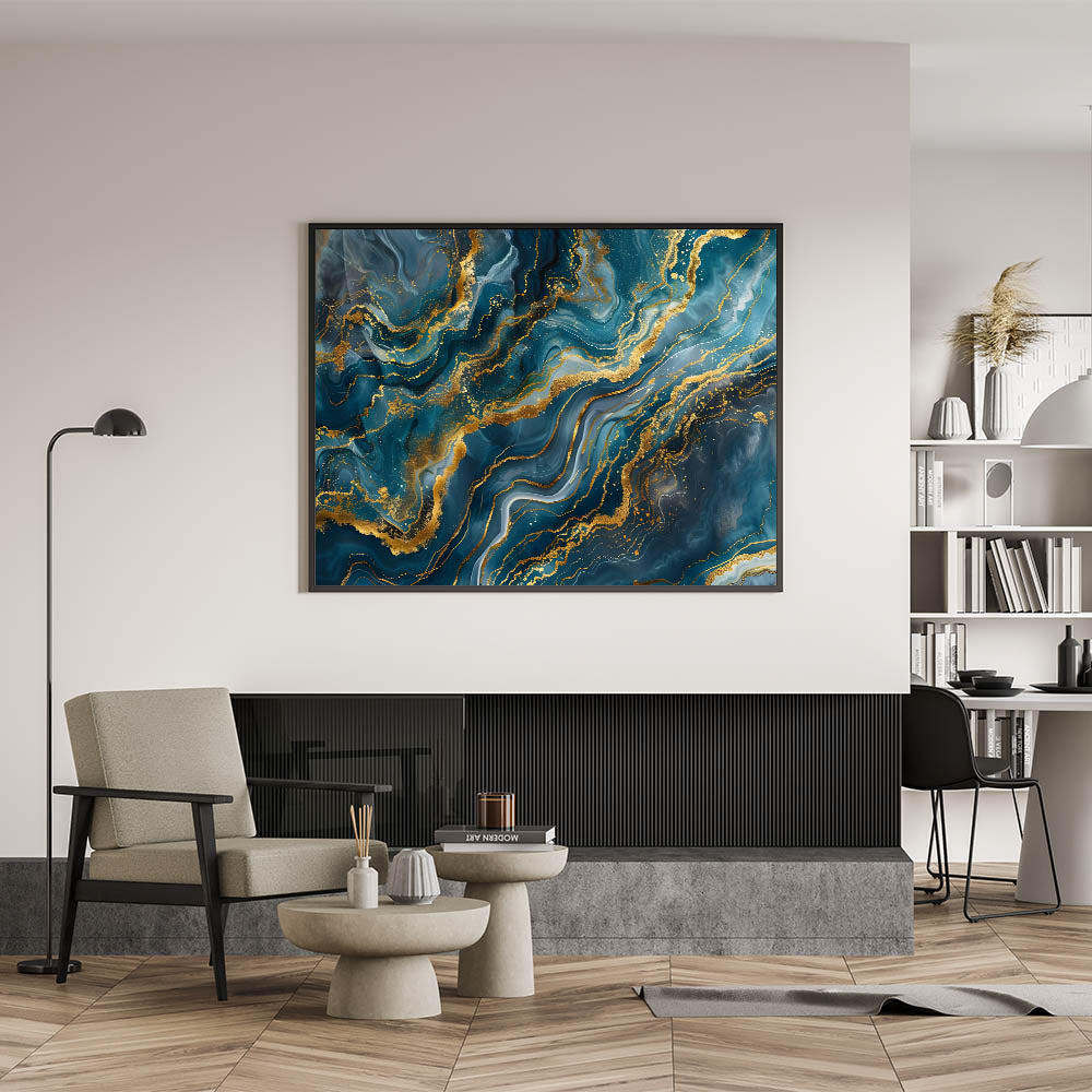 Infuse your home with elegance and sophistication with this stunning teal and gold abstract wall art. The rich, swirling teal hues combined with shimmering gold accents create a captivating modern glam piece that will instantly elevate the look of any room. Whether you're decorating your living room, bedroom, or office, this luxurious artwork adds a bold and opulent touch to your decor.