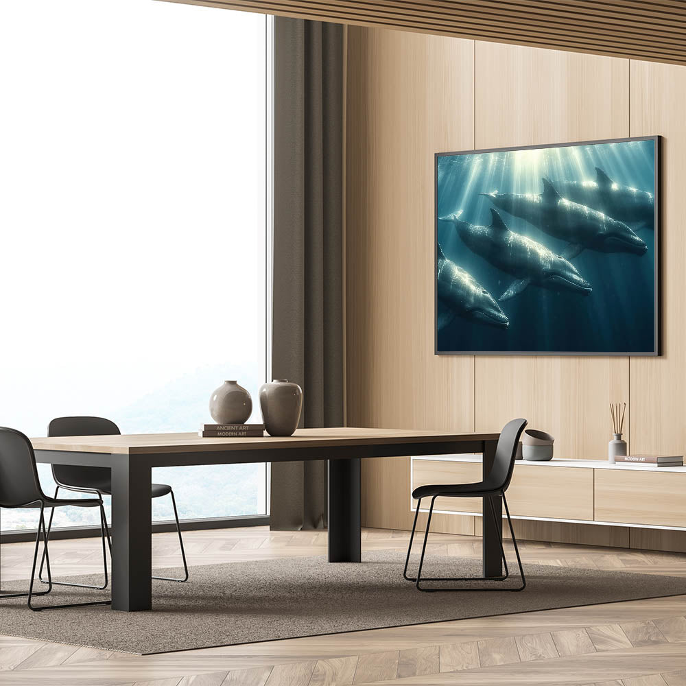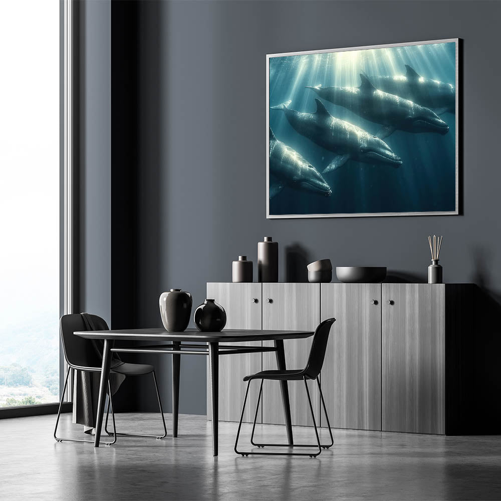 Dive into the serene beauty of the ocean with this captivating glam wall art, featuring a majestic pod of whales gliding through shimmering waters. This luxurious and sophisticated art piece showcases metallic hues and sleek, modern glam styling, making it the perfect addition to your glamorous home decor. Whether you're decorating a living room, bedroom, or office space, this opulent artwork will bring a sense of tranquility and elegance to your interiors.