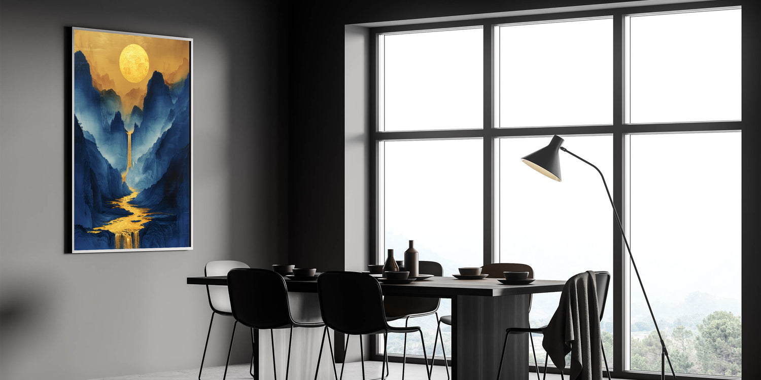 - Bold Design: The golden sun and flowing waterfalls against deep blue mountains add a luxurious and modern glam touch.