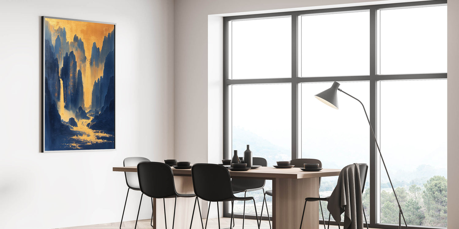 - Bold Design: Dark blue cliffs and golden waterfalls for a glamorous and modern look.