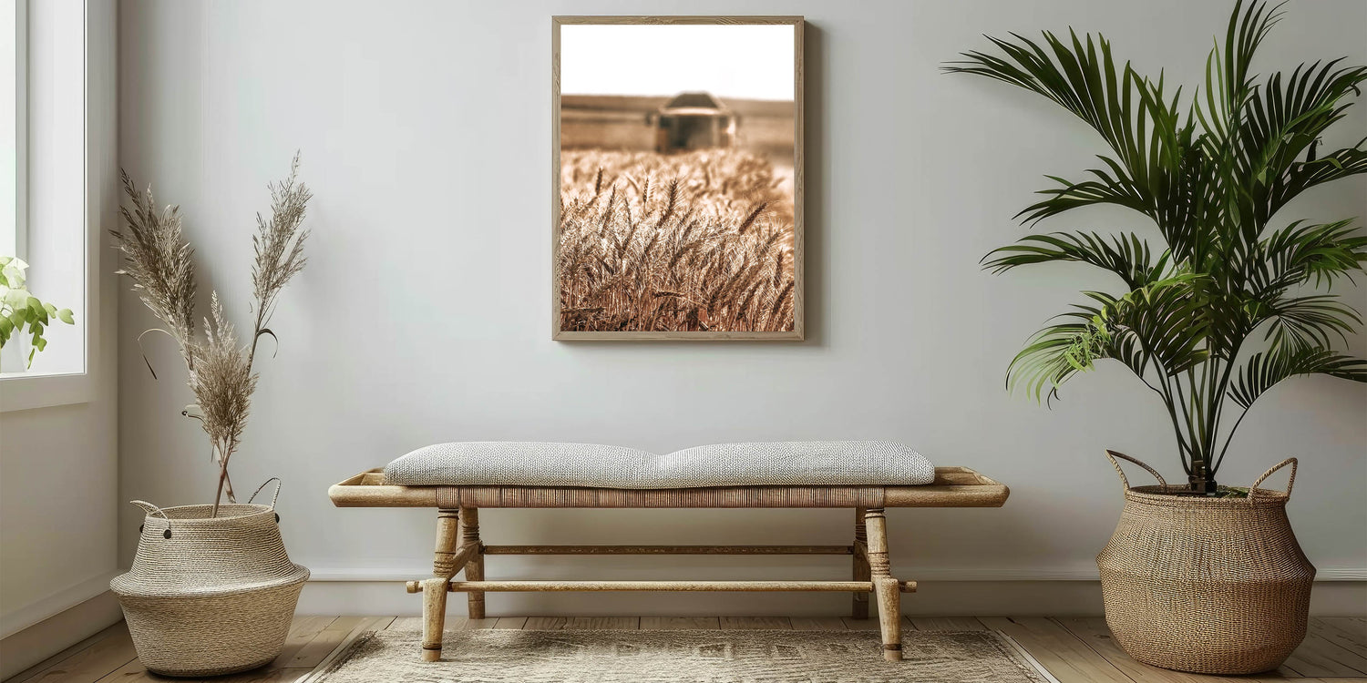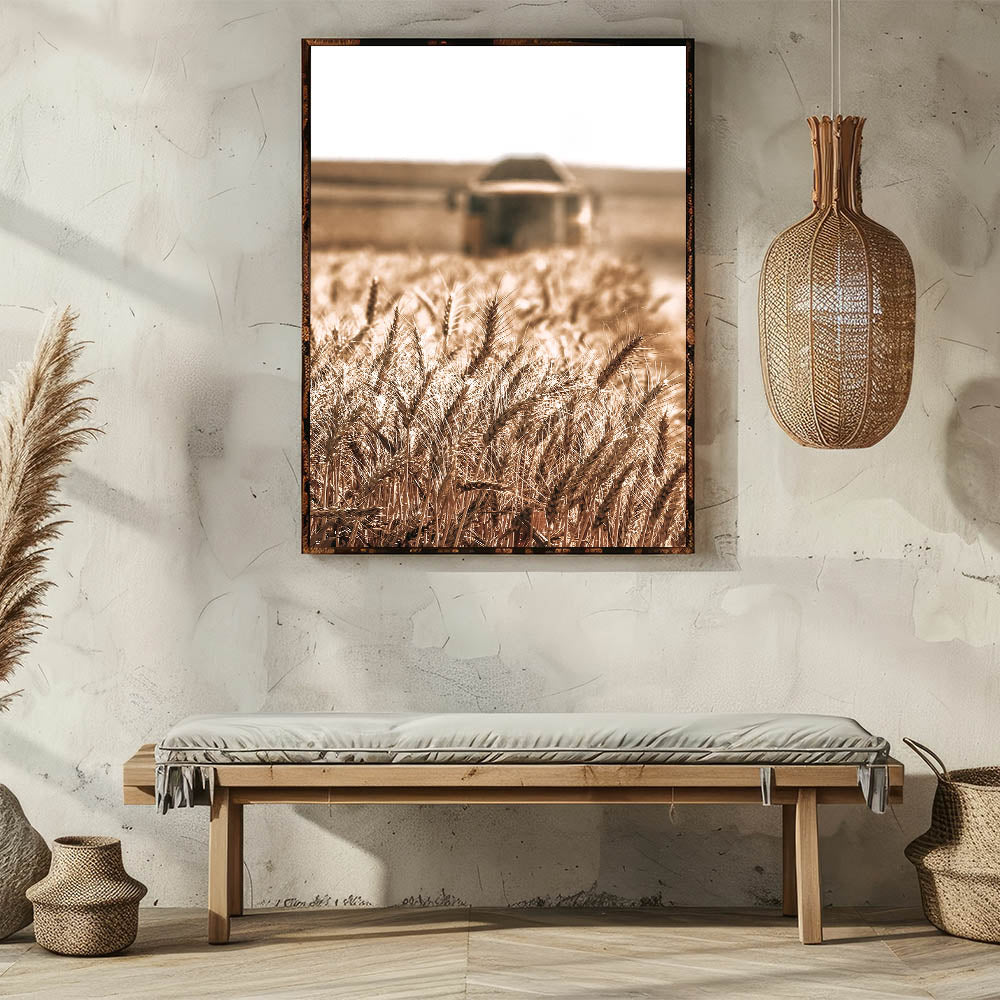 Celebrate the beauty of rural life with this stunning farmhouse wall art featuring a golden wheat field, gently kissed by the sunlight, with a combine harvester in the distance. The warm, earthy tones and intricate details of this vintage-inspired artwork bring a sense of rustic charm to any room. Perfect for adding a touch of nature’s beauty to your farmhouse or country-style decor, this piece embodies the simple elegance of agricultural life and the antique farmhouse aesthetic.