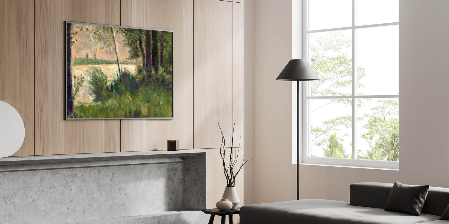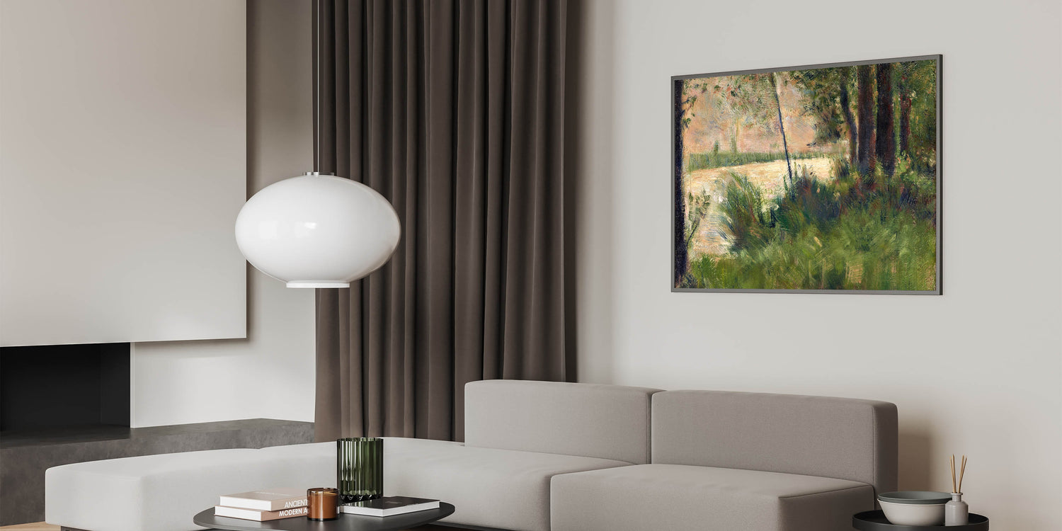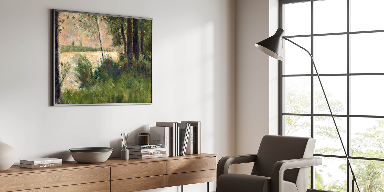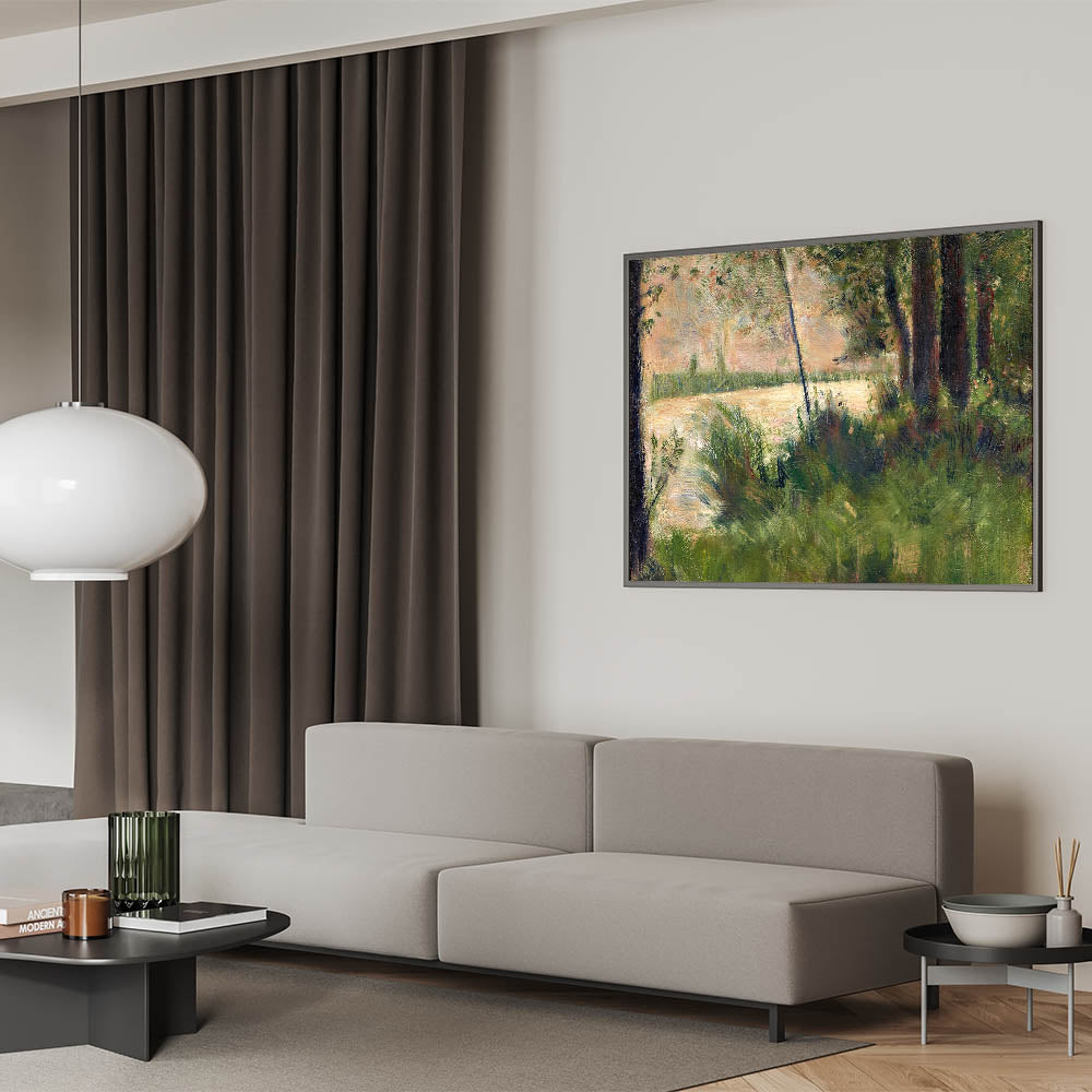 This landscape’s blend of rich greens, earthy browns, and gentle light captures the essence of a peaceful riverside. Seurat’s Impressionist style adds a layer of sophistication, making this piece a timeless choice for anyone looking to bring a sense of nature’s calm into their home.