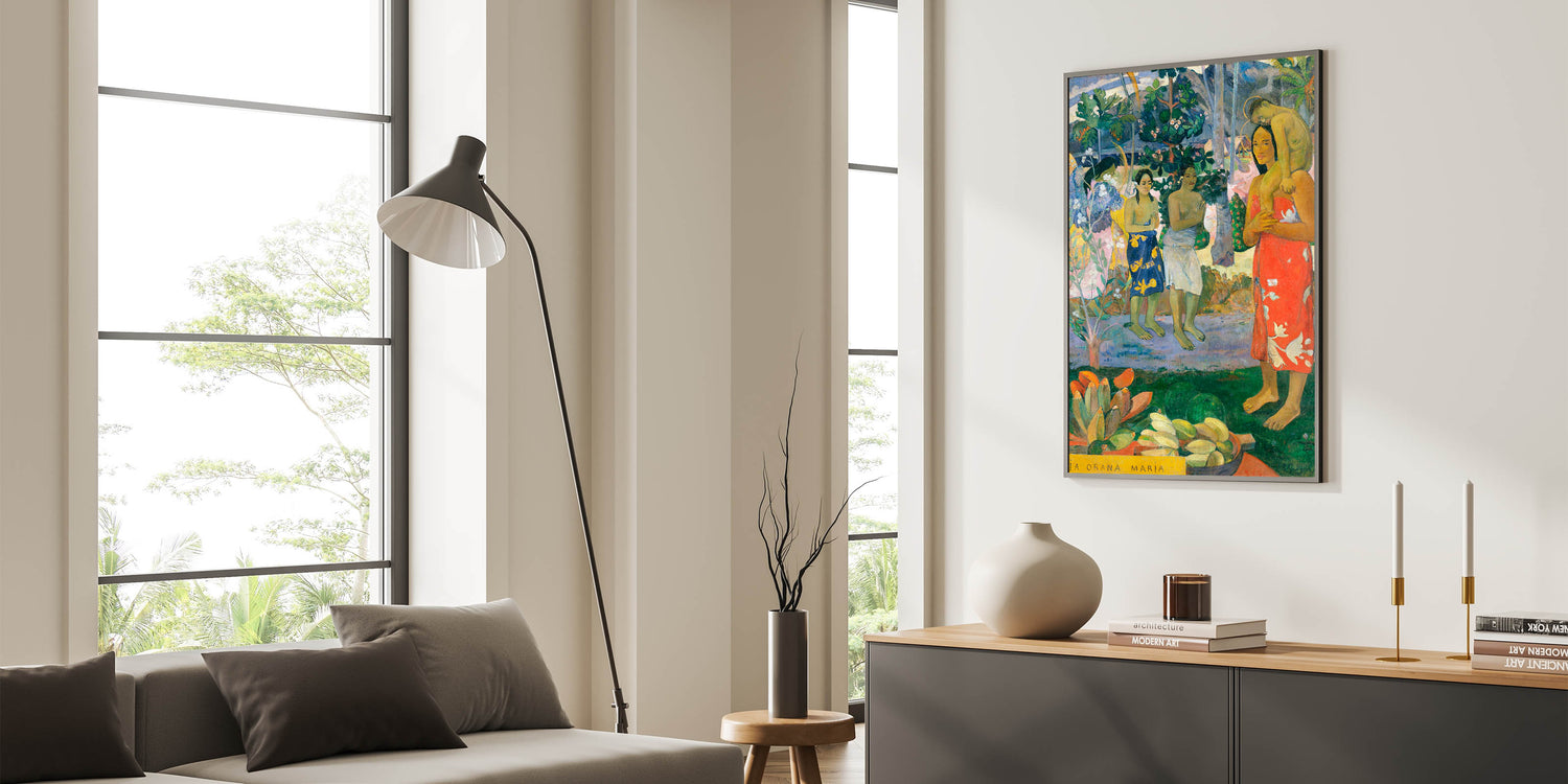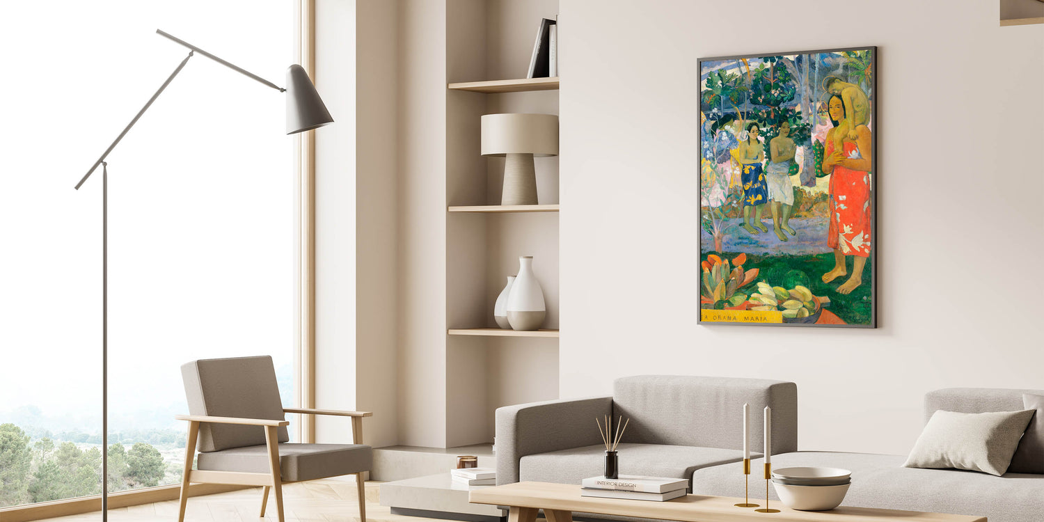 Bring the vibrant colors and spiritual essence of Tahitian culture into your space with Paul Gauguin's Hail Mary (Ia Orana Maria). This iconic painting captures a unique interpretation of the Virgin Mary and Jesus, set against a lush, tropical backdrop with vibrant details and a warm color palette. Gauguin’s post-impressionist style comes to life through rich greens, blues, and vivid reds, making this piece a captivating addition to modern interiors. Ideal for art lovers and those looking to add a touch of cultural diversity to their decor, this artwork blends spiritual themes with Gauguin’s fascination with Tahitian life.