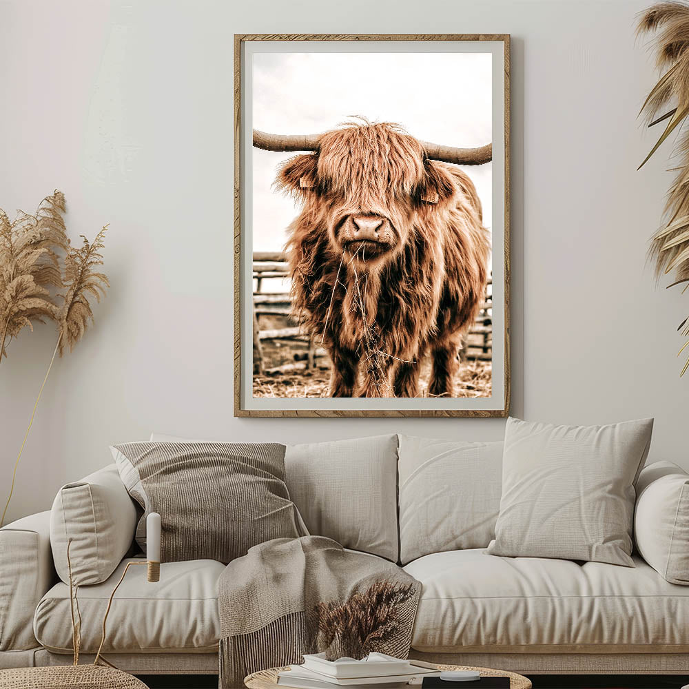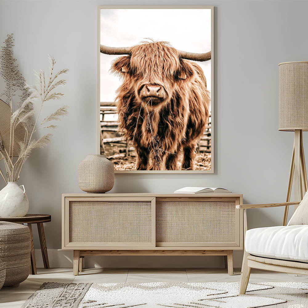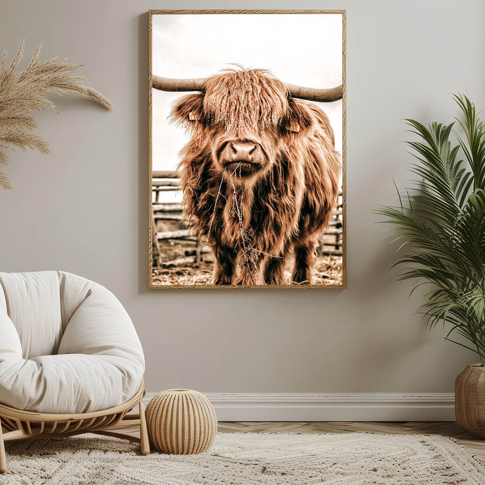Embrace the rustic charm of farm life with this stunning Highland cow wall art. Perfect for those looking to bring a touch of country living into their home, this vintage-inspired artwork features a close-up of a majestic Highland cow, known for its unique shaggy fur and gentle expression. The earthy tones and natural setting make it an ideal piece for any farmhouse or country-style decor.