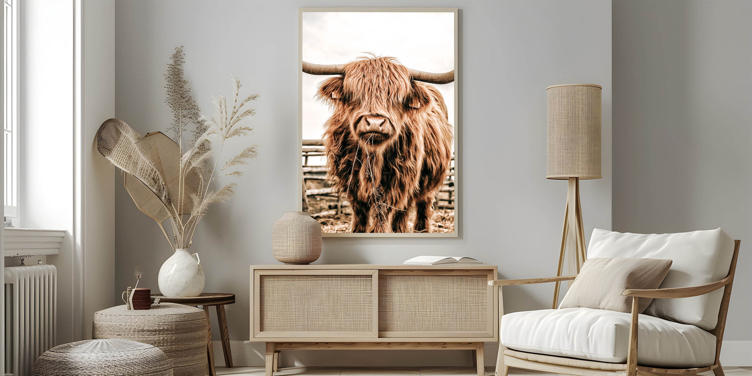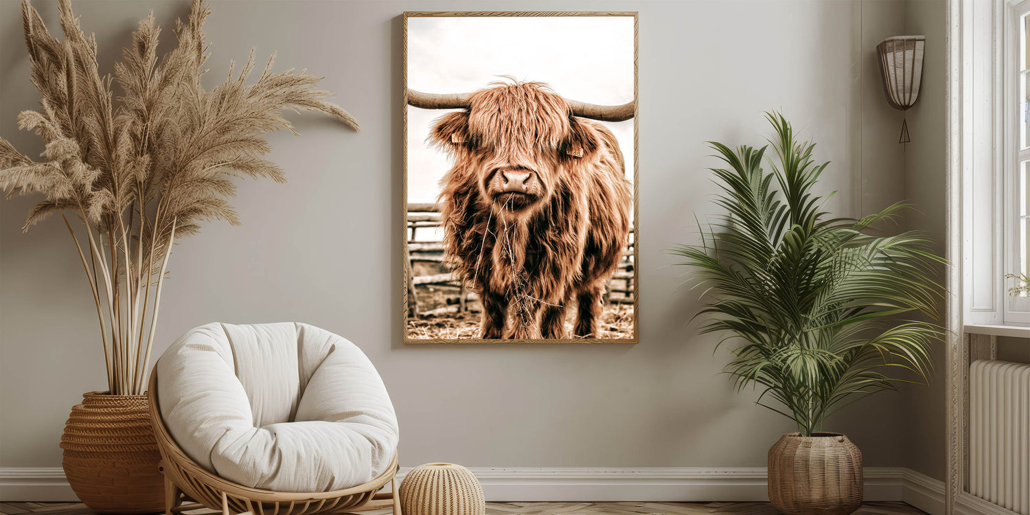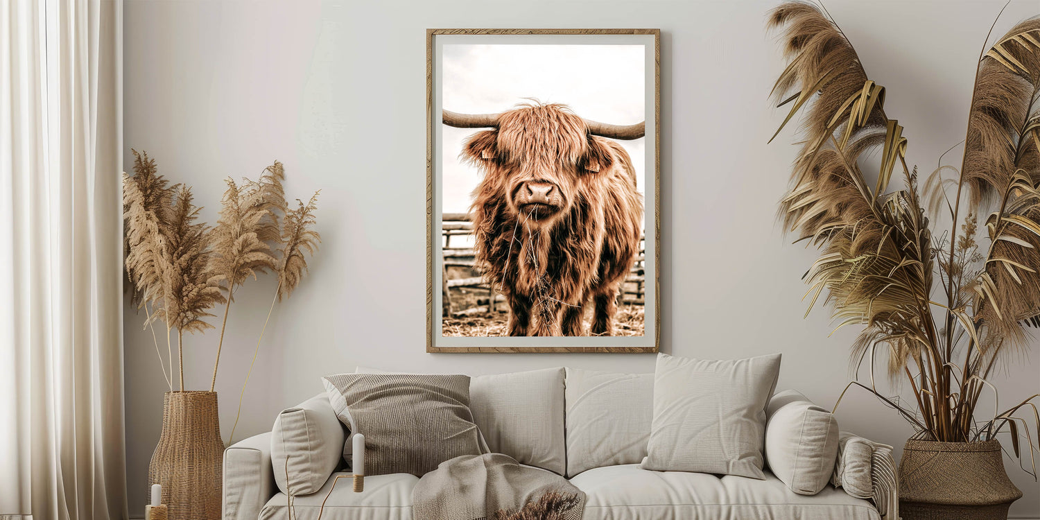 Embrace the rustic charm of farm life with this stunning Highland cow wall art. Perfect for those looking to bring a touch of country living into their home, this vintage-inspired artwork features a close-up of a majestic Highland cow, known for its unique shaggy fur and gentle expression. The earthy tones and natural setting make it an ideal piece for any farmhouse or country-style decor.