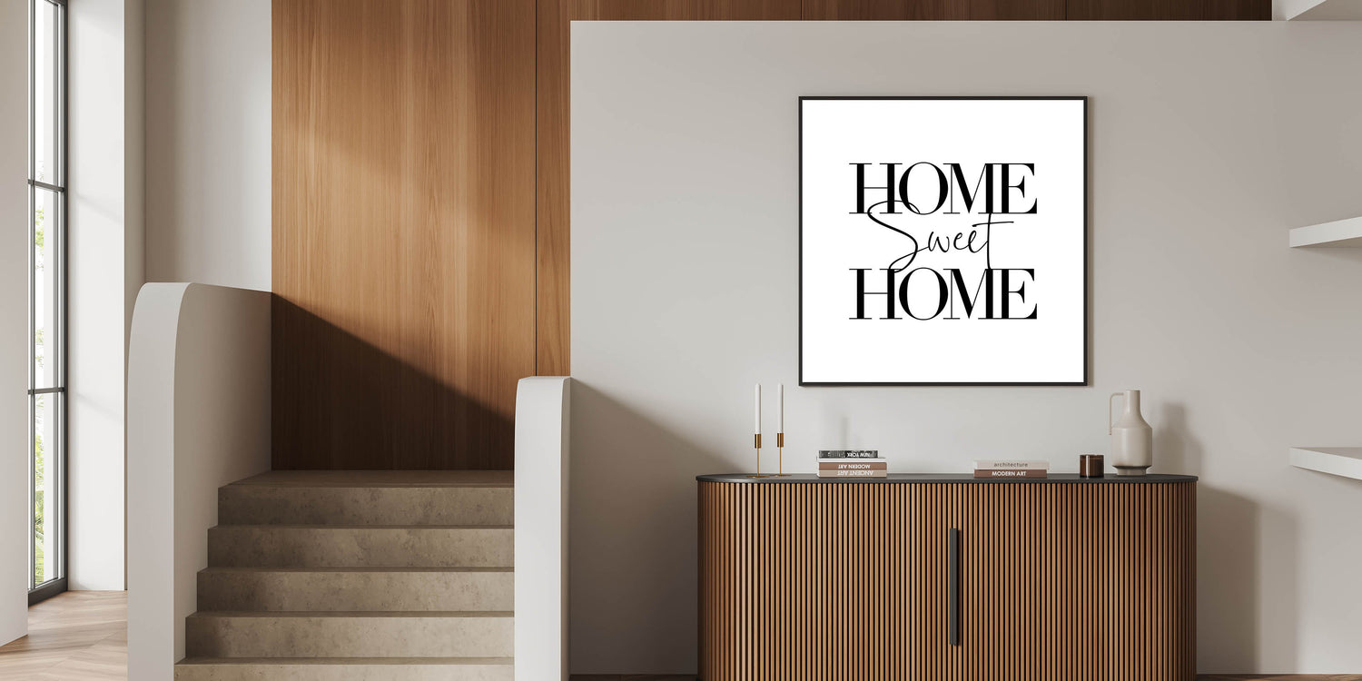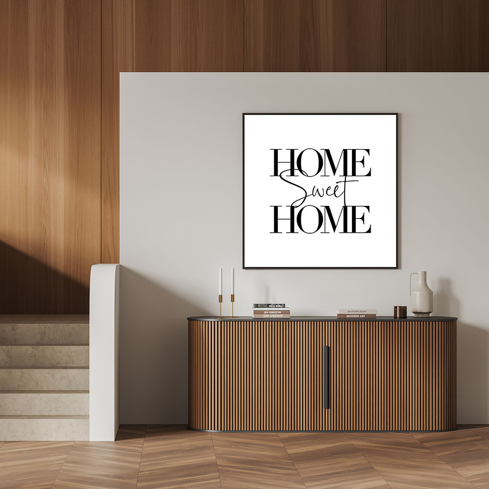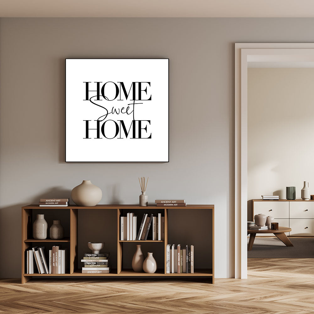 Bring warmth and elegance to your space with this "Home Sweet Home" typography wall art. Designed with a minimalist approach, this artwork features bold and stylish lettering that creates a timeless look, making it a perfect addition to any room. Ideal for modern and cozy home decor, this piece is available in various premium materials, including Stretched Canvas, Framed Canvas, Acrylic Glass, and more.