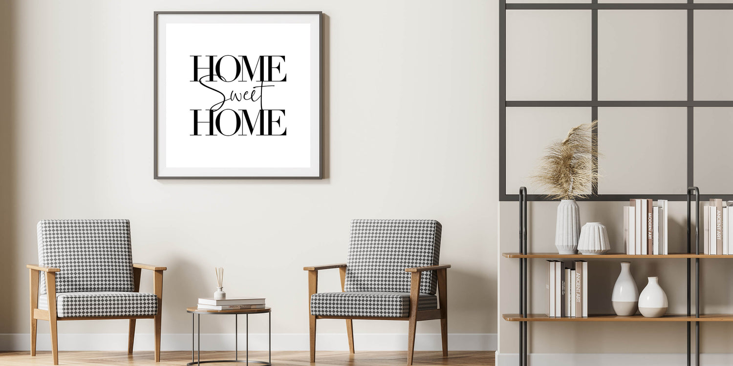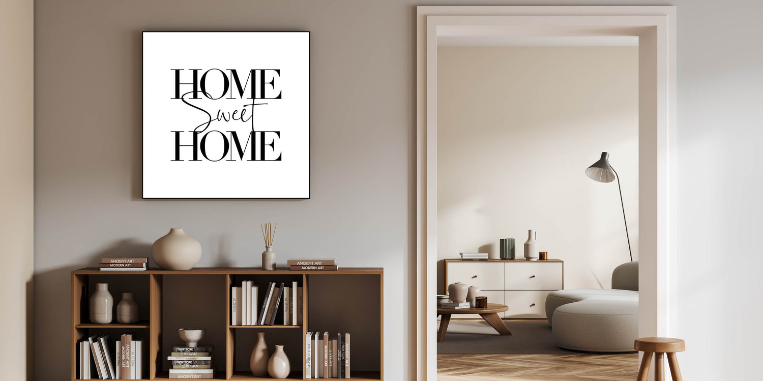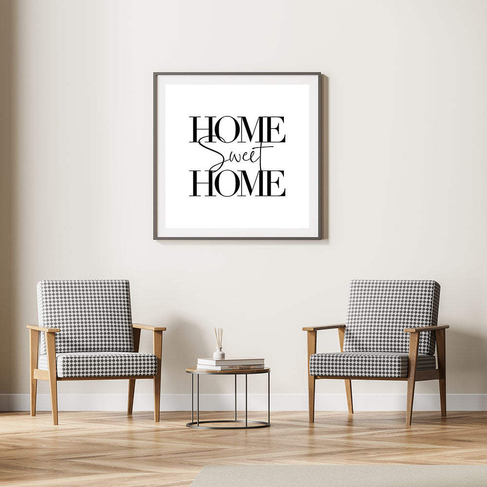 Bring warmth and elegance to your space with this "Home Sweet Home" typography wall art. Designed with a minimalist approach, this artwork features bold and stylish lettering that creates a timeless look, making it a perfect addition to any room. Ideal for modern and cozy home decor, this piece is available in various premium materials, including Stretched Canvas, Framed Canvas, Acrylic Glass, and more.