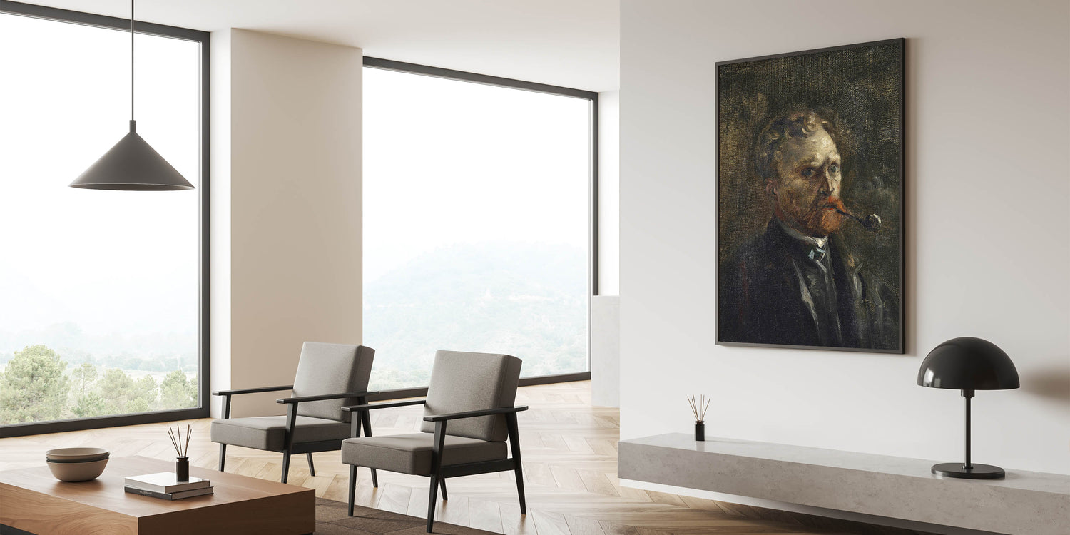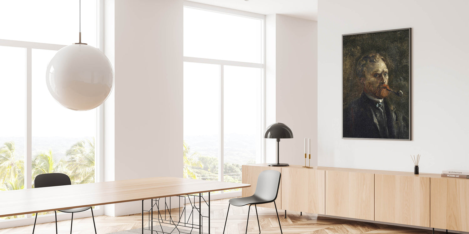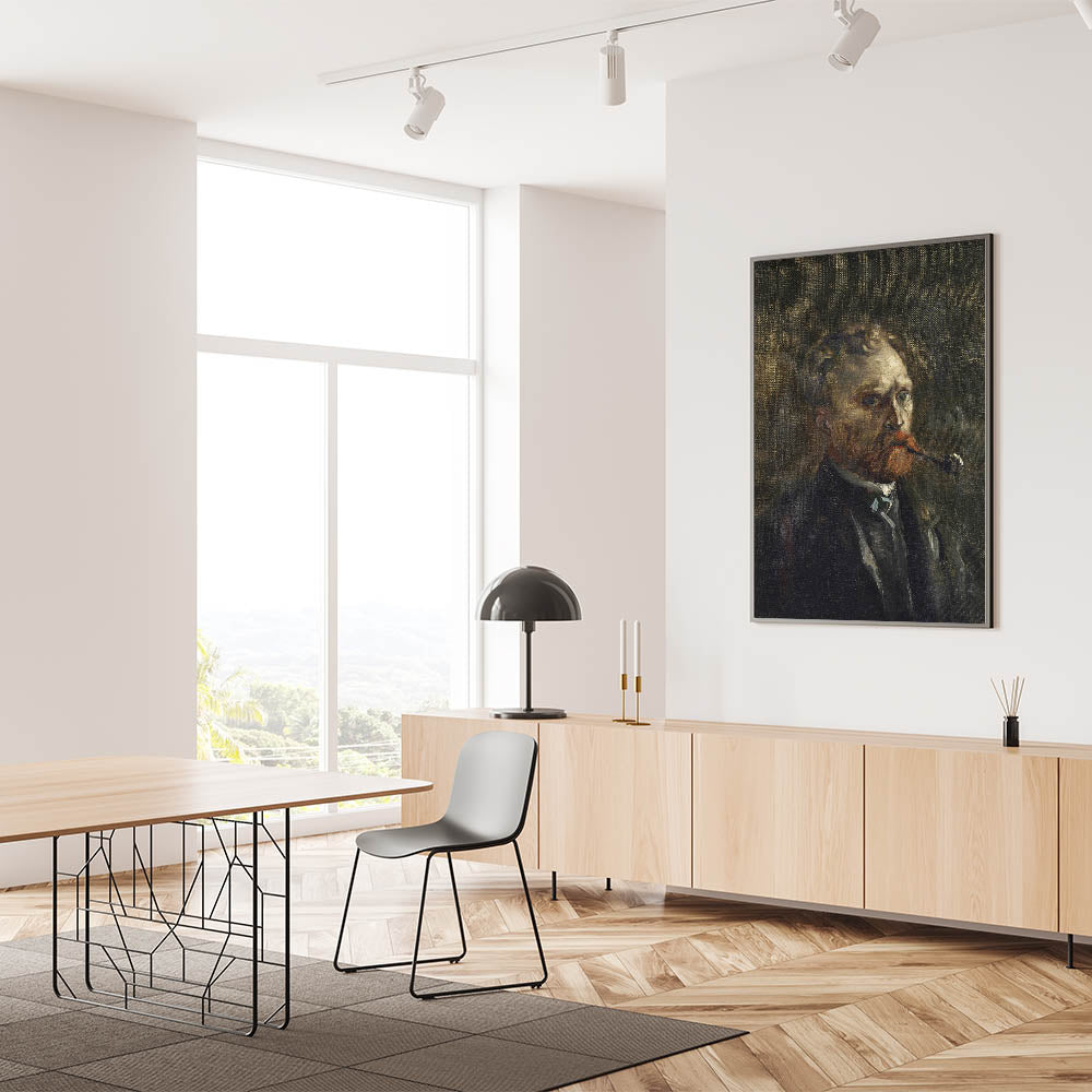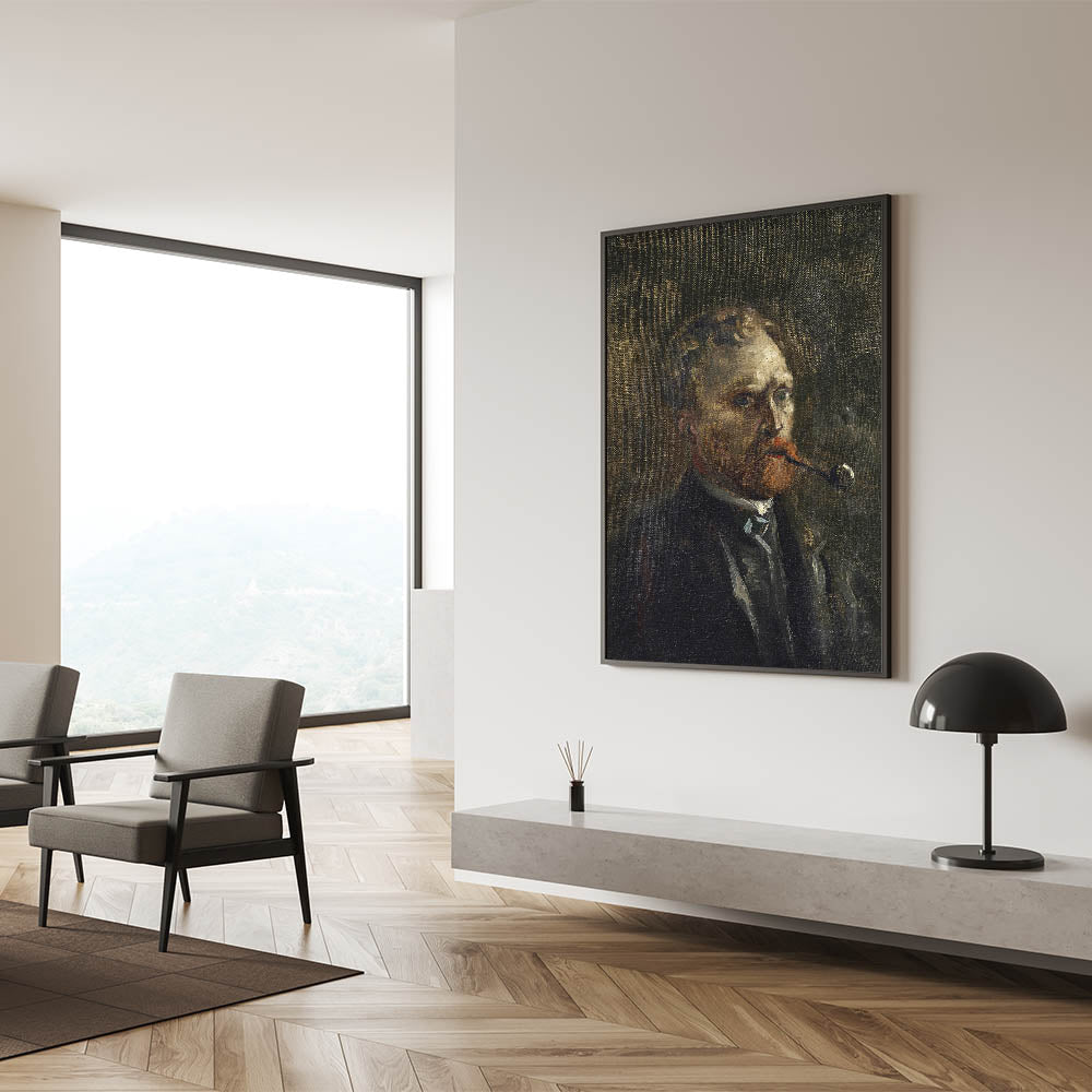 Explore the early creative genius of Vincent van Gogh with his "Self-Portrait (1886)," a striking example of his raw and evolving artistry. This moody and introspective painting features van Gogh smoking a pipe, his intense gaze set against a dark, textured background. The rich, earthy tones and expressive brushwork convey the artist's complexity and emotion, making this piece a profound addition to any space.