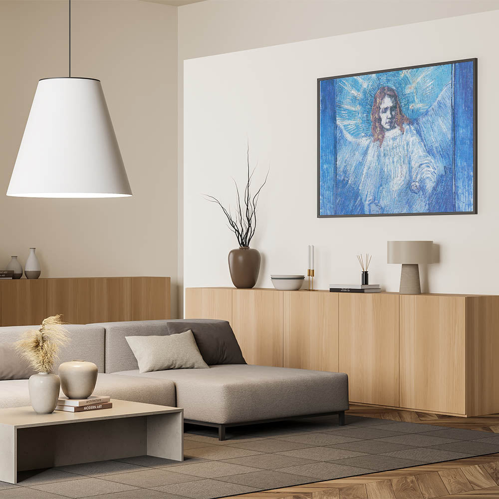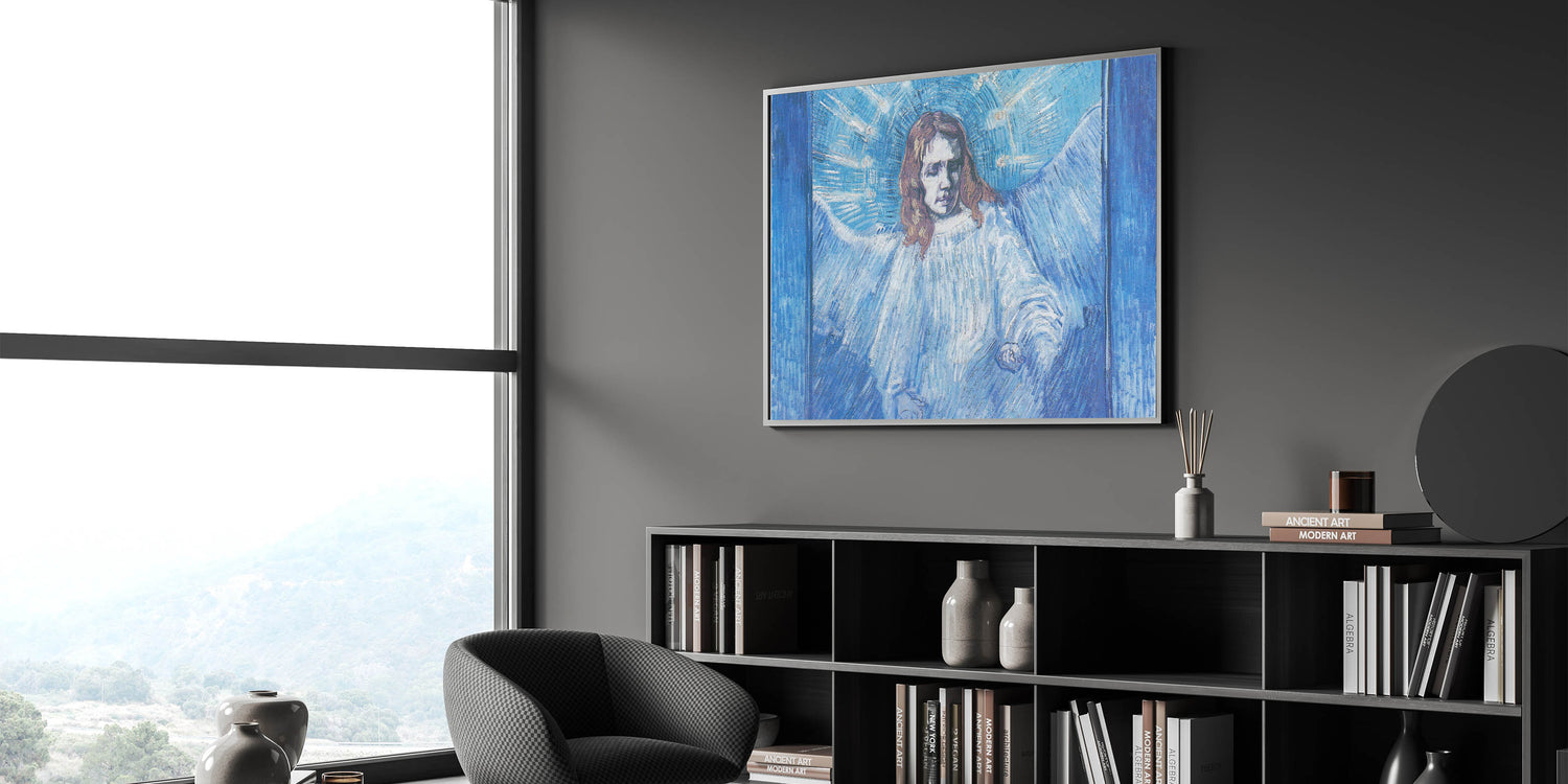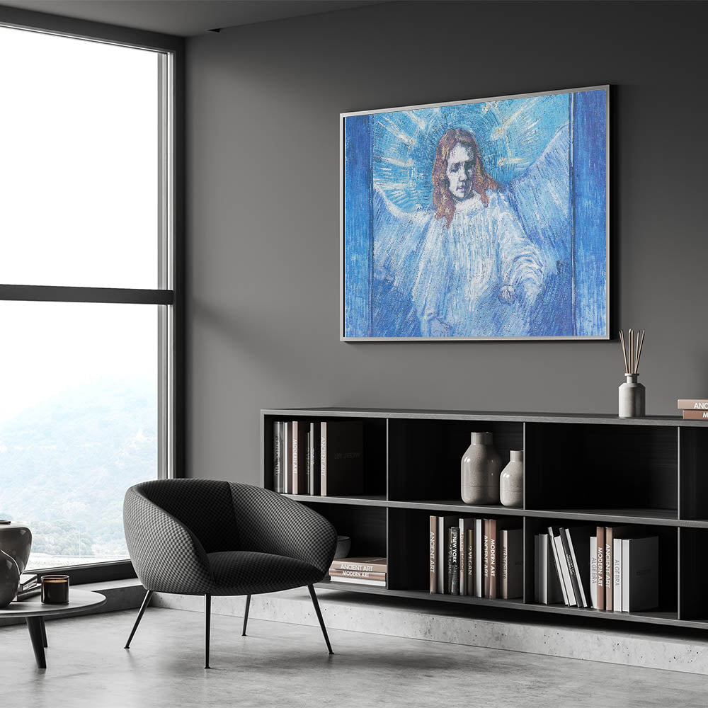 Add a touch of serenity and celestial beauty to your home with this angelic wall art, inspired by Vincent van Gogh's interpretation of Rembrandt’s angel. This exquisite piece features an ethereal angel figure, rendered in soft blue tones with radiant brushstrokes that convey a sense of divine light. The heavenly atmosphere and the angel’s gentle expression make this artwork a captivating focal point for any room.
