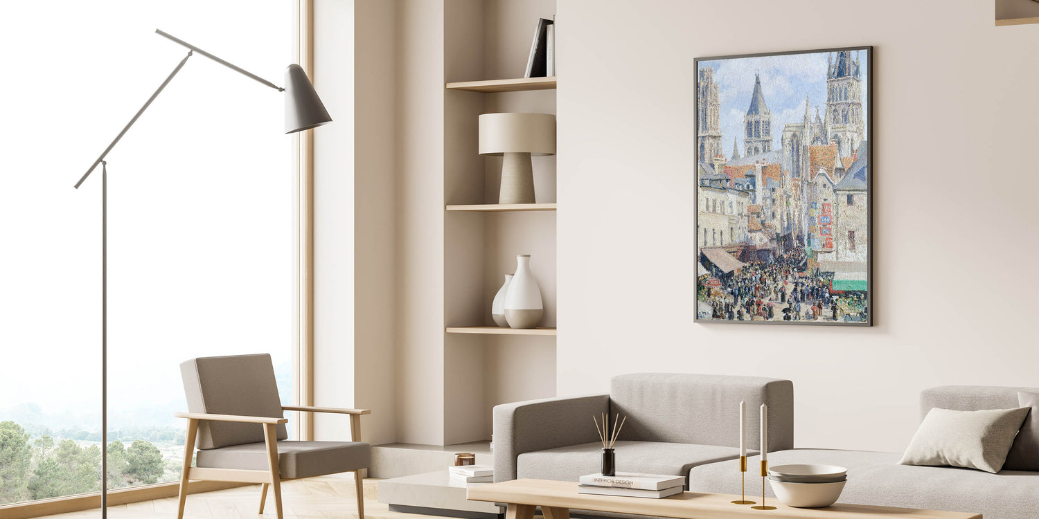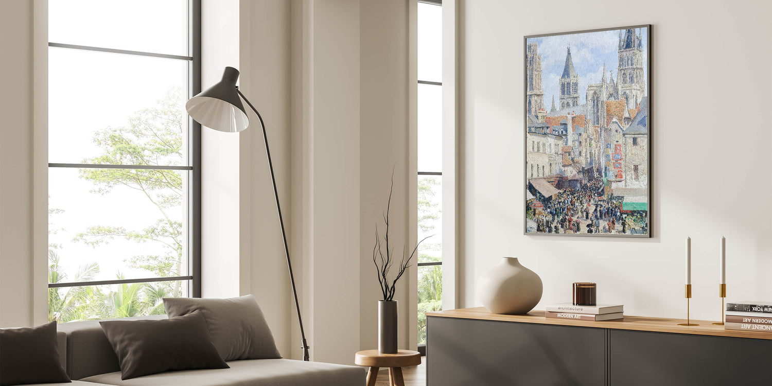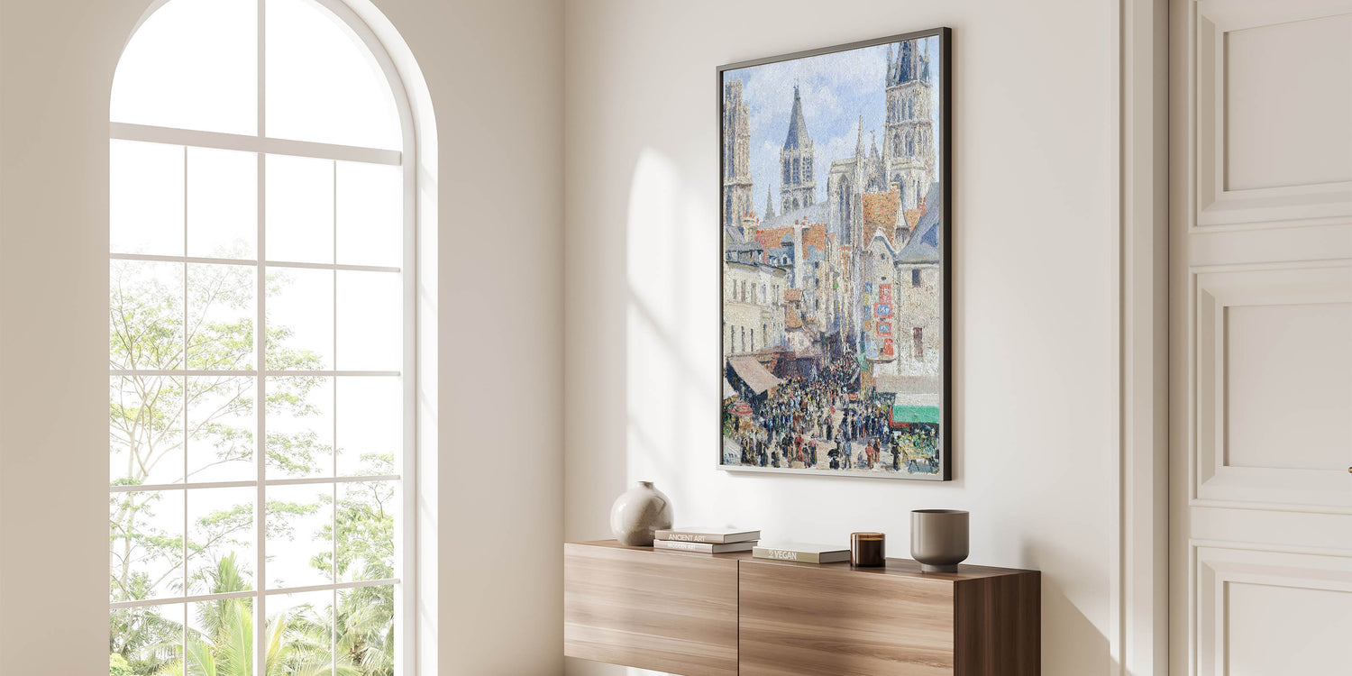 Bring the bustling charm of 19th-century France to your decor with Camille Pissarro's Grocery Street, Rouen (1898). This Impressionist masterpiece beautifully captures the vibrant energy of a market street in Rouen, framed by the towering cathedral spires in the background. Pissarro’s unique use of light and color conveys the lively movement of the crowd, creating a dynamic and inviting atmosphere.