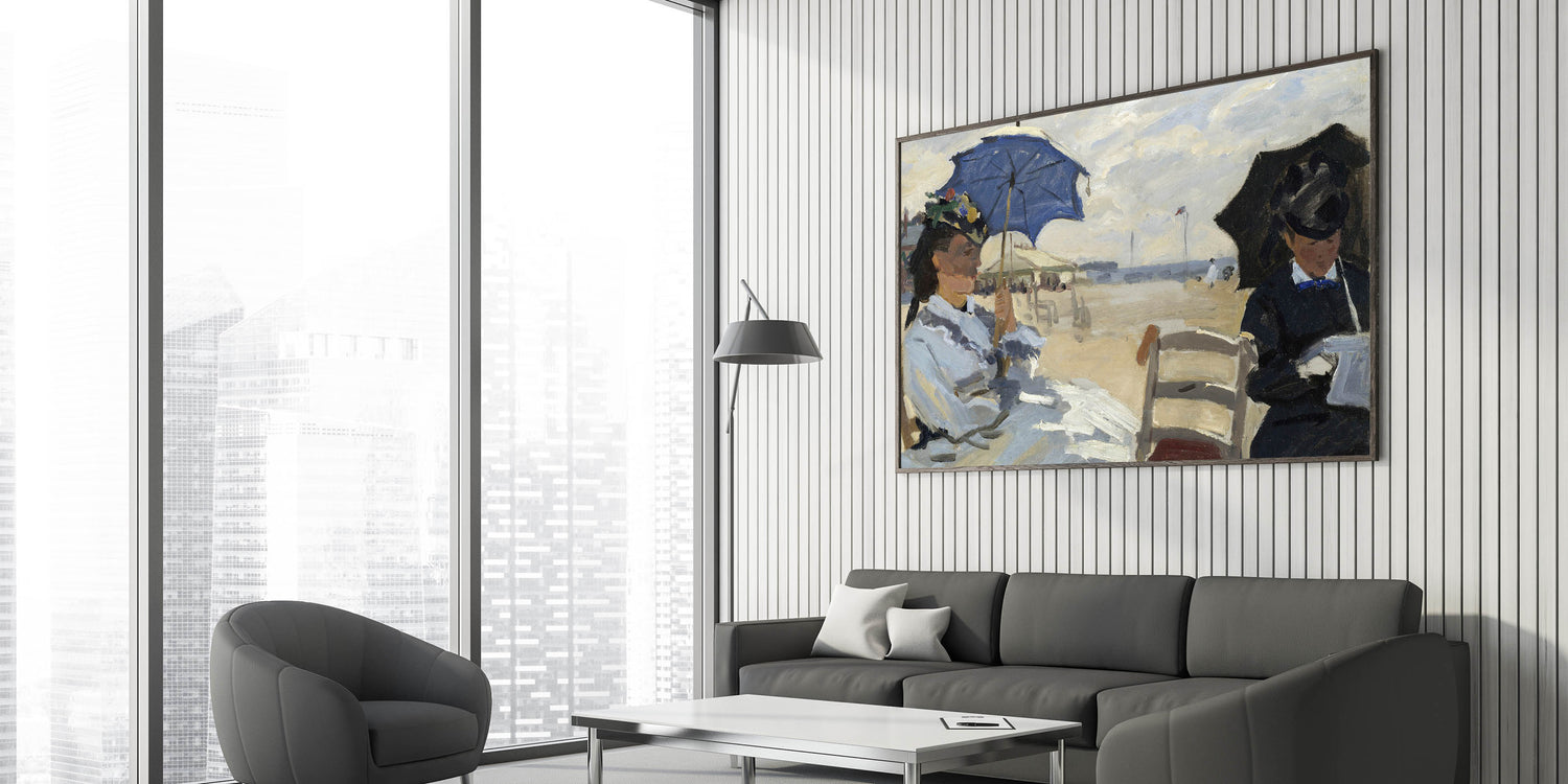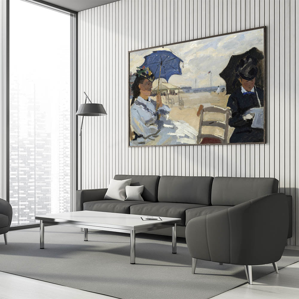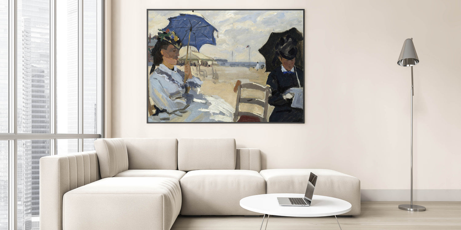 Add a touch of seaside elegance to your decor with this Impressionist wall art inspired by Claude Monet's The Beach at Trouville. This painting captures two women seated on a beach, shaded by umbrellas and enjoying a tranquil day by the sea. Monet’s expressive brushstrokes and subtle color palette evoke the breezy atmosphere of the coast, making this piece a perfect addition for beach lovers and art enthusiasts alike.