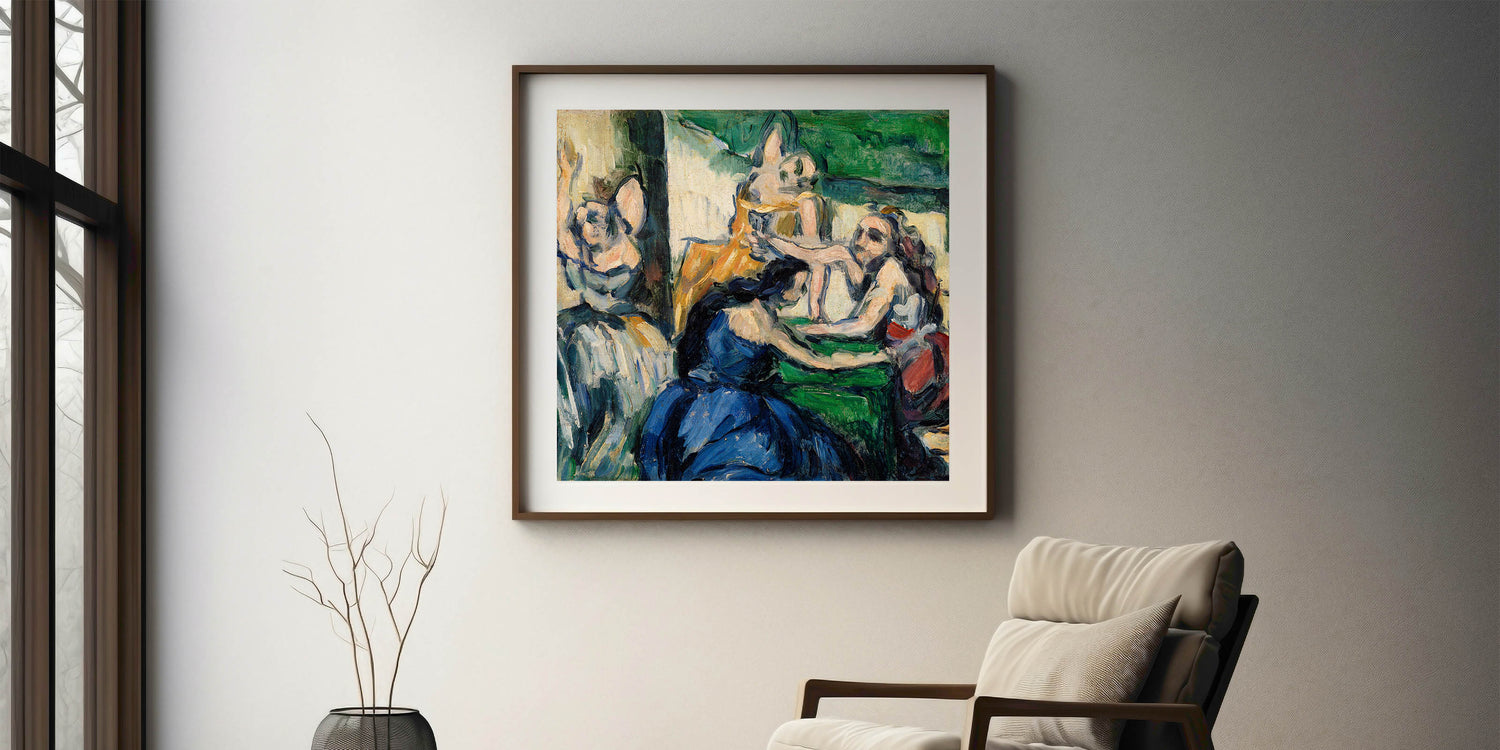 Add a striking piece of art history to your collection with this vivid Impressionist wall art by Paul Cézanne. Titled "The Courtesans," this painting showcases Cézanne's bold brushstrokes and dramatic use of color to capture an intimate and expressive scene. The interplay of deep blues, greens, and warm tones creates a compelling visual experience that evokes both emotion and movement.